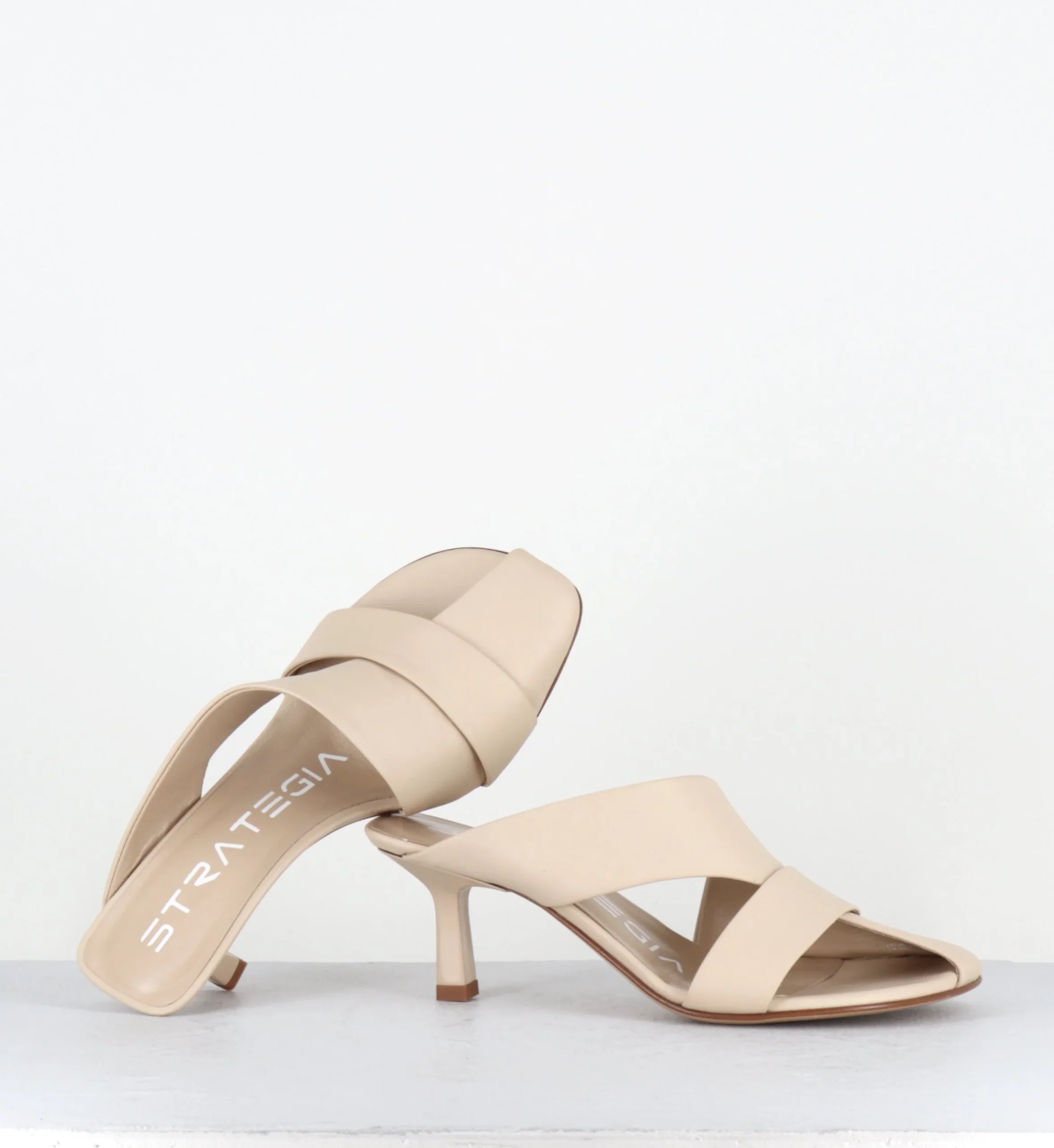 Sandales – mules en cuir beige, bout carré arrondi, découpe asymétrique semi-couvrante, montées sur un talon structuré Fabrication Artisanale Italienne – Ateliers Stategia Chausse légèrement grand