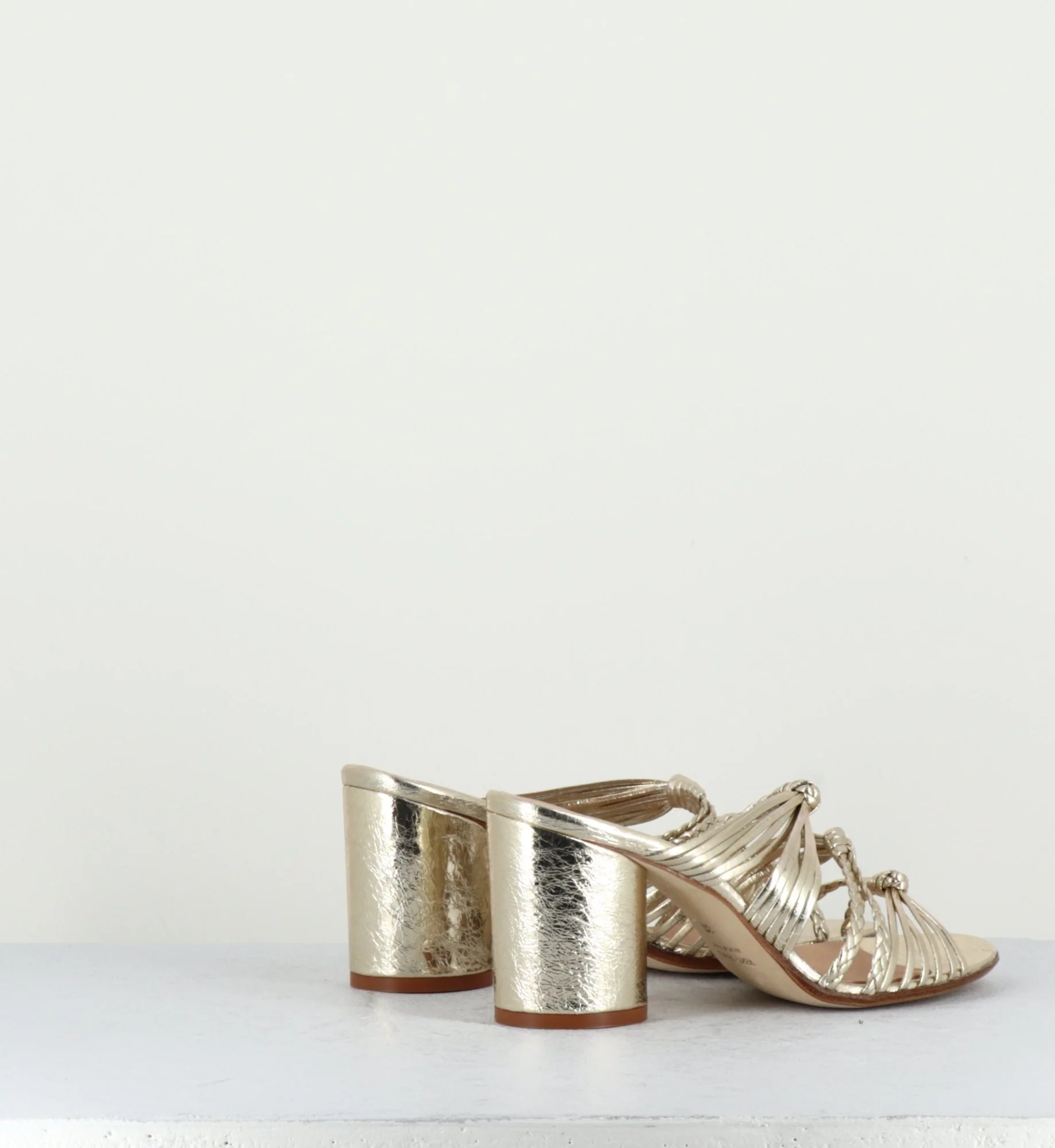 Mules – Sandales en cuir métallisé or-platine, bout arrondi, lanières de cuir finement tressées, montées sur un talon cylindrique recouvert. Fabrication Artisanale Italienne Chausse légèrement grand