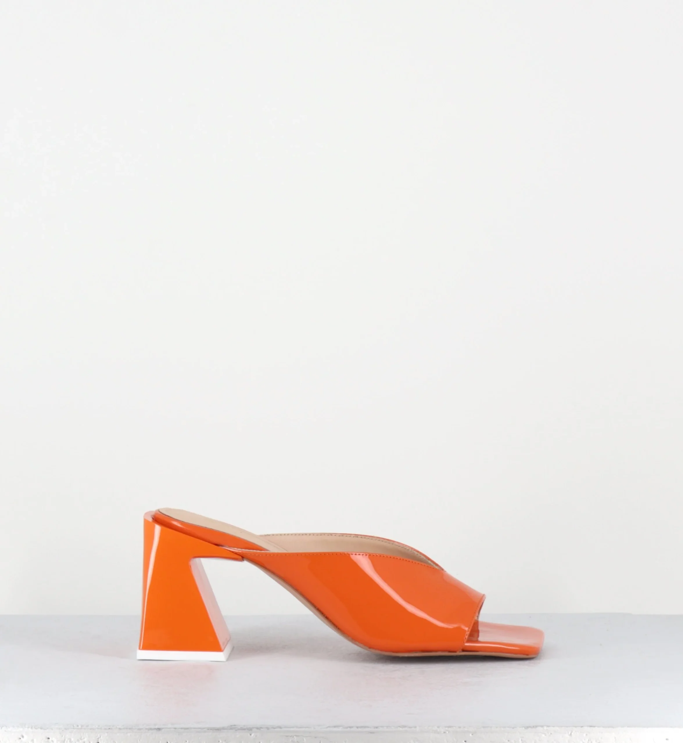 Mules en cuir vernis orange, élégante découpe, bout carré esprit années 90, montées sur un talon bloc stylisé en plexi ton sur ton