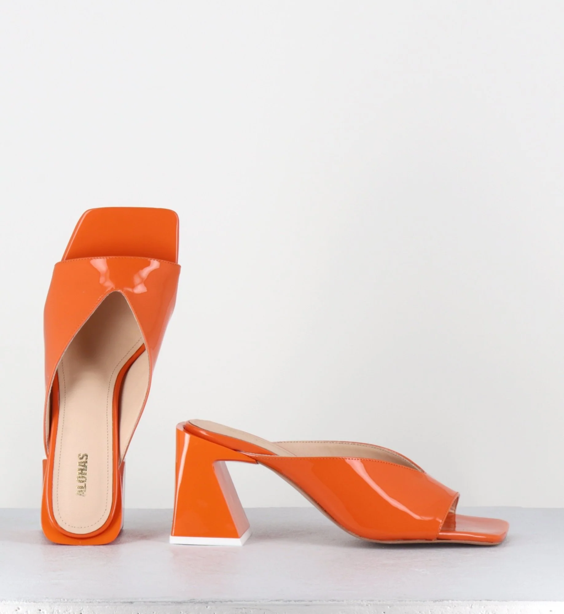 Mules en cuir vernis orange, élégante découpe, bout carré esprit années 90, montées sur un talon bloc stylisé en plexi ton sur ton Fabriqué à la main au Portugal – Ateliers Alohas Chausse légèrement grand