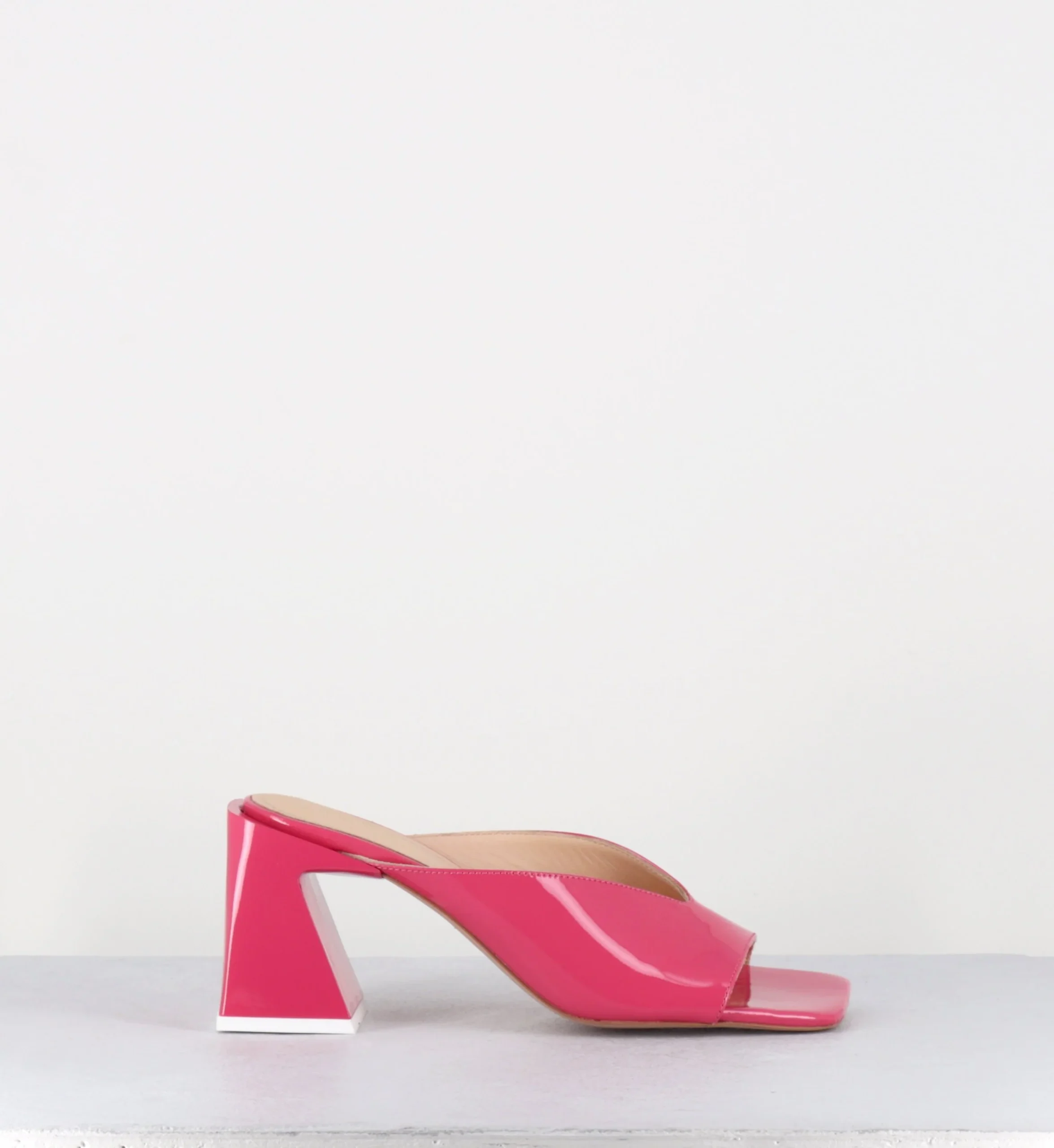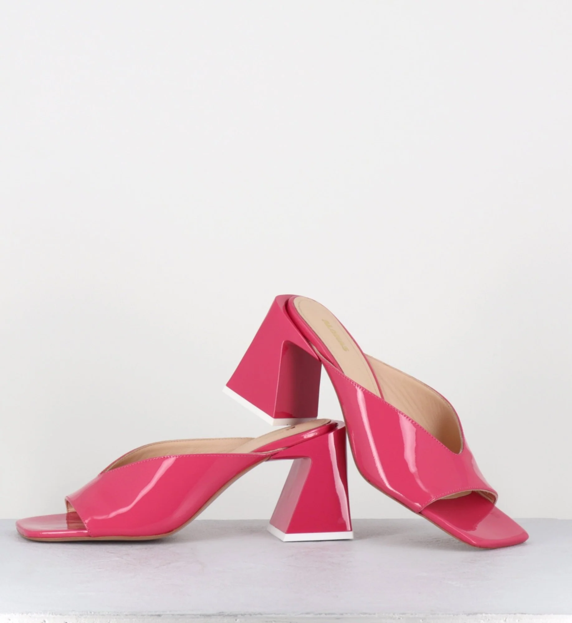 Mules en cuir vernis rose fuchsia, élégante découpe, bout carré esprit années 90, montées sur un talon bloc stylisé en plexi ton sur ton Fabriqué à la main au Portugal – Ateliers Alohas Chausse légèrement grand