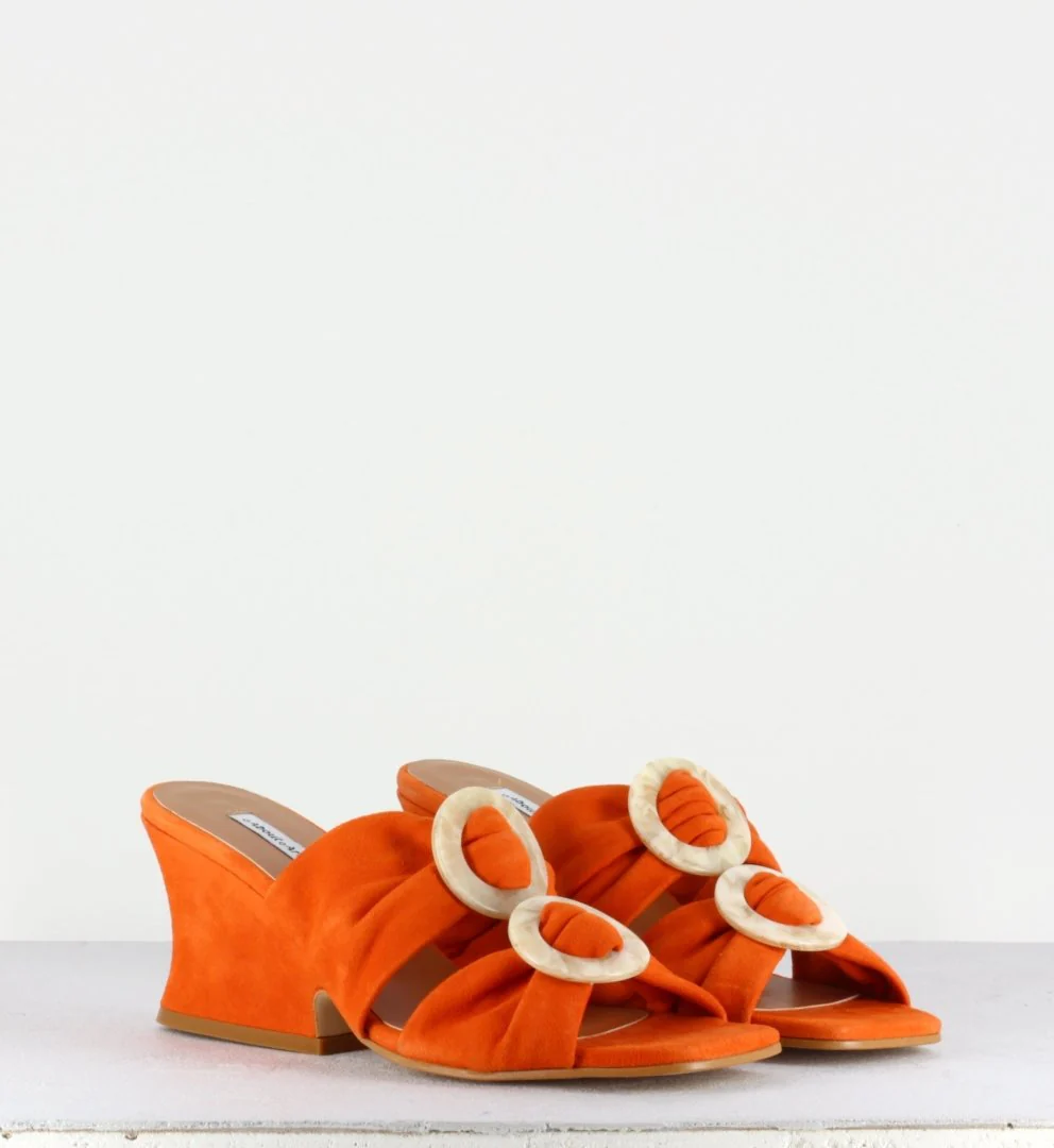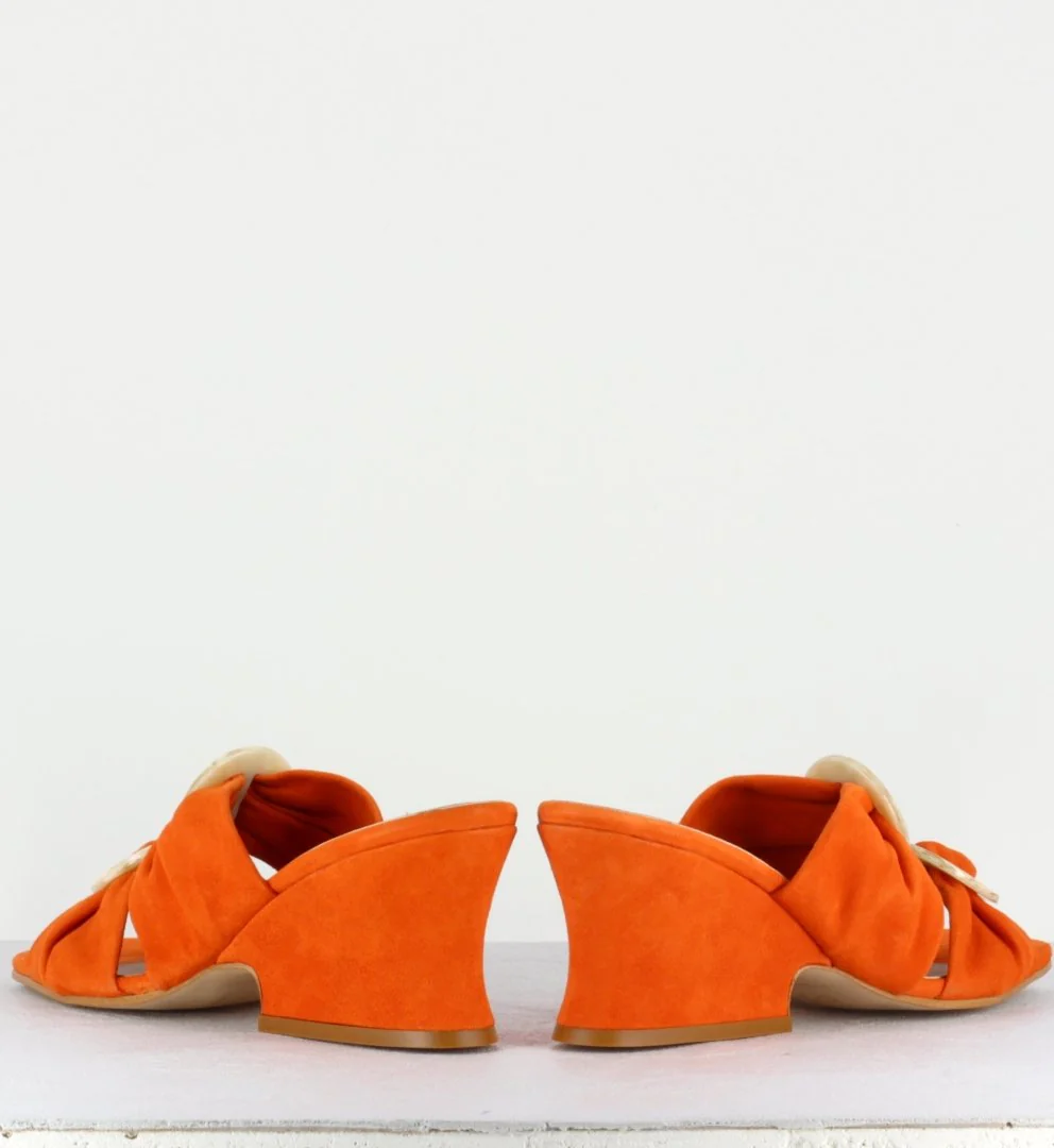 Irrésistibles mules à talon semi-compensé en daim orange et bout carré, avec ornement sur le dessus, des designers Espagnols About Arianne.