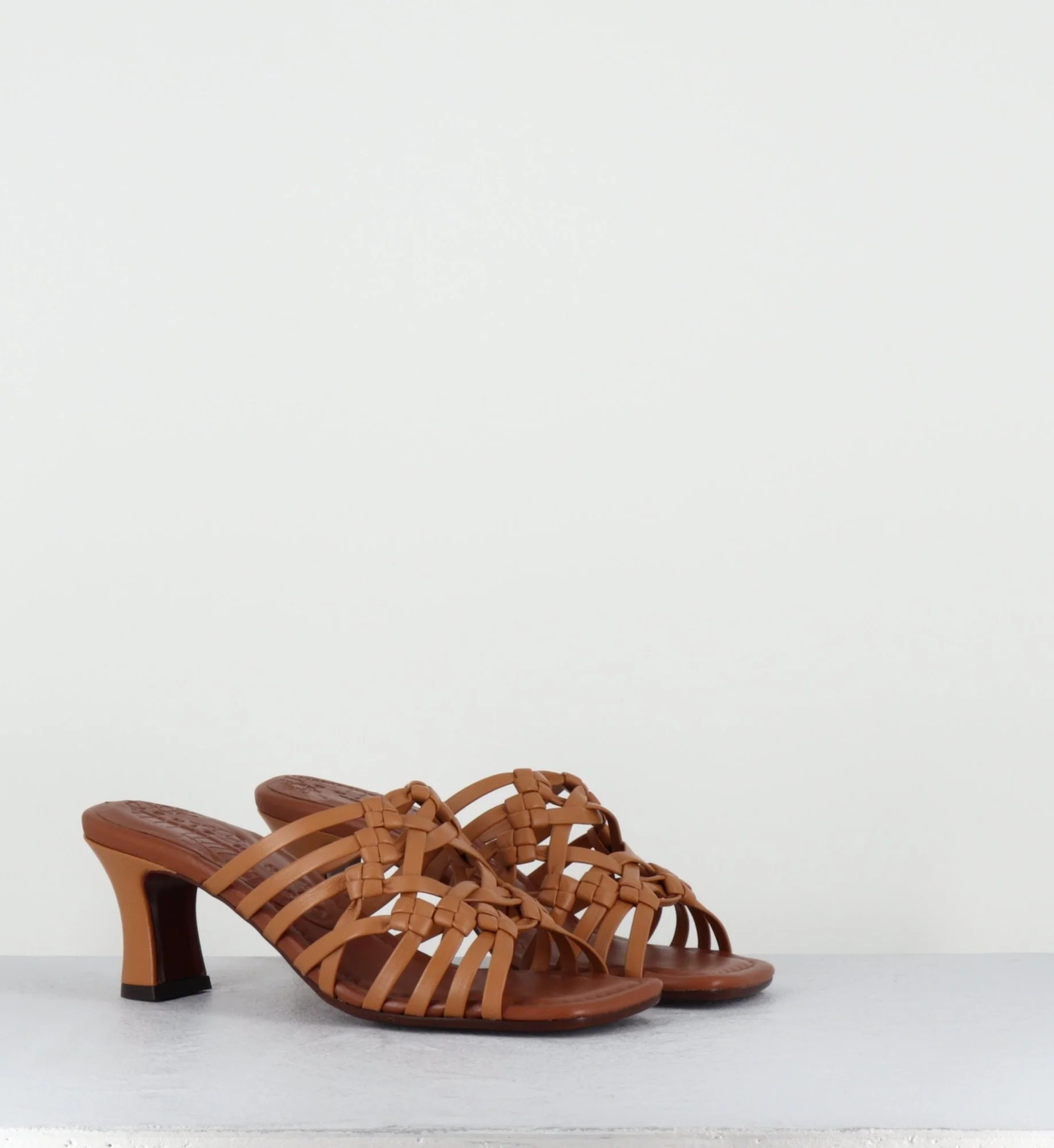 Sandales – mules en cuir tressé camel clair, bout carré soft, montées sur un petit talon rétro recouvert Fabrication Artisanale Espagnole – Ateliers Chie Mihara Chausse légèrement grand