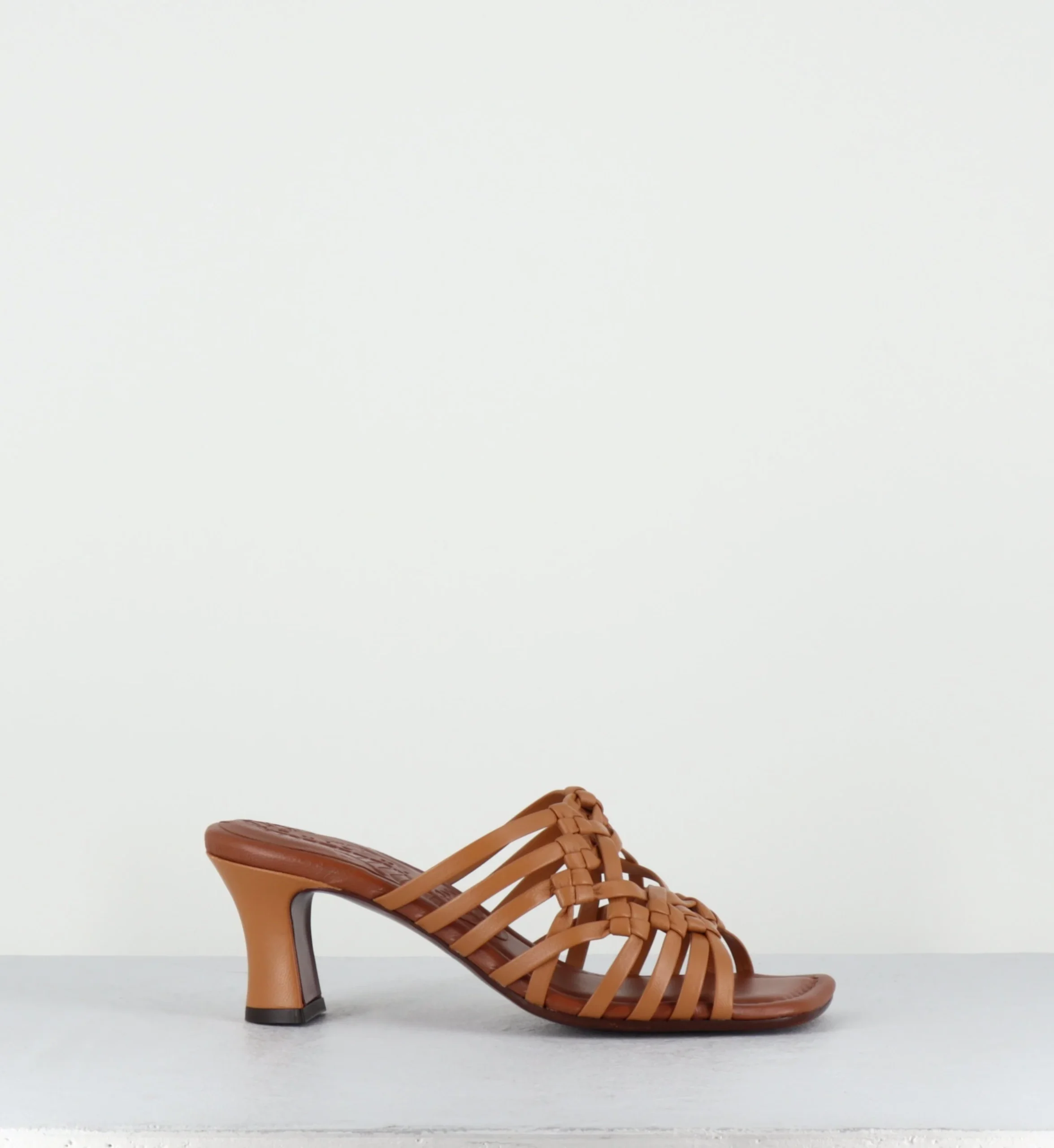 Sandales – mules en cuir tressé camel clair, bout carré soft, montées sur un petit talon rétro recouvert