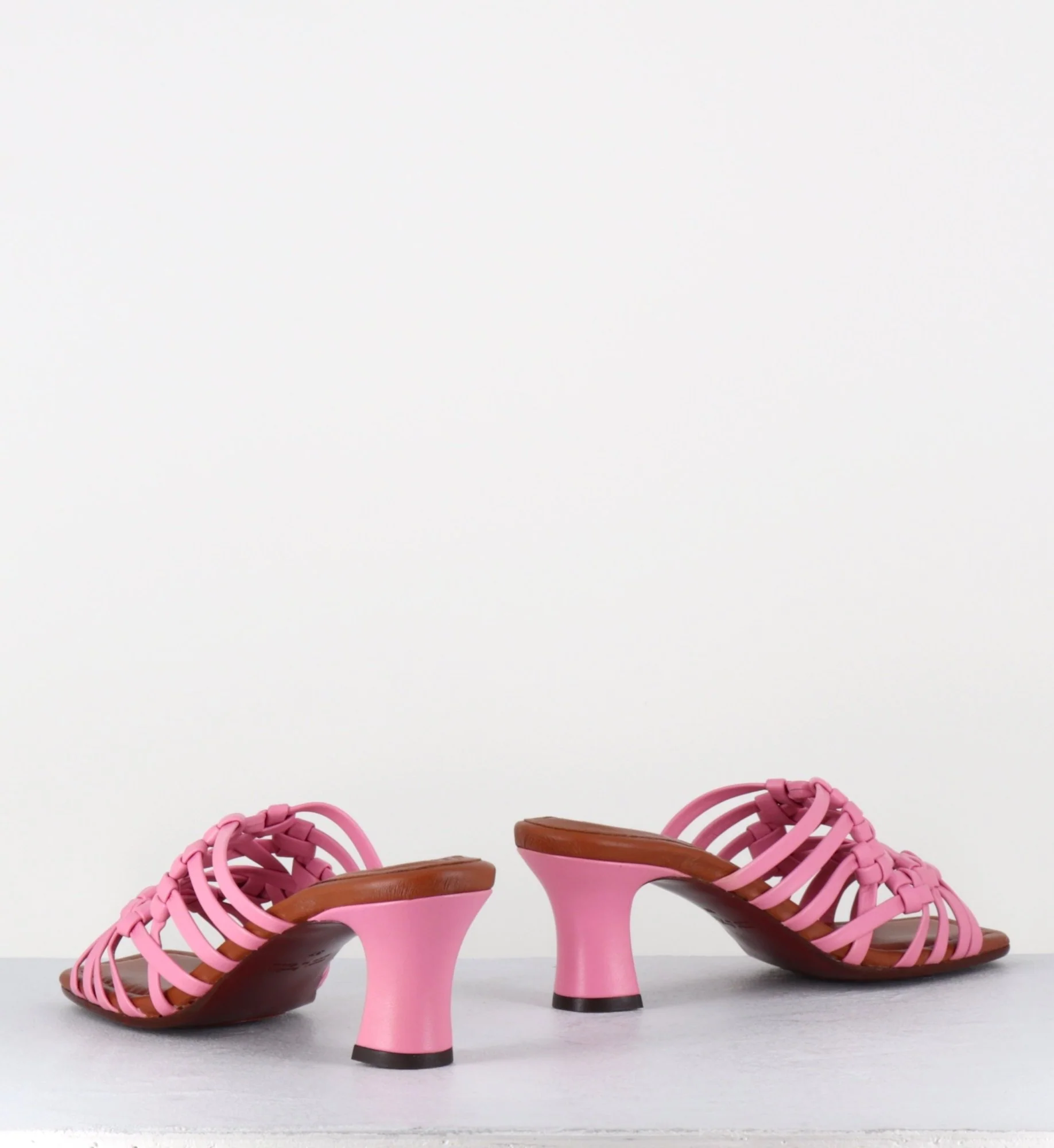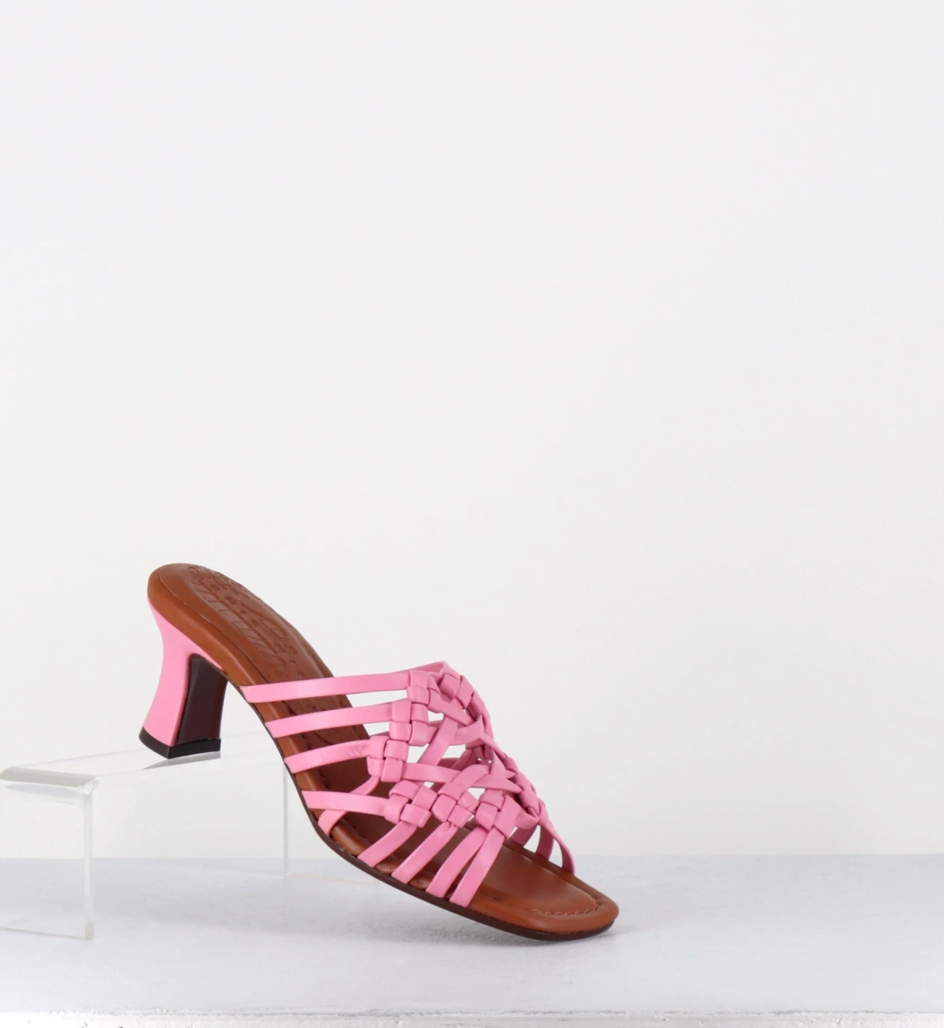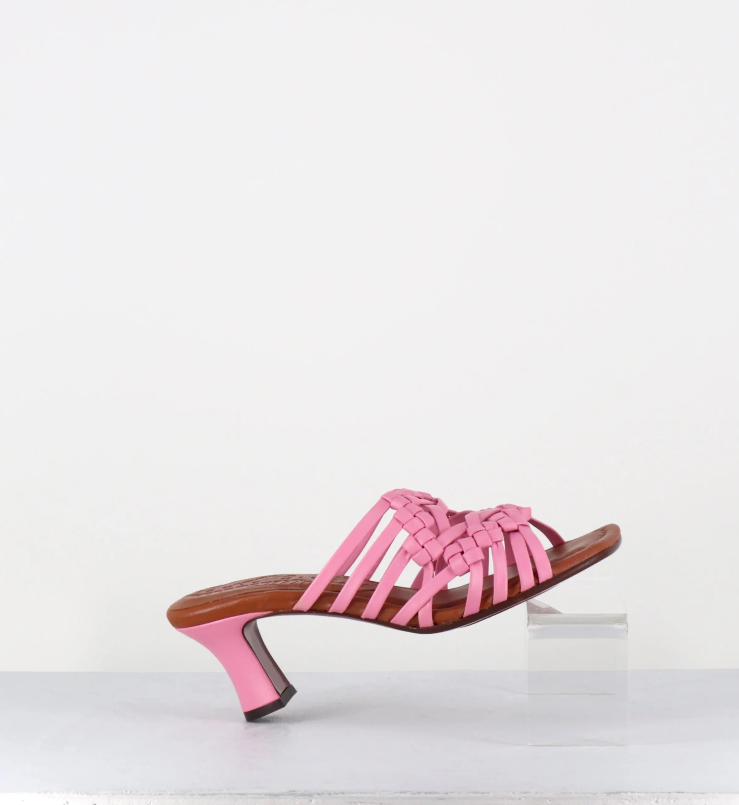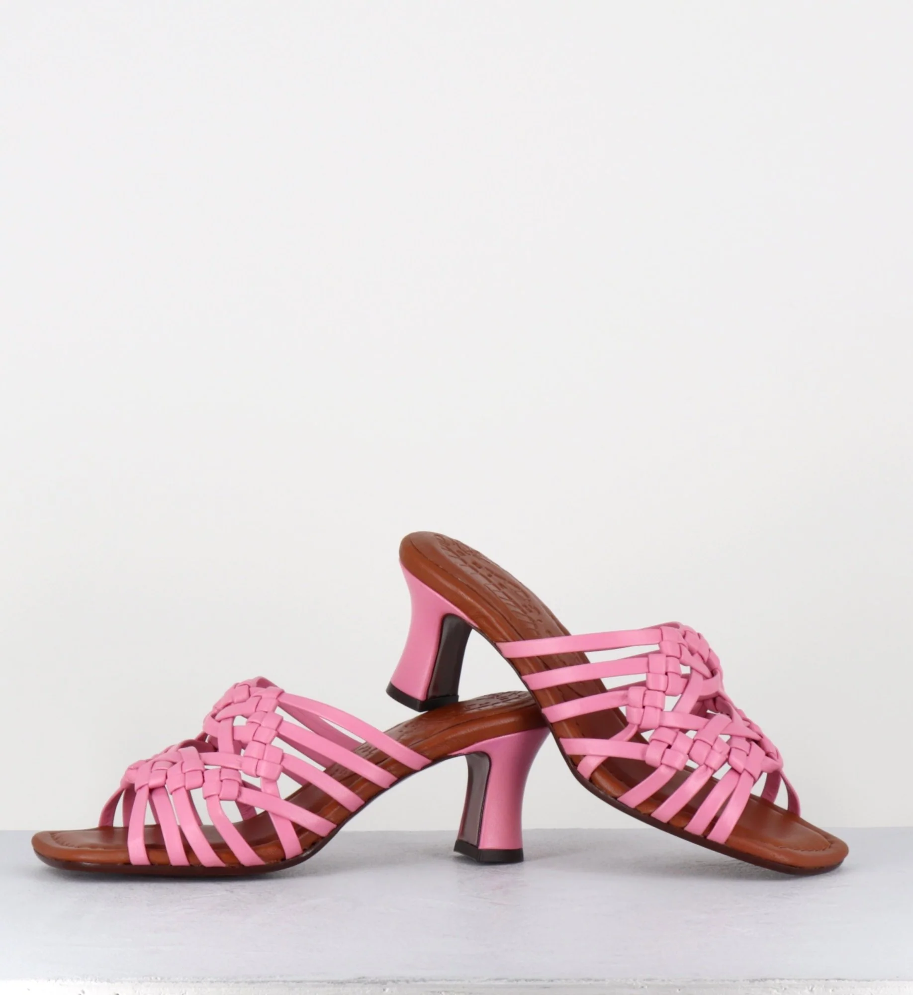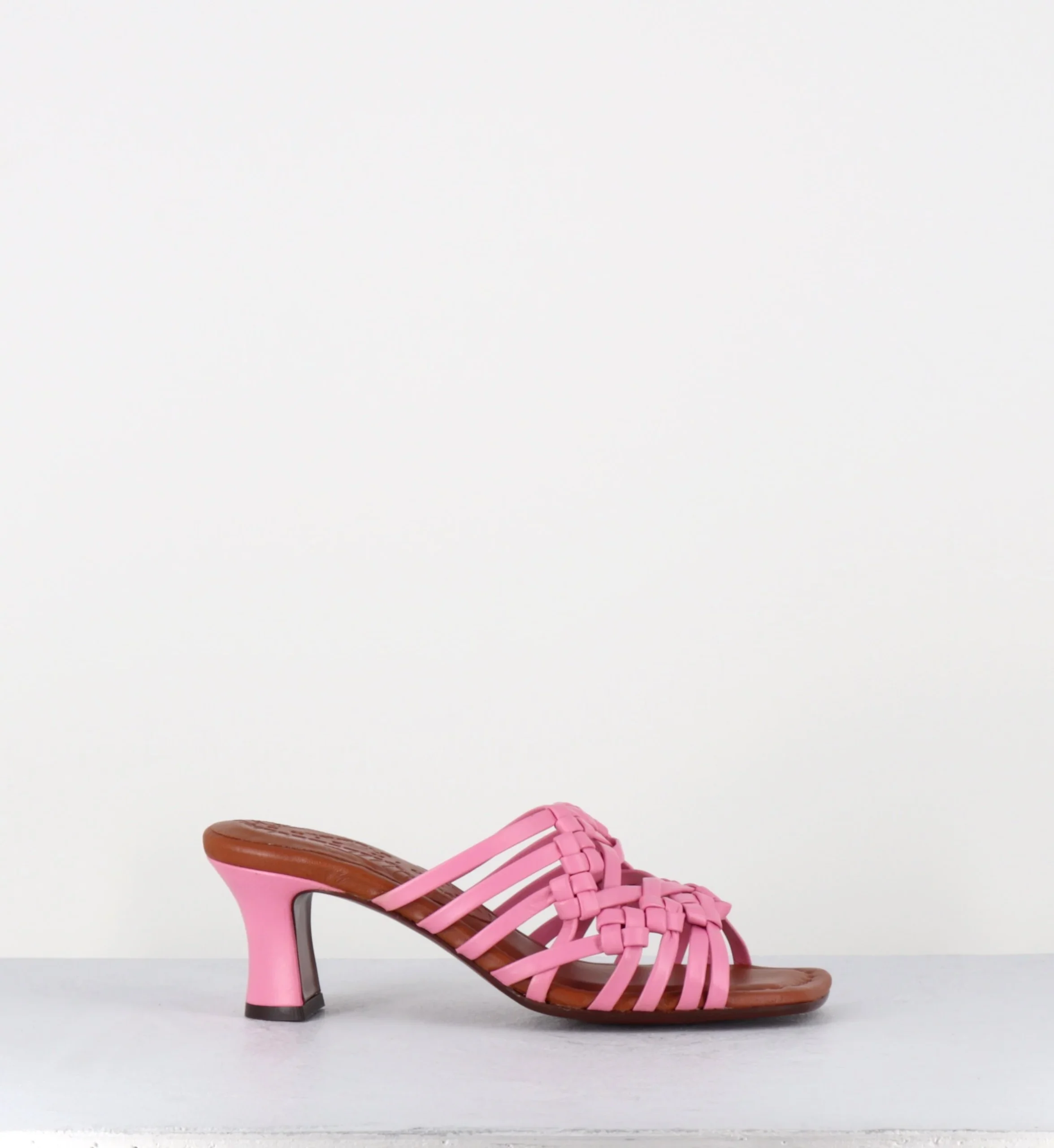 Sandales – mules en cuir tressé camel rose bonbon, bout carré soft, montées sur un petit talon rétro recouvert Fabrication Artisanale Espagnole – Ateliers Chie Mihara Chausse légèrement grand