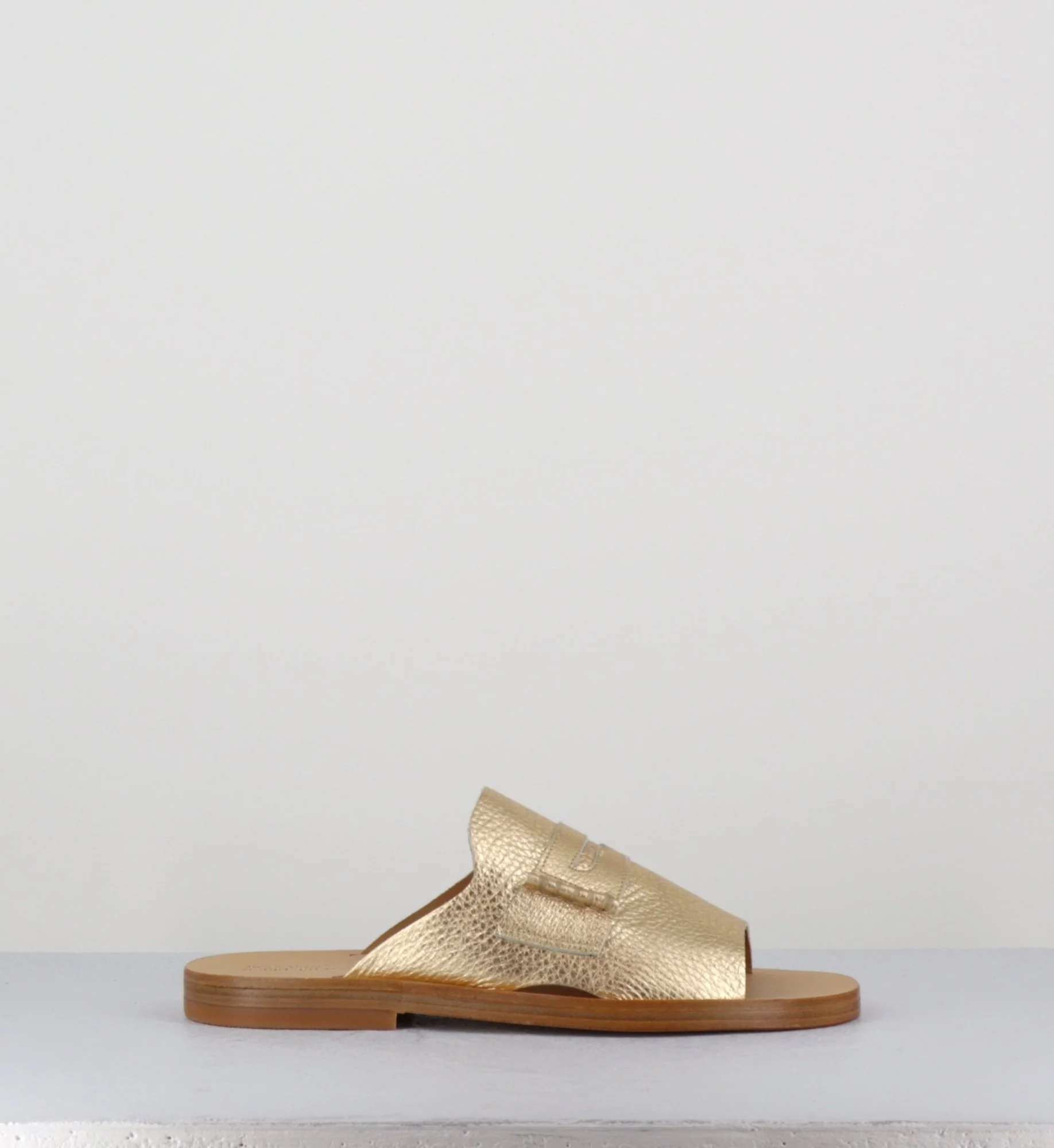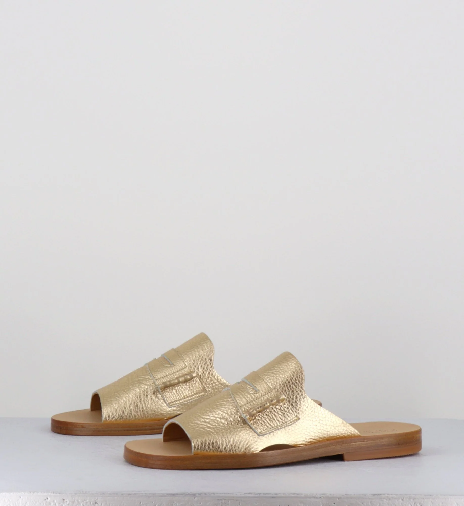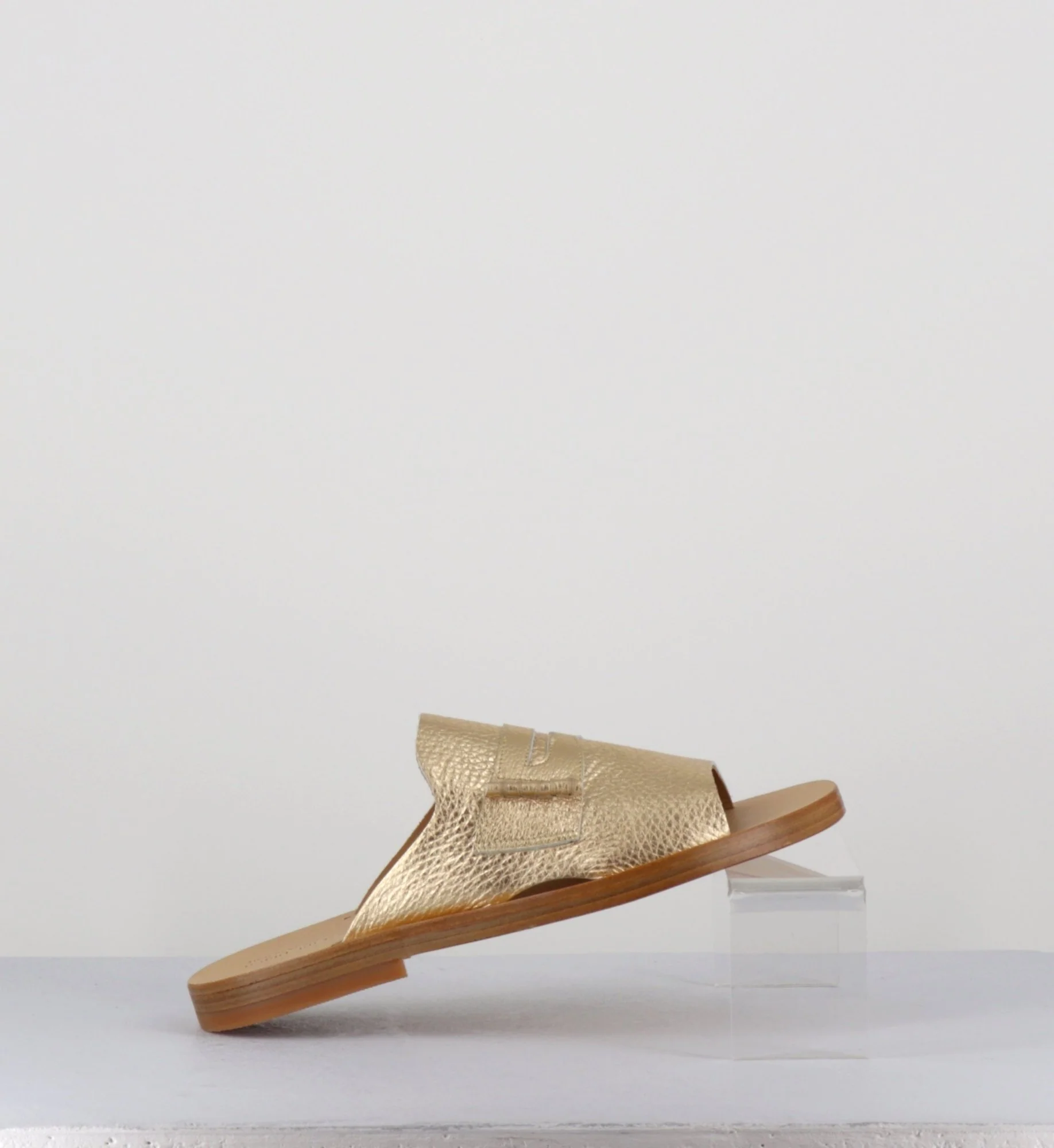 Mules-sandales plates en cuir grainé métallisé doré, ligne minimaliste. Fabrication Artisanale Italienne – Atelier ToandCo