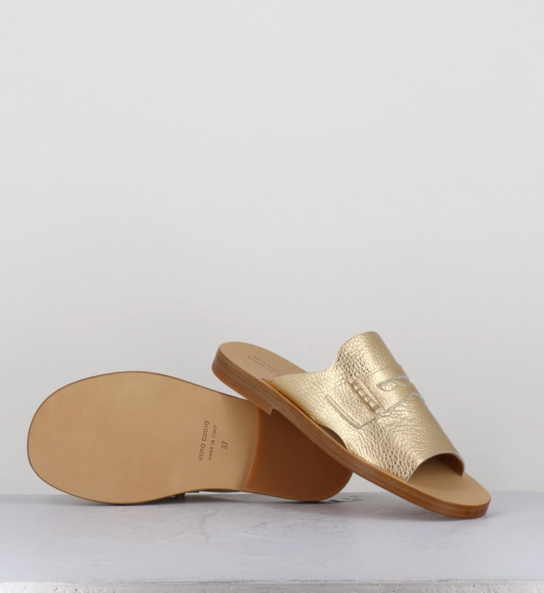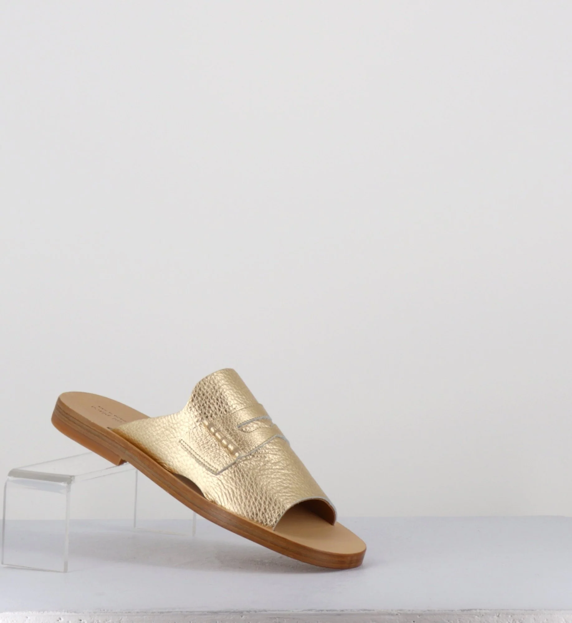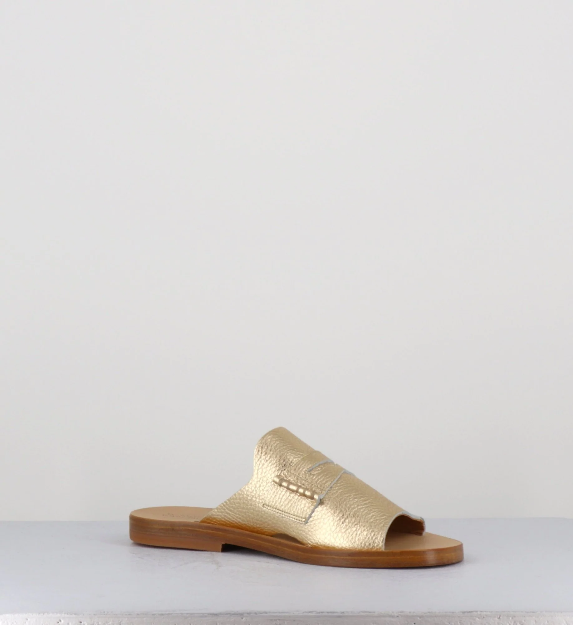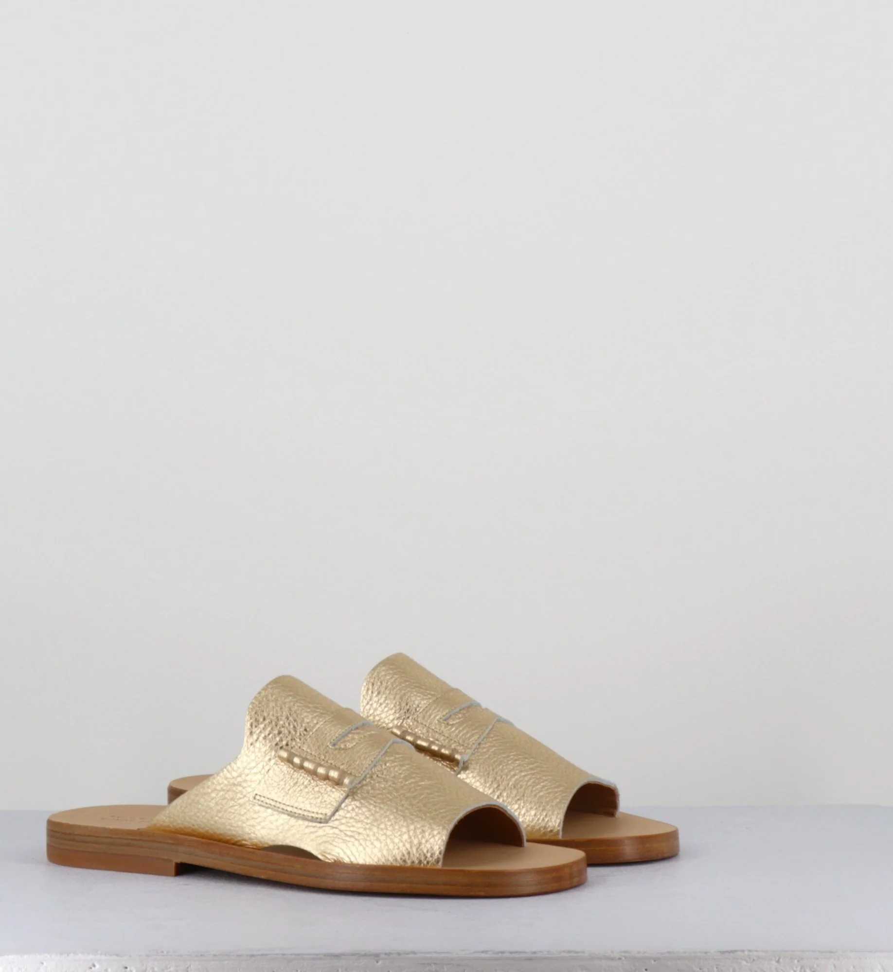 Mules-sandales plates en cuir grainé métallisé doré, ligne minimaliste. Fabrication Artisanale Italienne – Atelier ToandCo