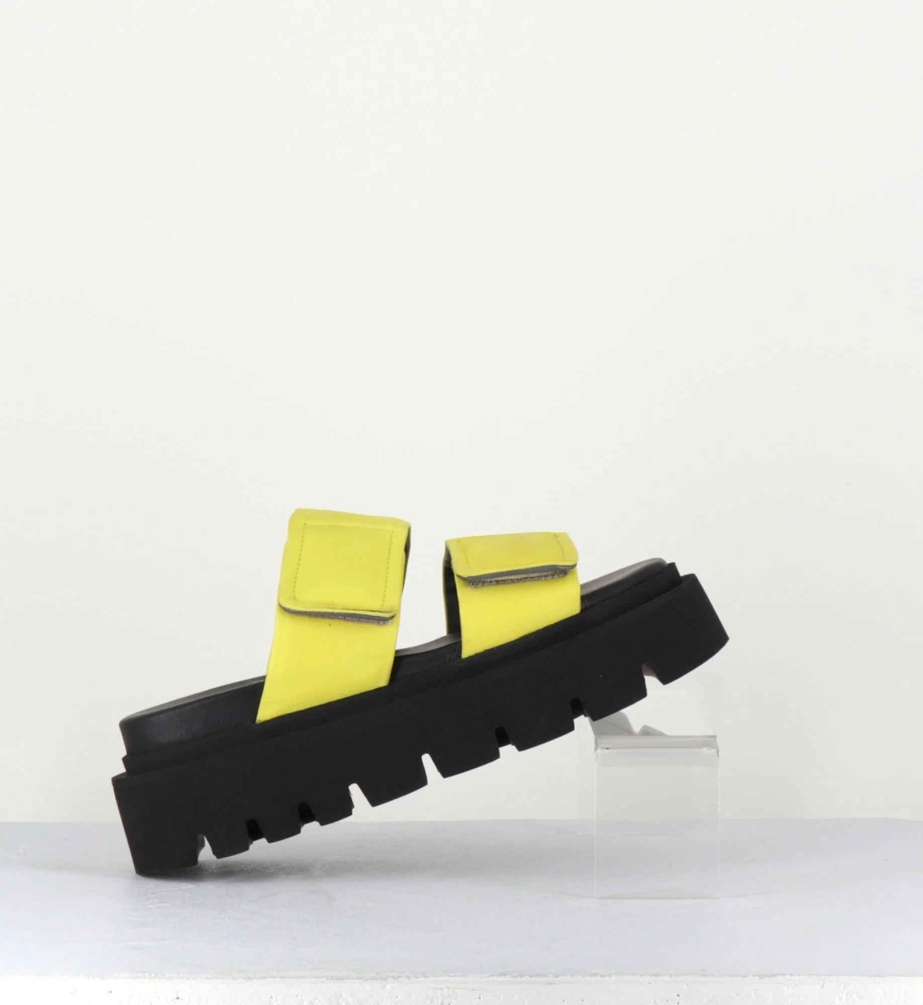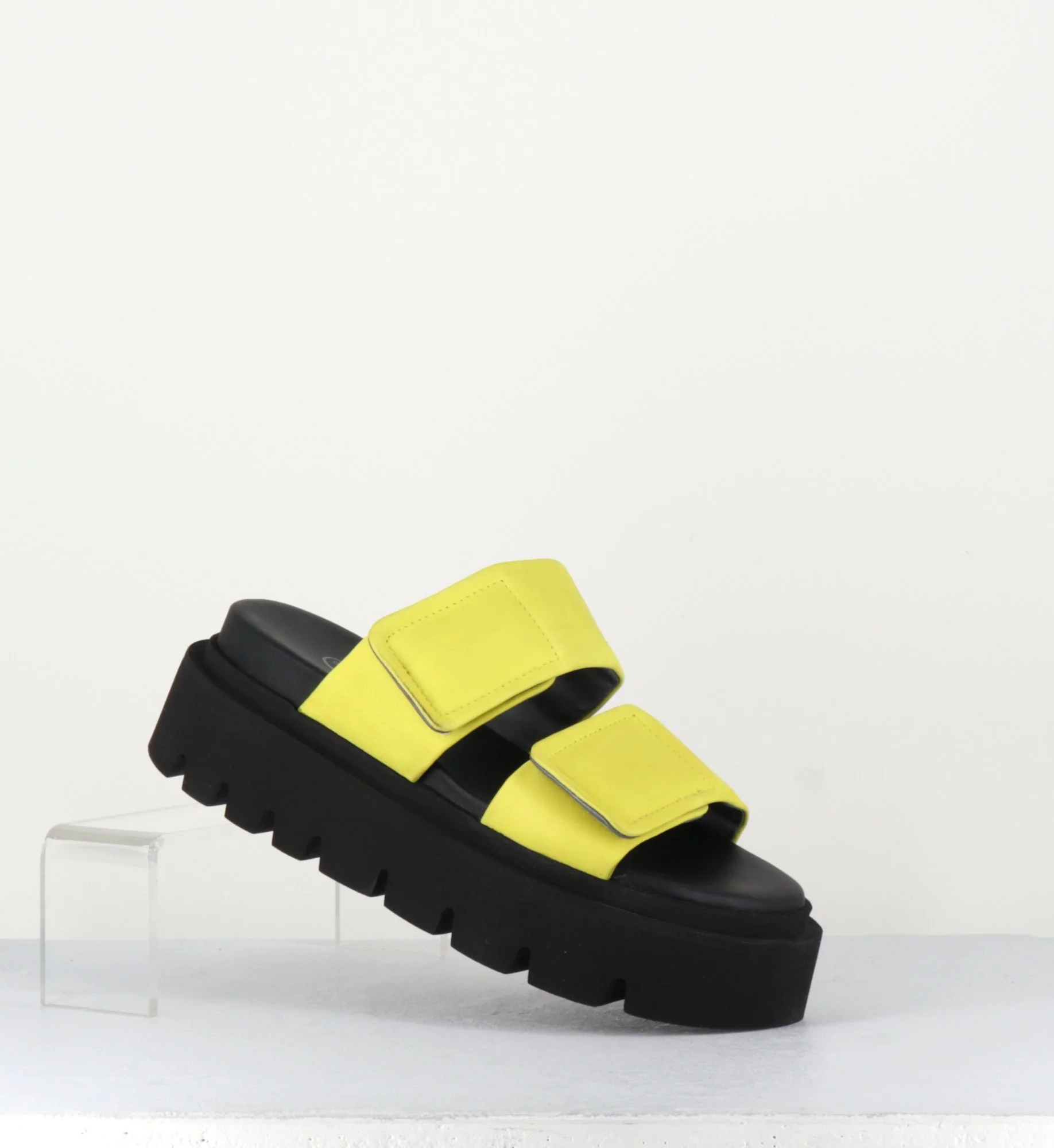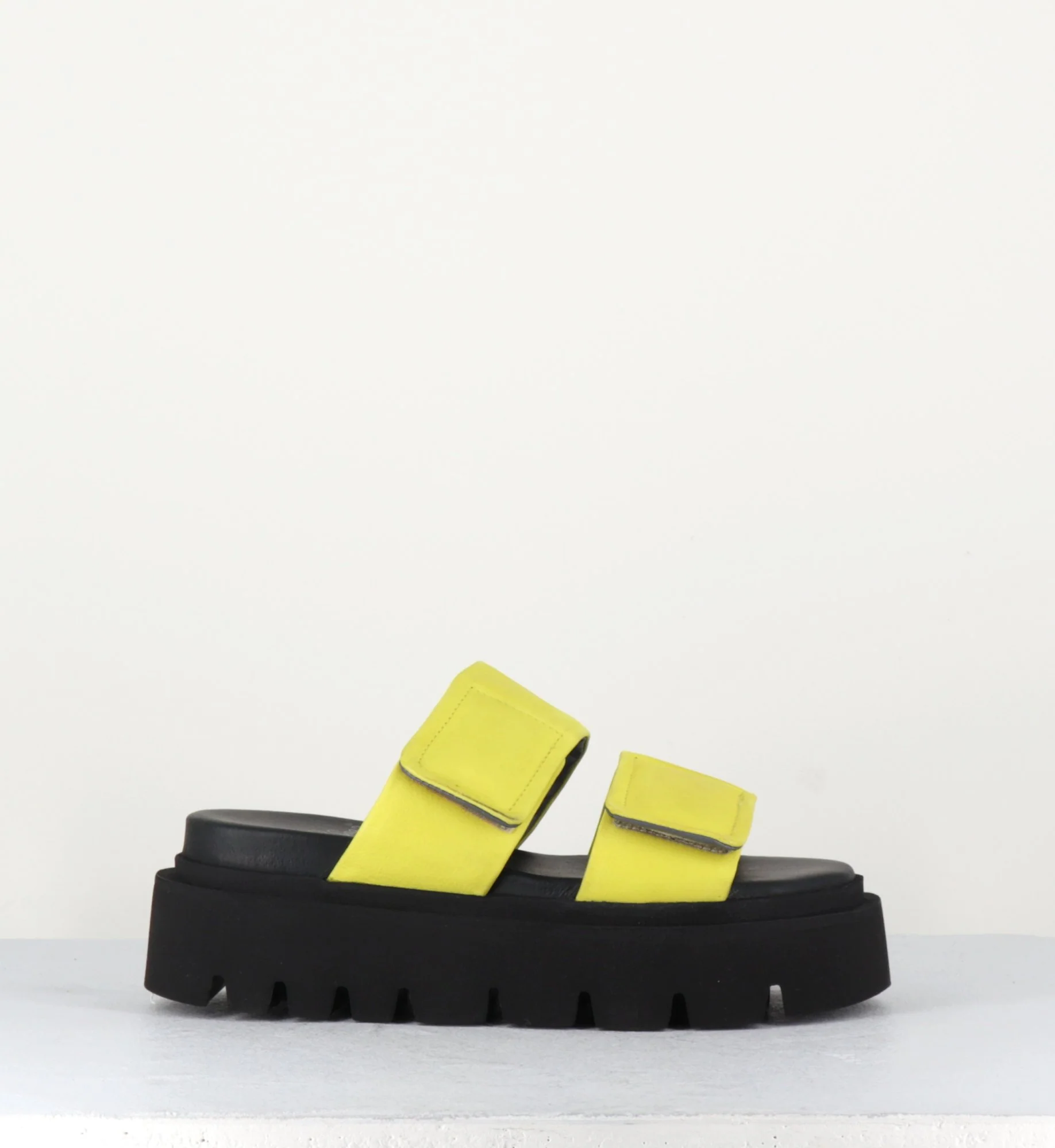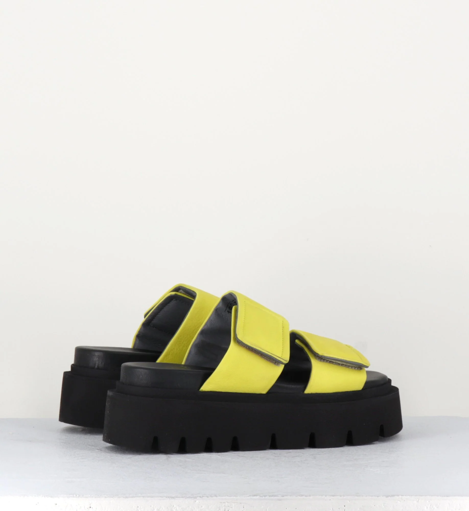 Mules sandales en cuir jaune, larges brides à scratch, bout arrondi, montées sur une semelle plateforme noire en micro fibre crantée légère et confortable.