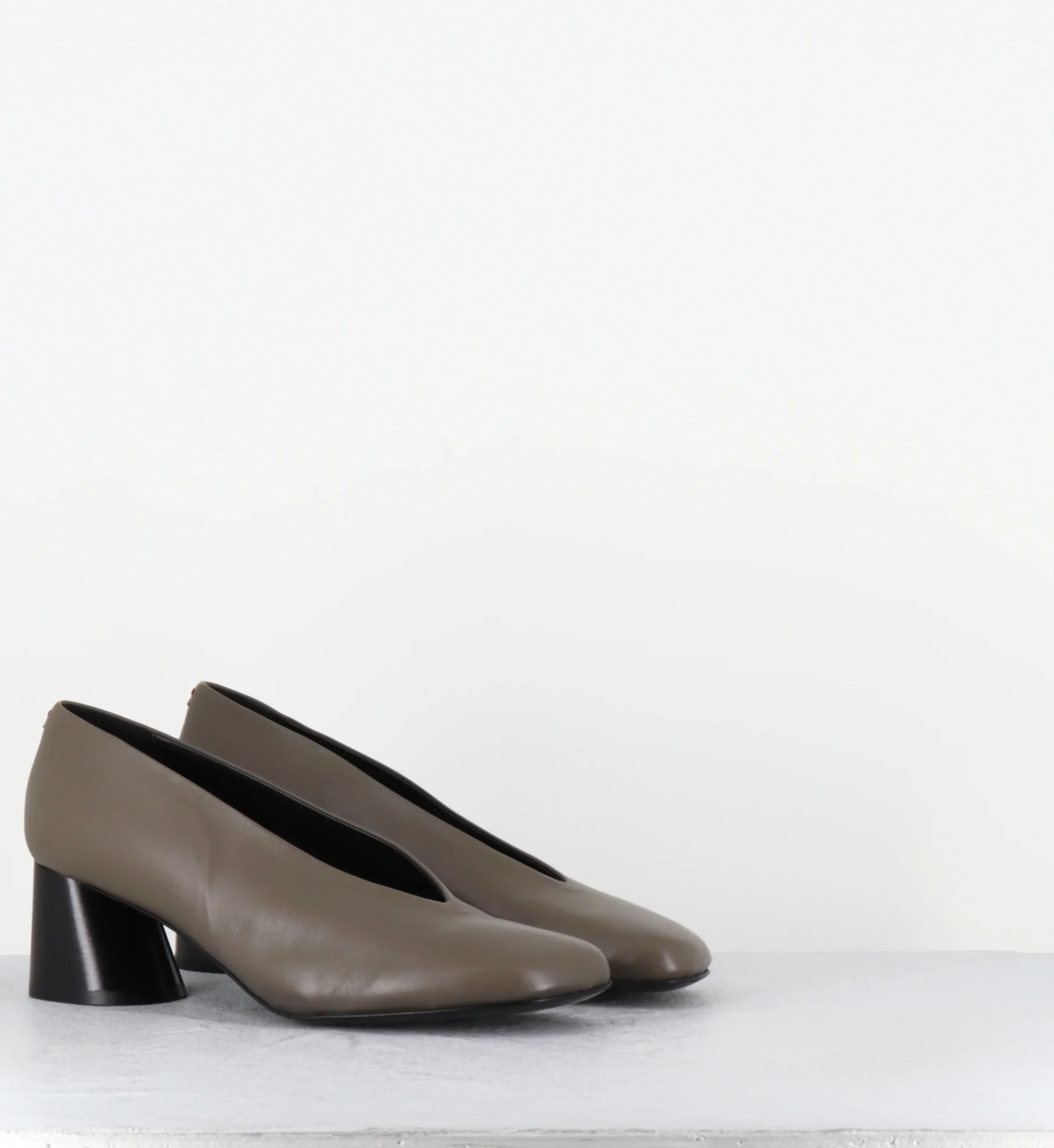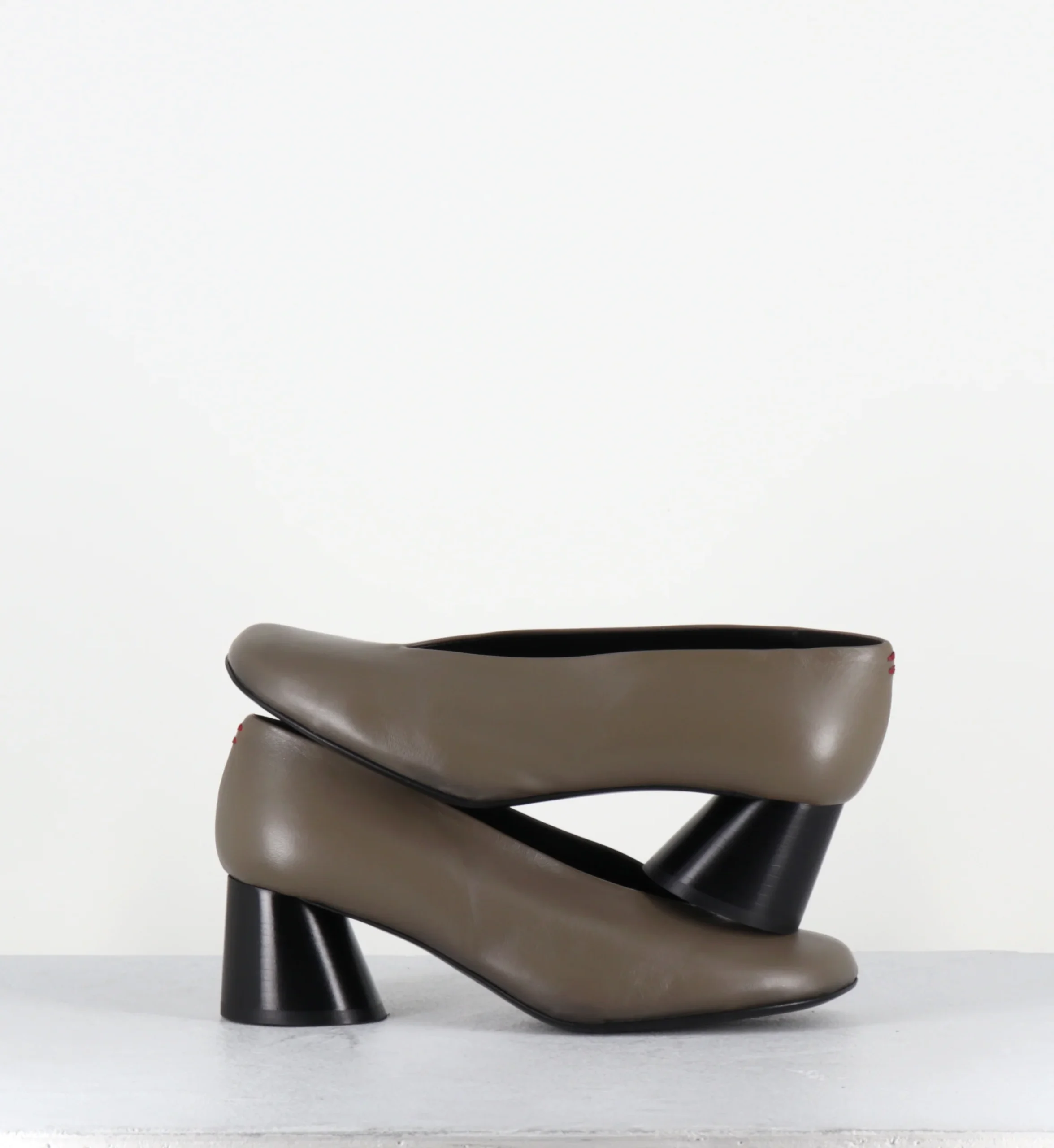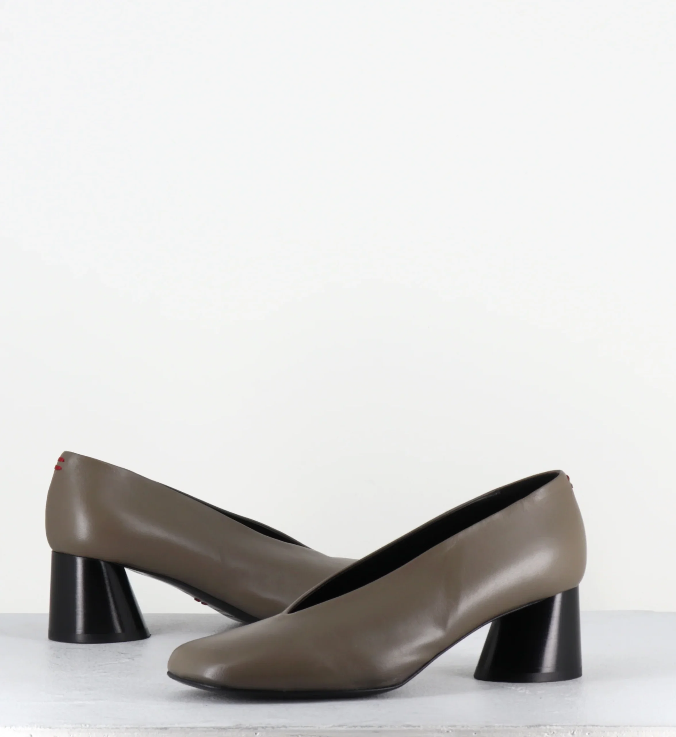 Escarpins en cuir vert khaki ultra souple, bout carré asymétrique et découpe en V, montées sur un talon à la structure légèrement évasé et peint à la main en noir.