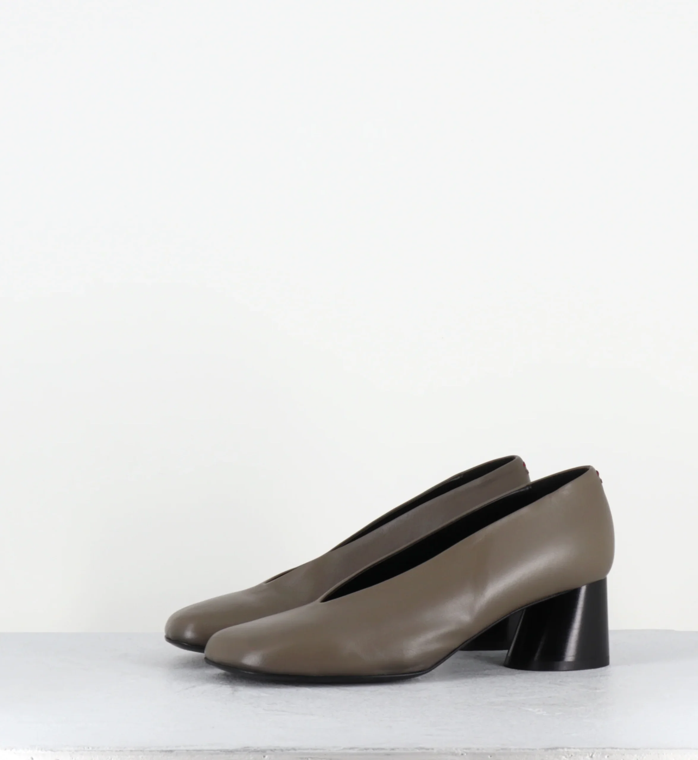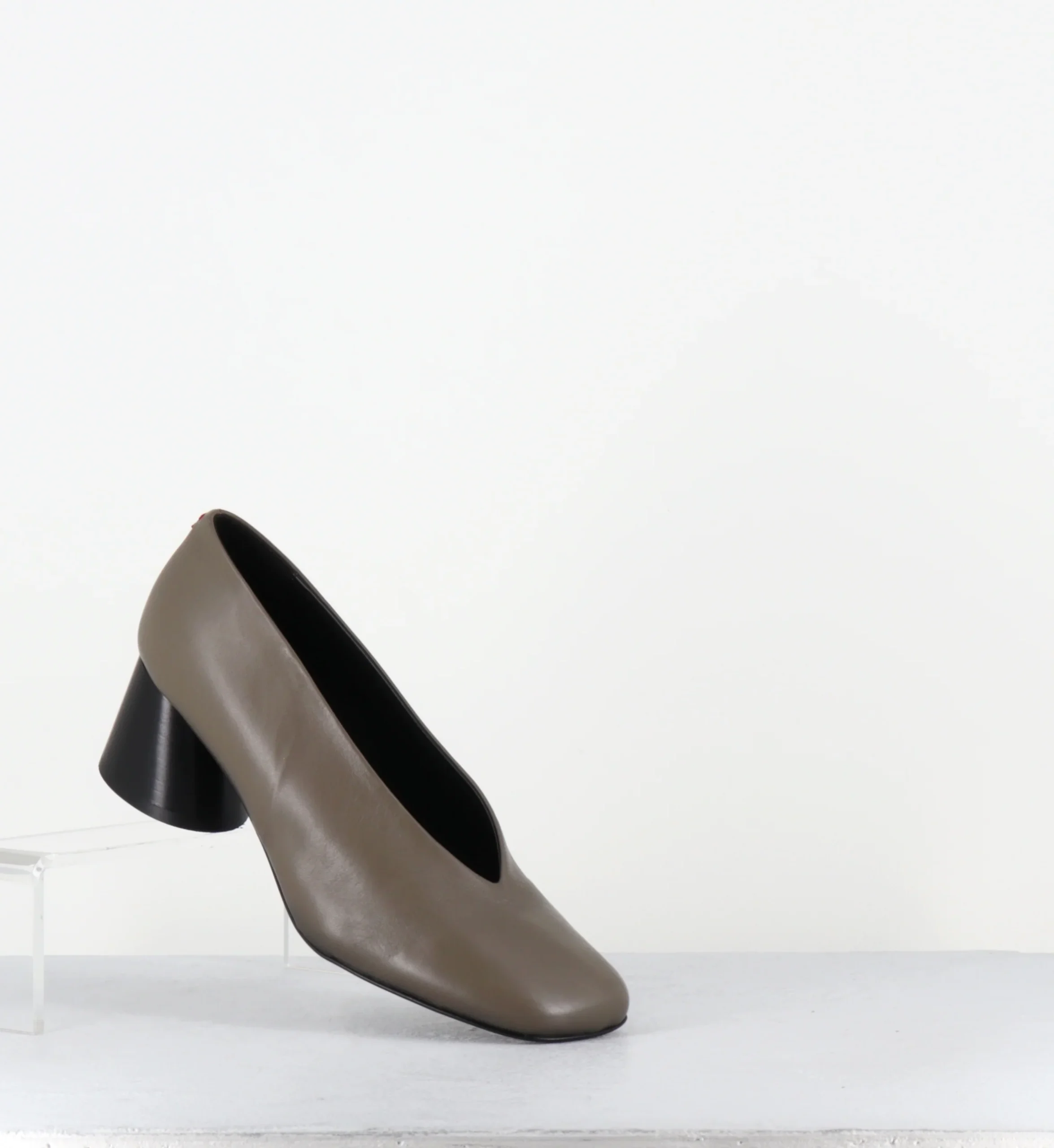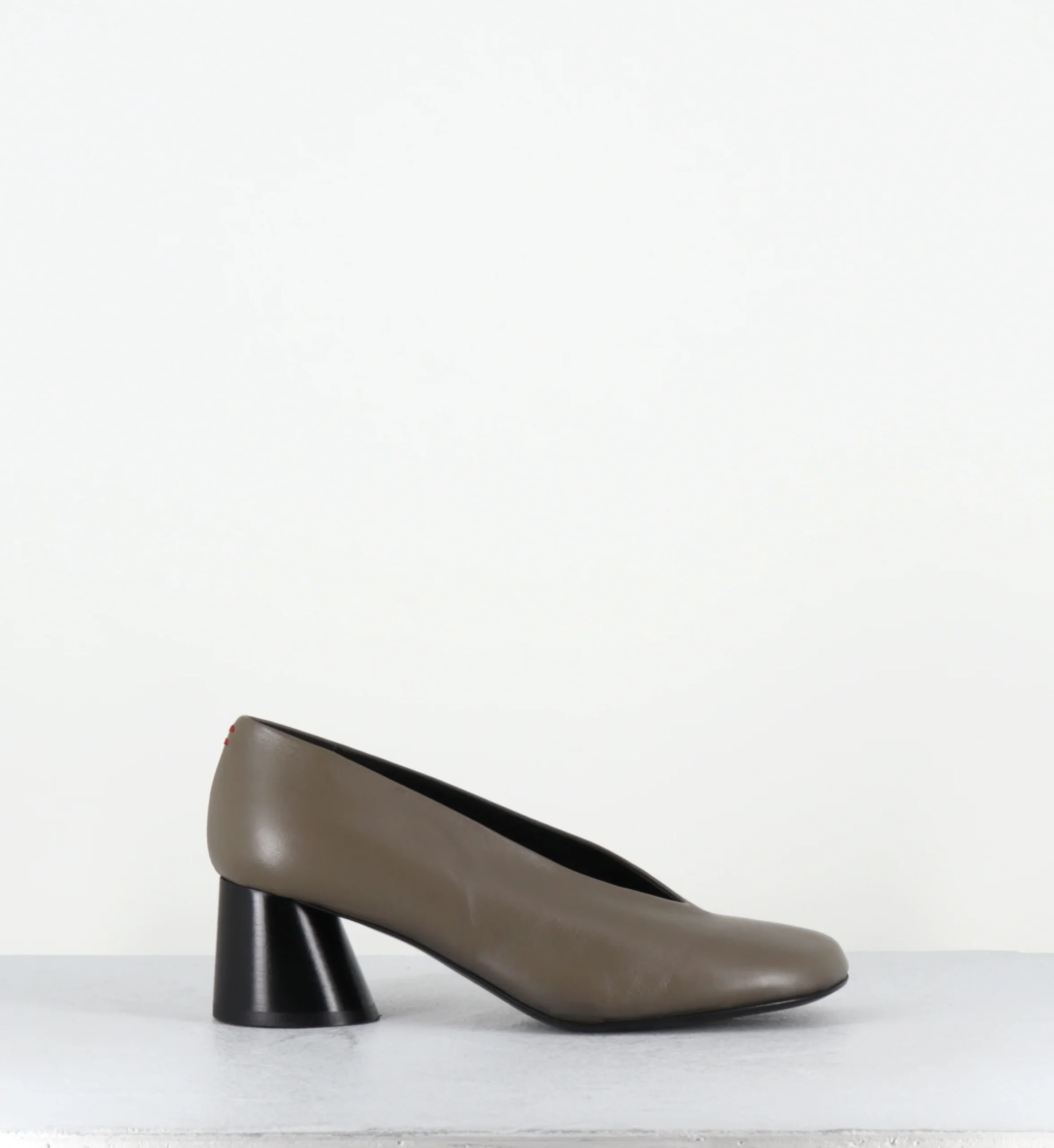 Escarpins en cuir vert khaki ultra souple, bout carré asymétrique et découpe en V, montées sur un talon à la structure légèrement évasé et peint à la main en noir.