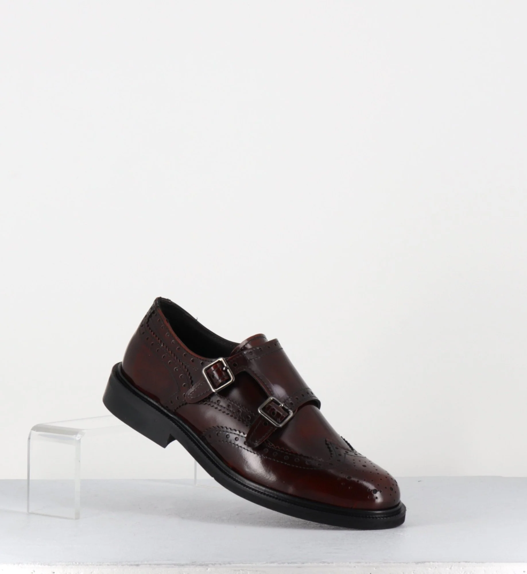 Derby oxford double-boucles réglables en cuir glacé marron avec bout fleuri Fabrication Artisanale Italienne – Ateliers GarriceLab