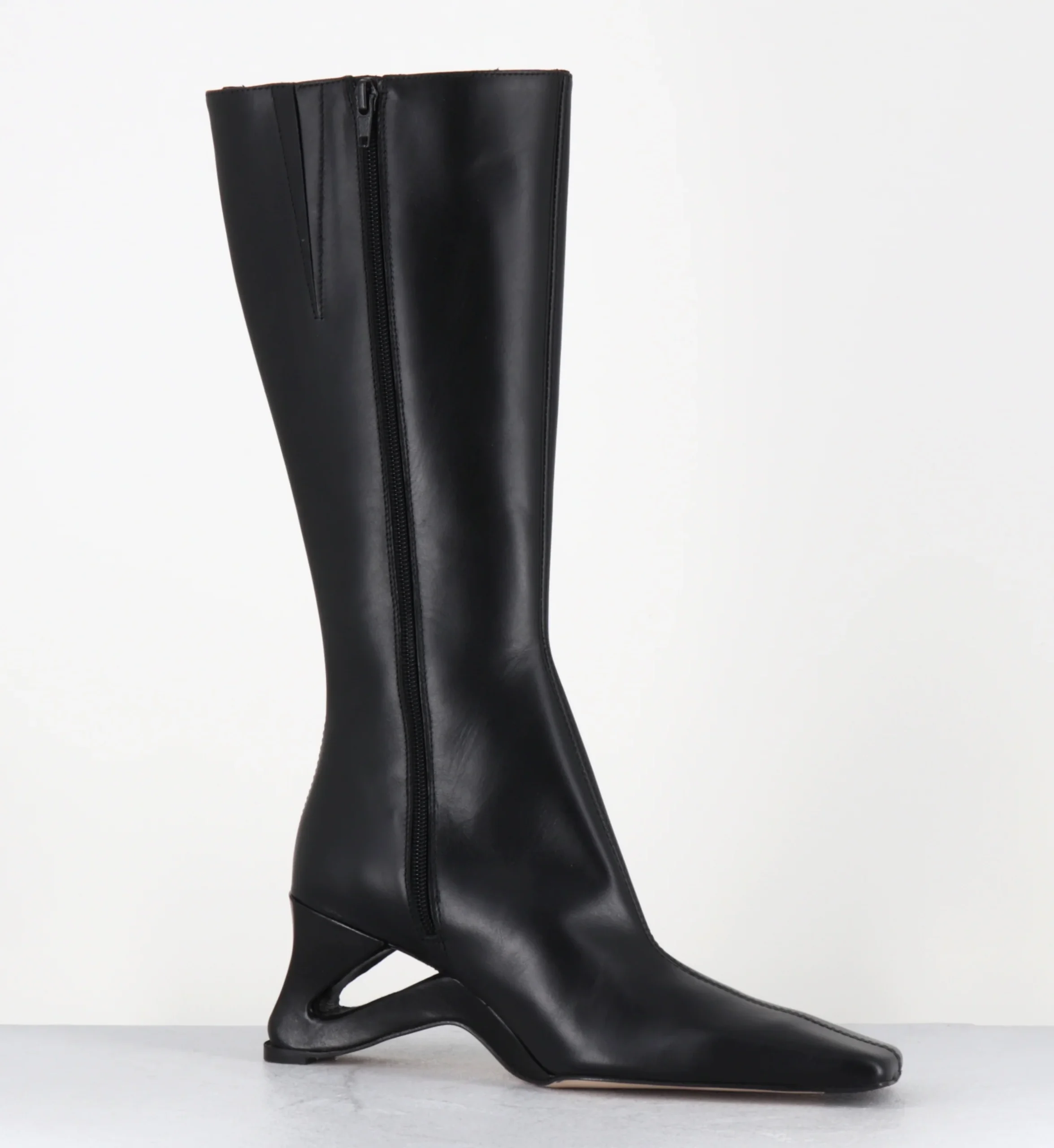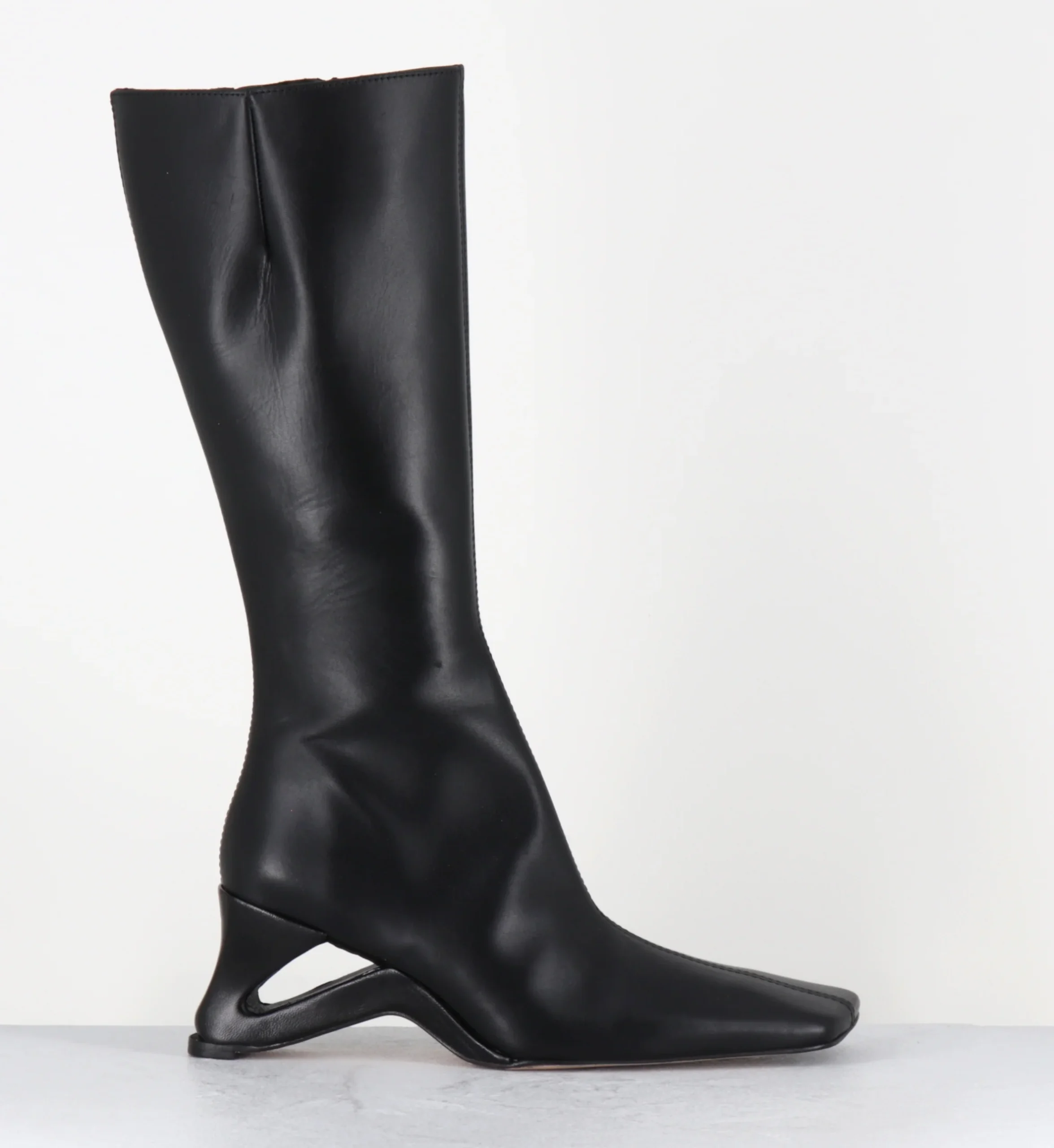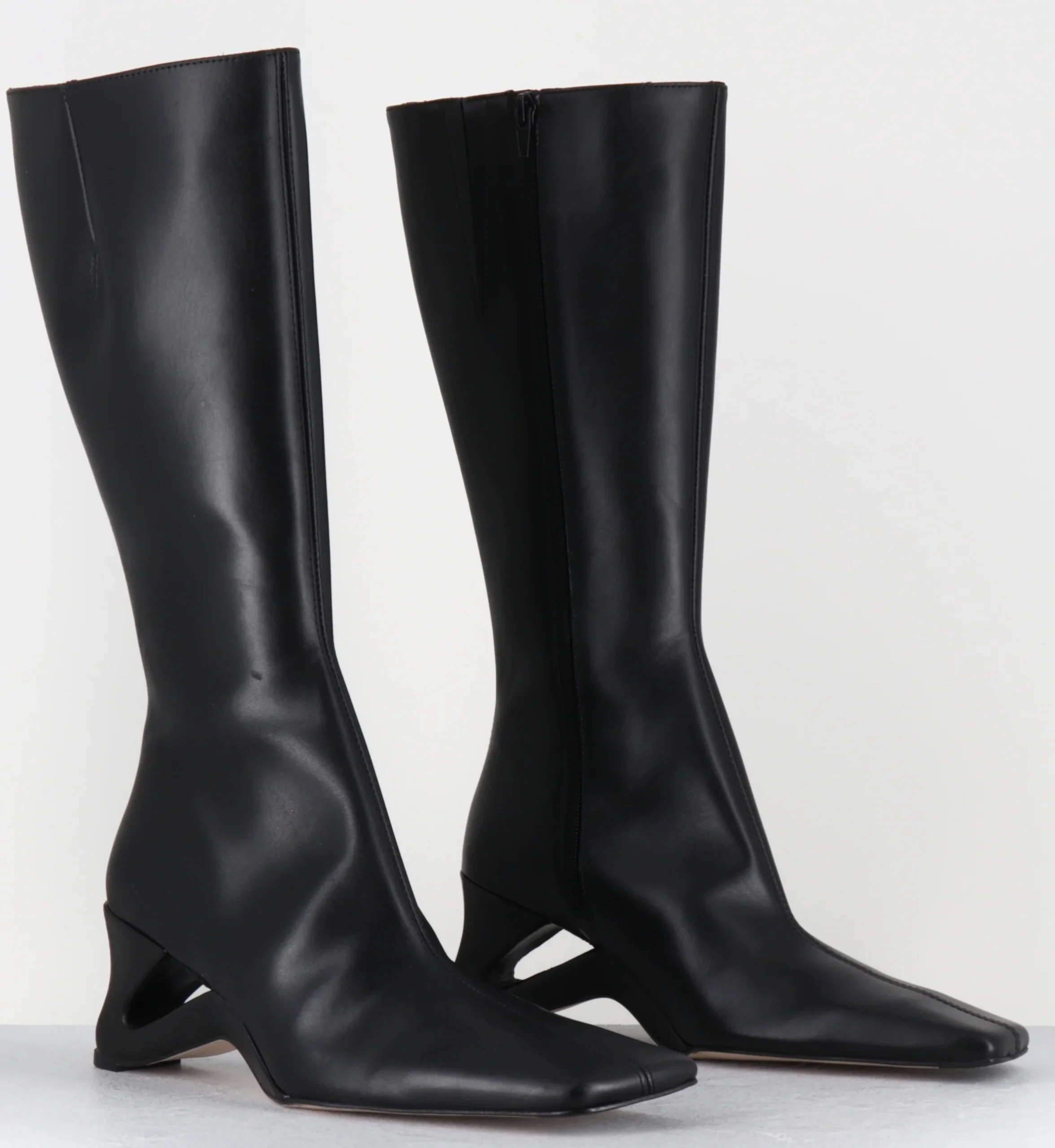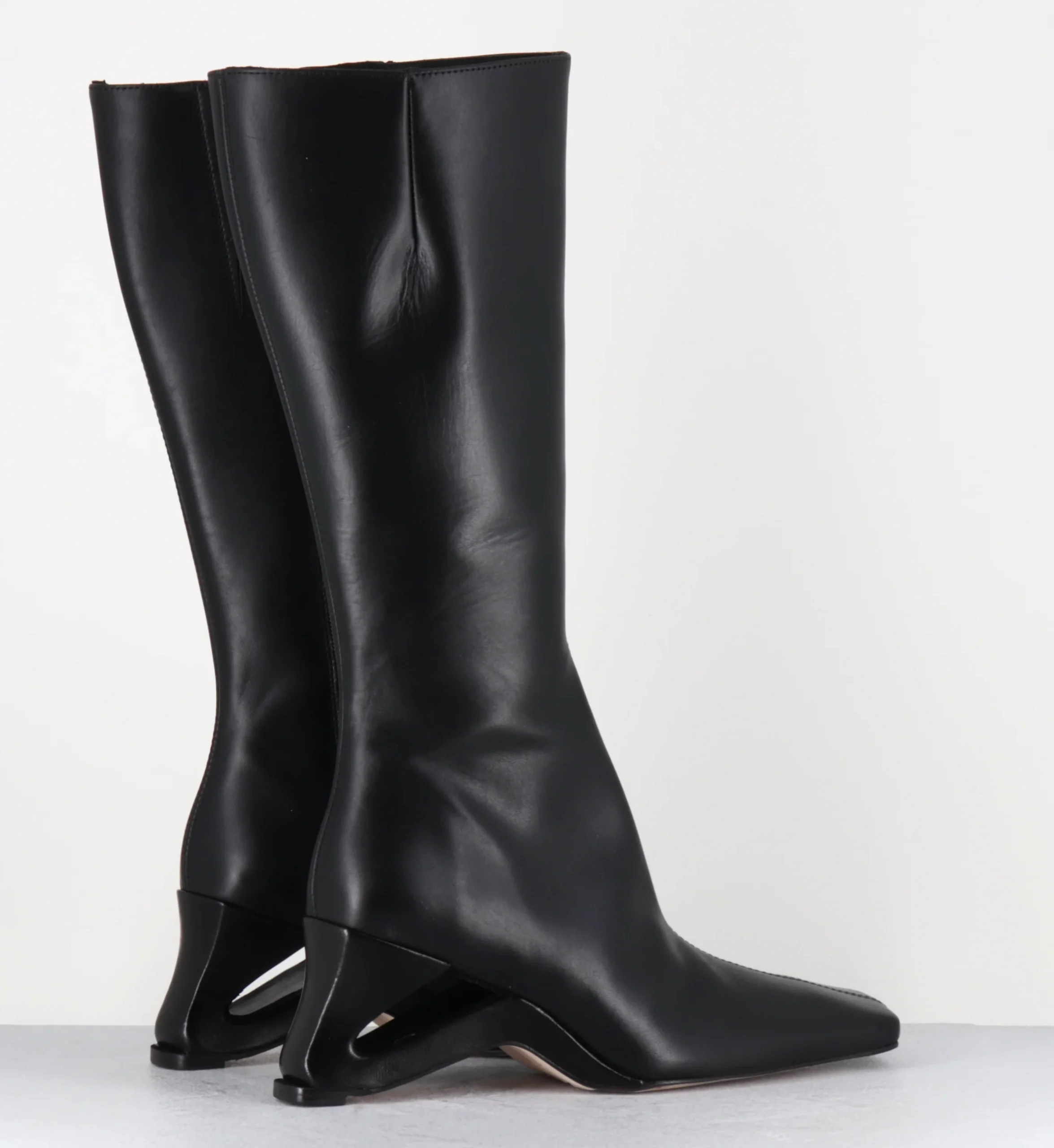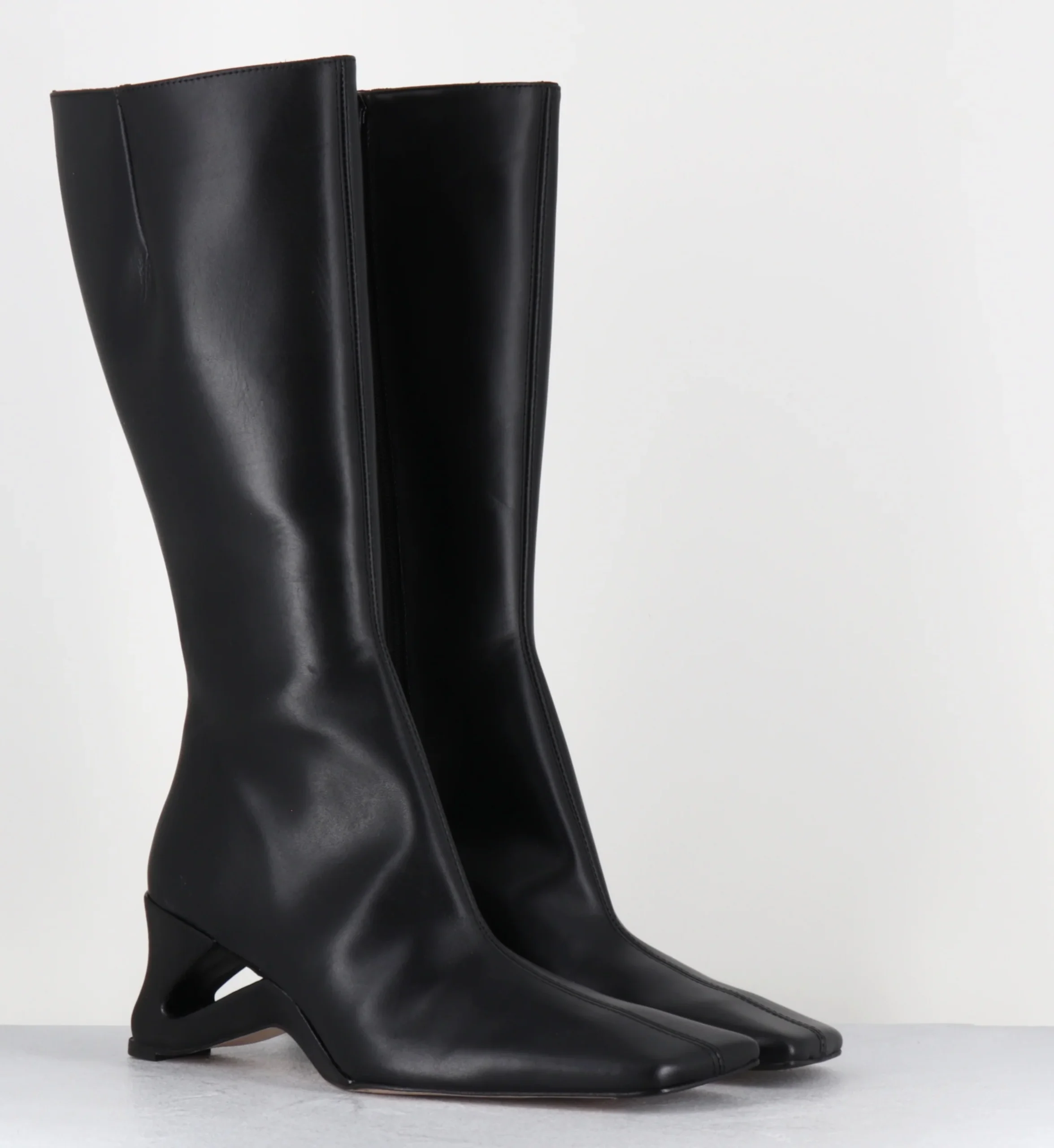 Bottes en cuir noir bout carré asymétrique, tige mi-haute fitté et talon compensé déstructuré