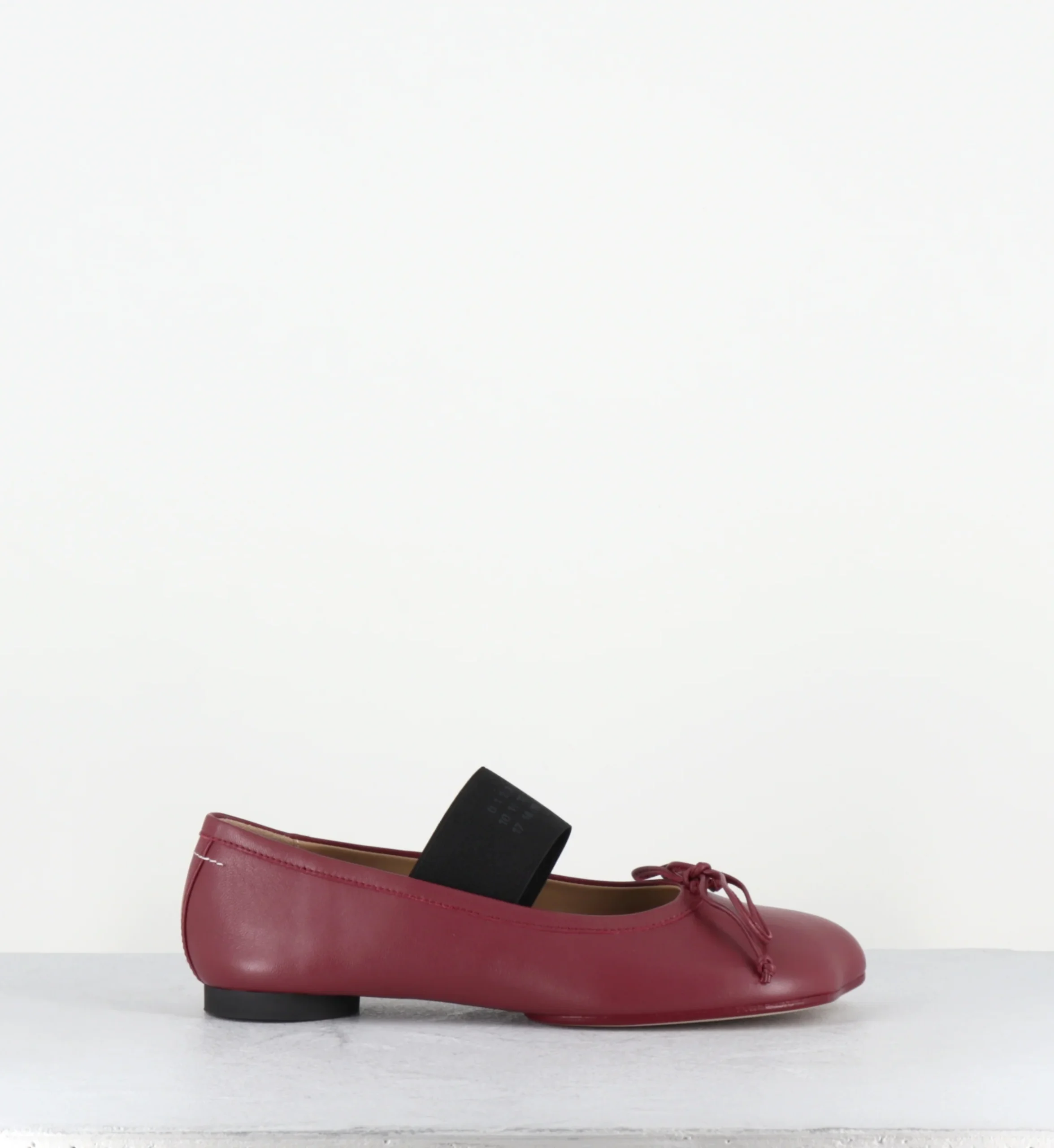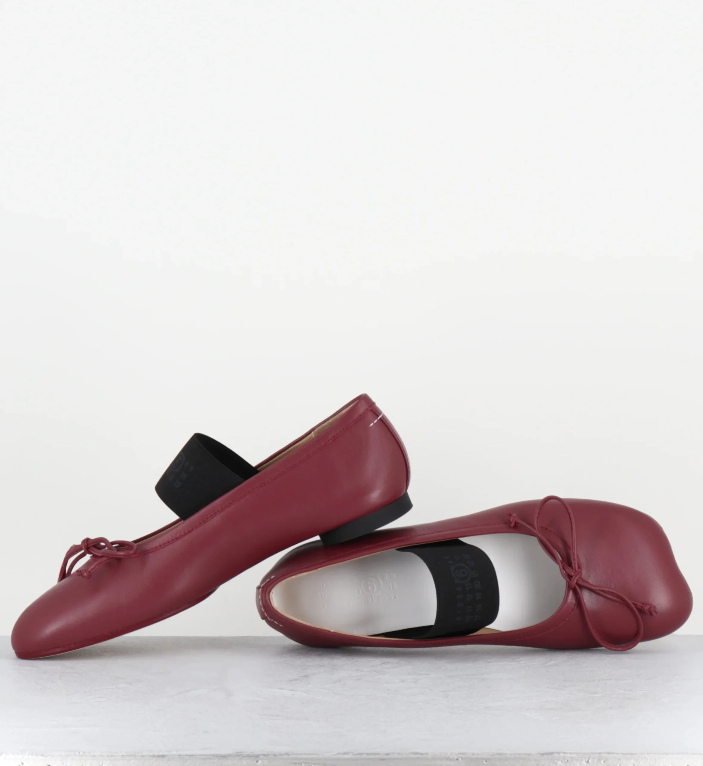 Ballerines esprit chausson de danse en cuir bordeaux souple, dotées d’un petit talon géométrique en pvc avec logo 6 imprimé sur la base & d’un élastique Numeric signature. Ces chaussures arborent un bout anatomique, hommage au modèle iconique Tabi et un détail en forme de nœud, le tout complété à l’arrière de la célèbre surpiqûre horizontale de la Maison.