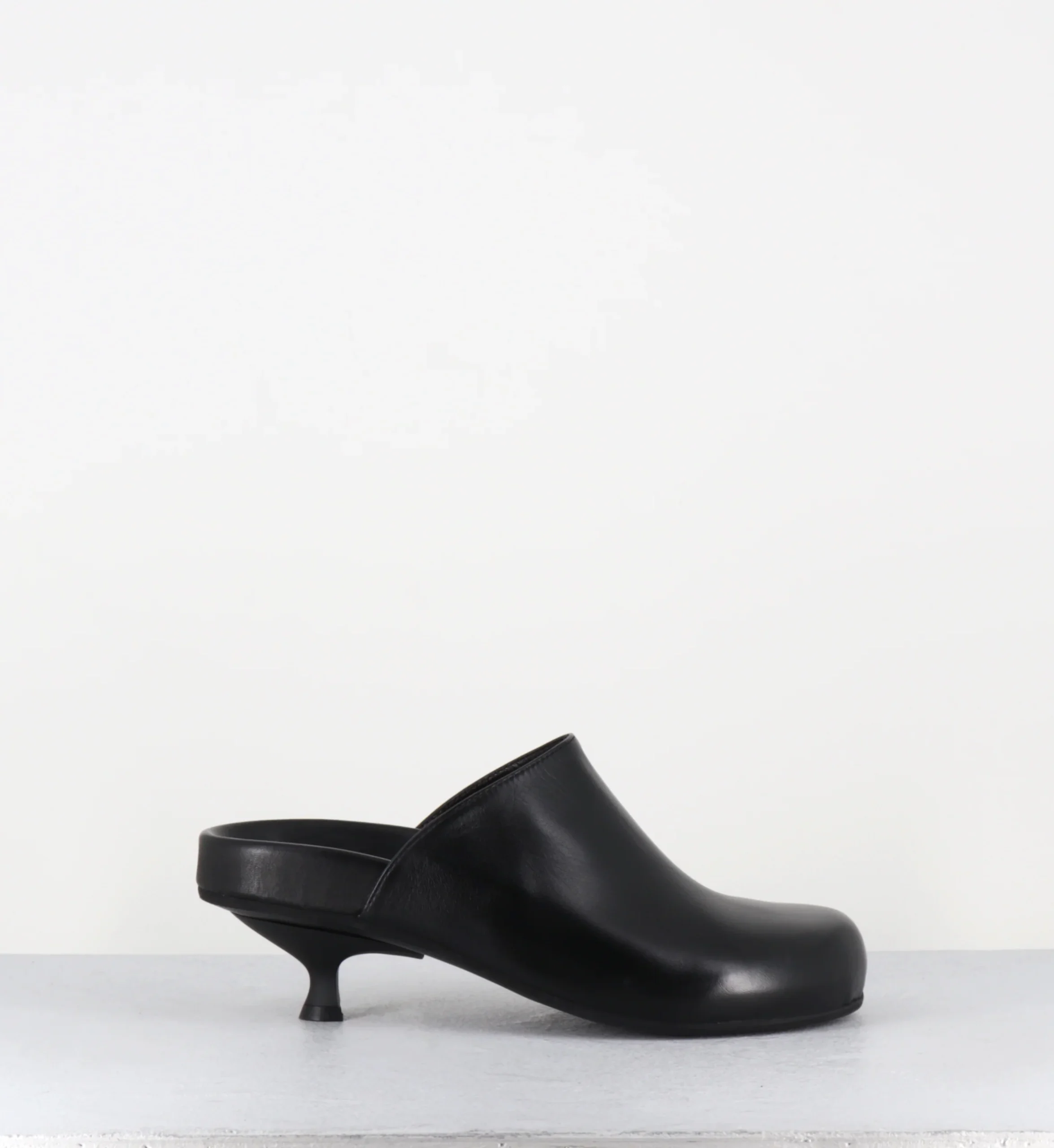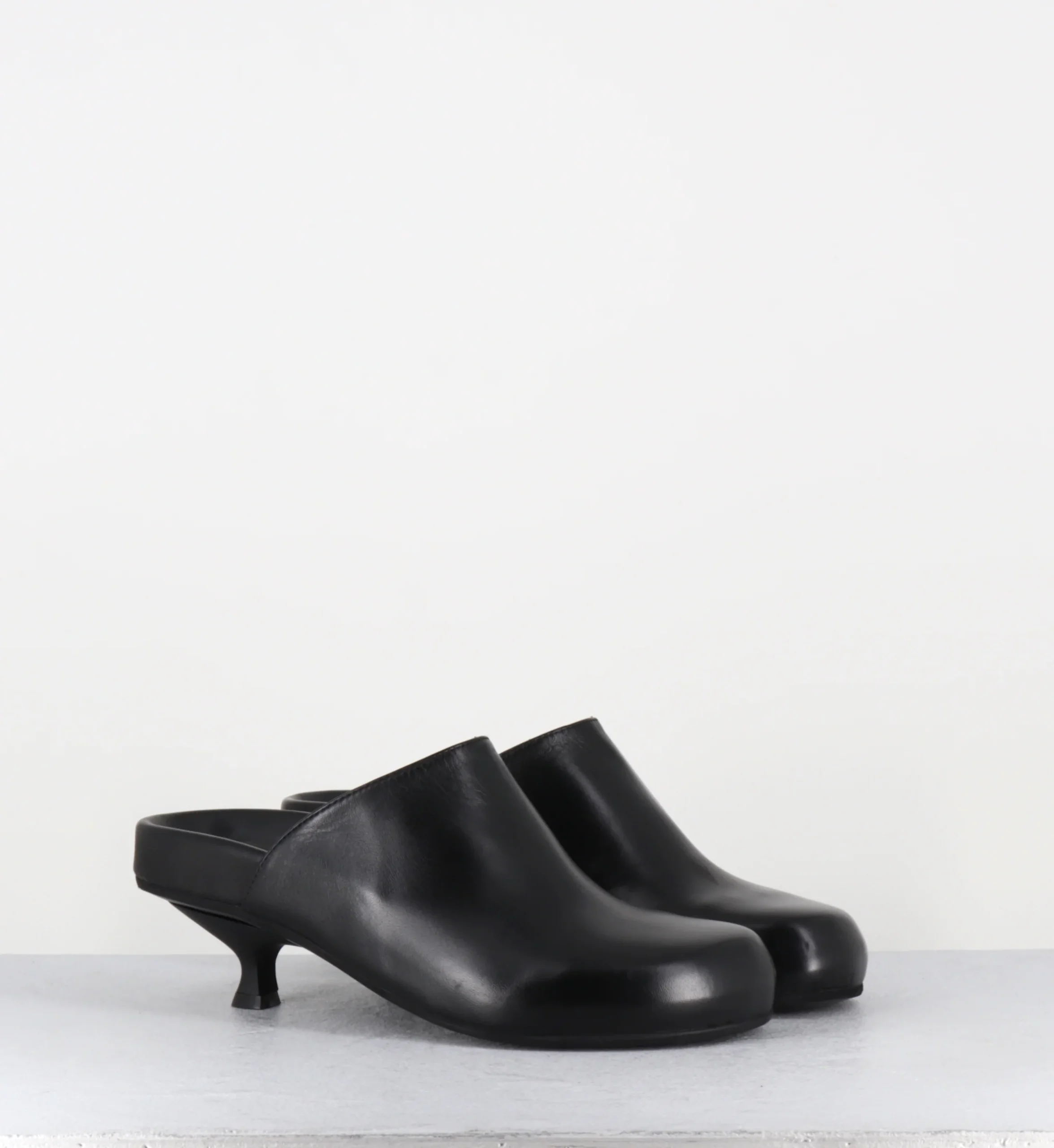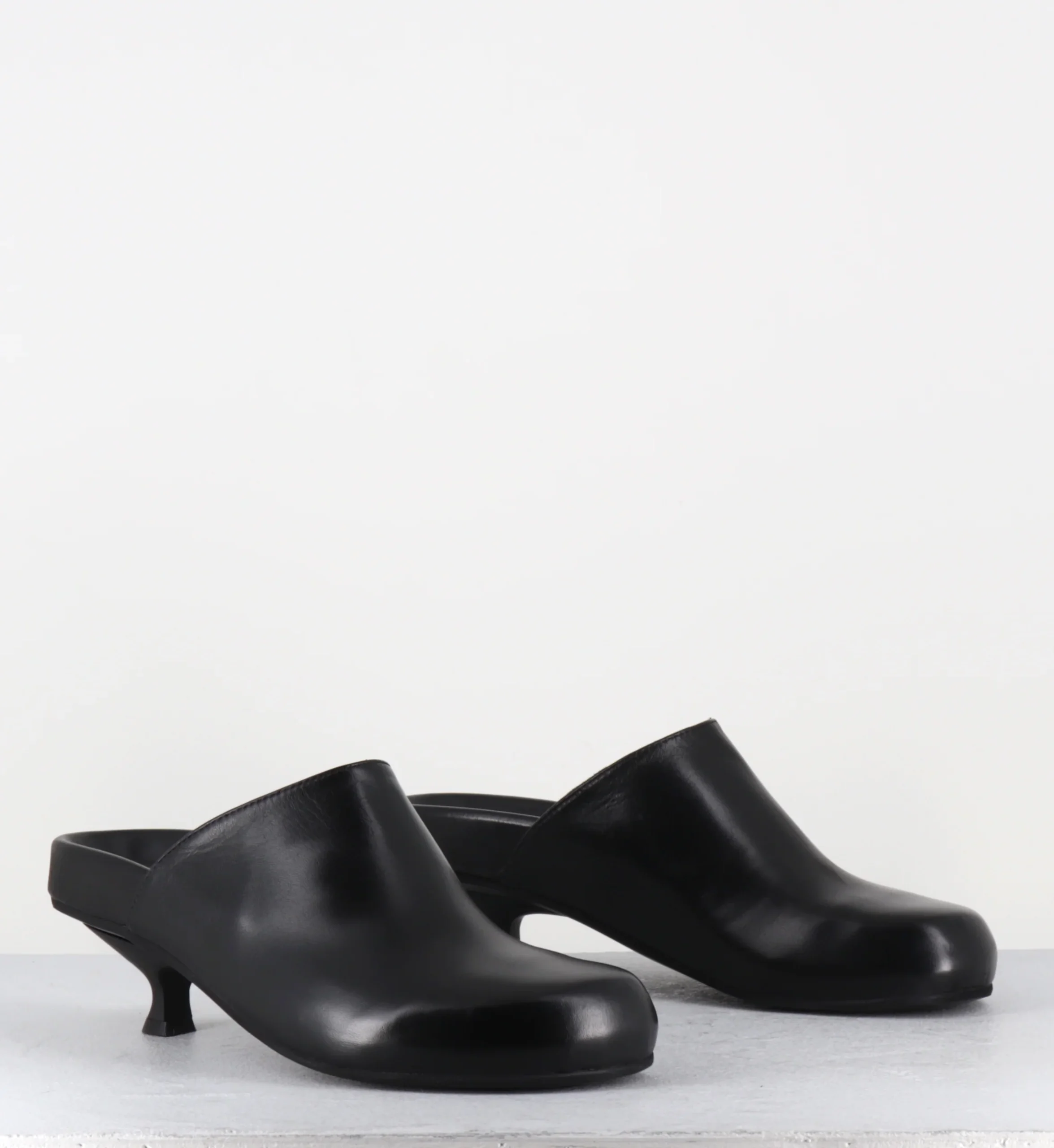 Sabot – mule en cuir noir, forme japonisante légèrement asymétrique, montées sur un kitten heel et une semelle anatomique confortable Fabrication Artisanale Italienne – Ateliers Poeve
