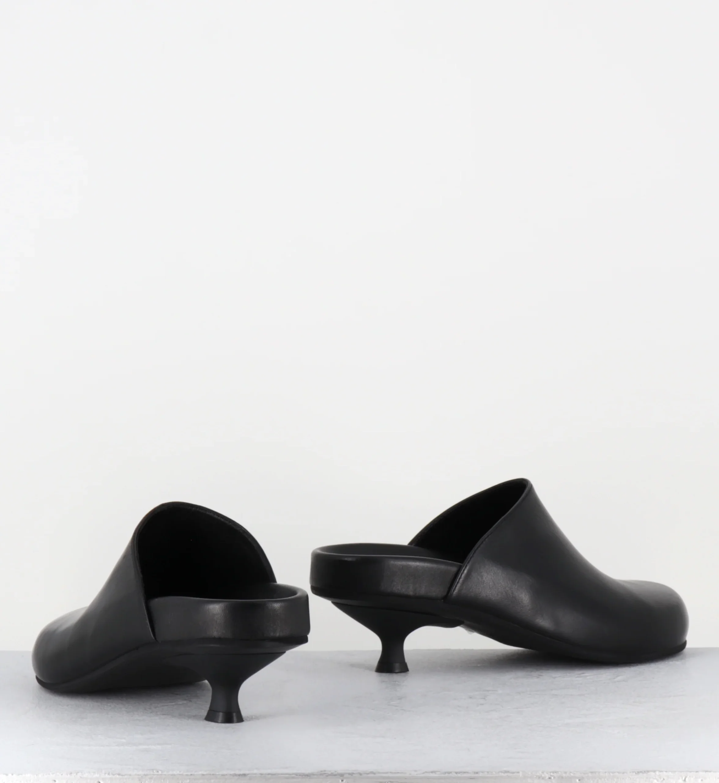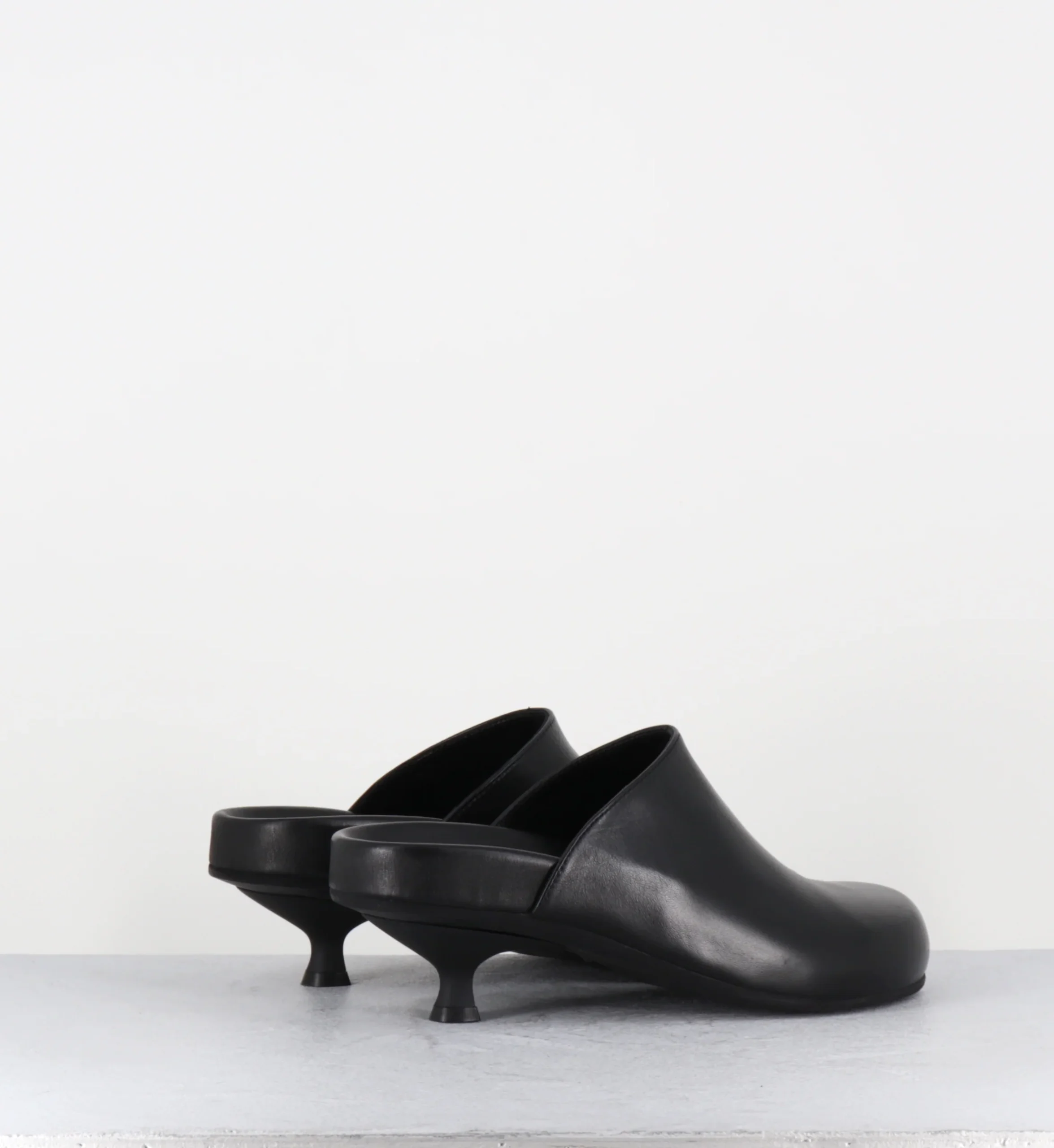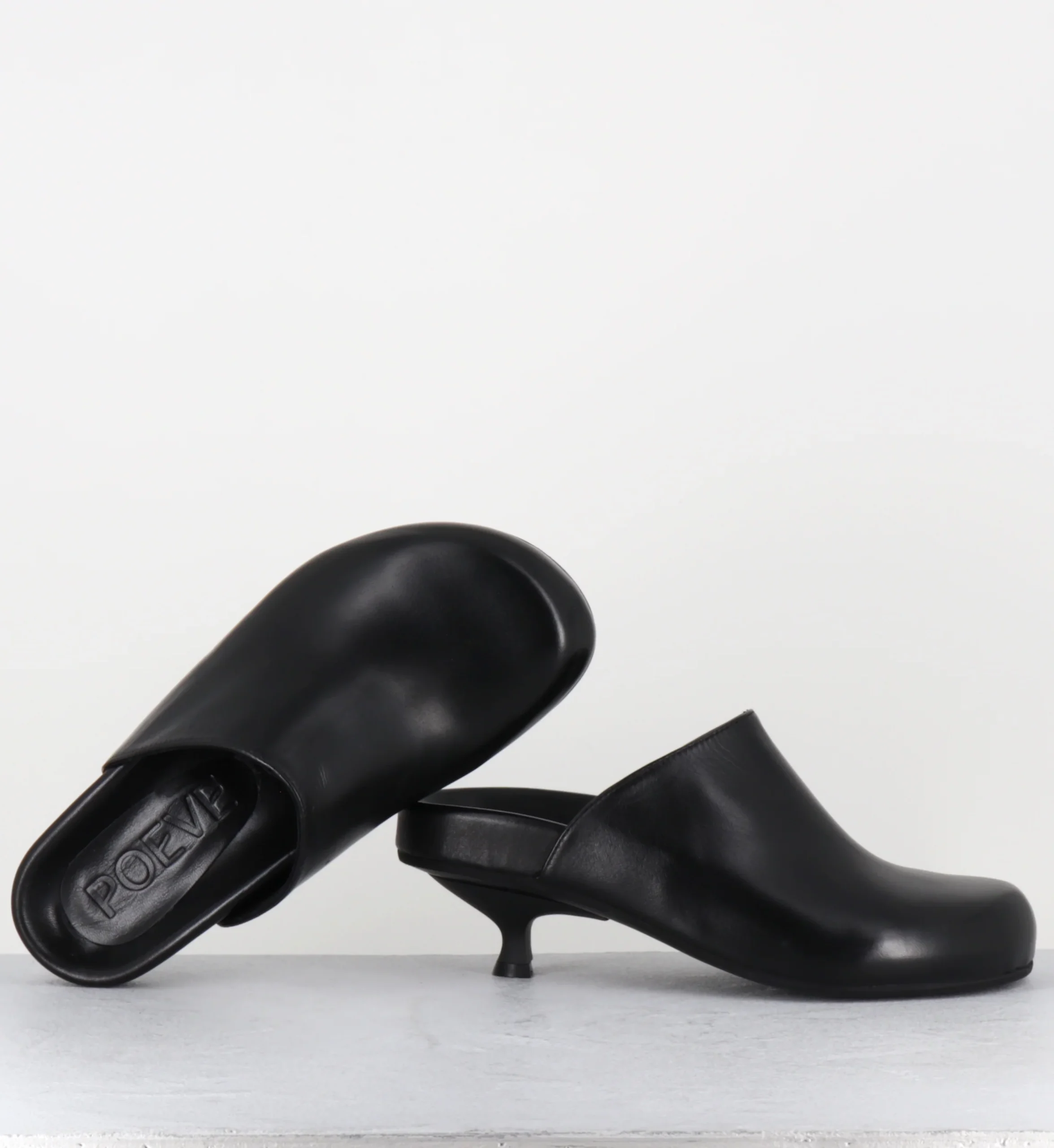 Sabot – mule en cuir noir, forme japonisante légèrement asymétrique, montées sur un kitten heel et une semelle anatomique confortable Fabrication Artisanale Italienne – Ateliers Poeve