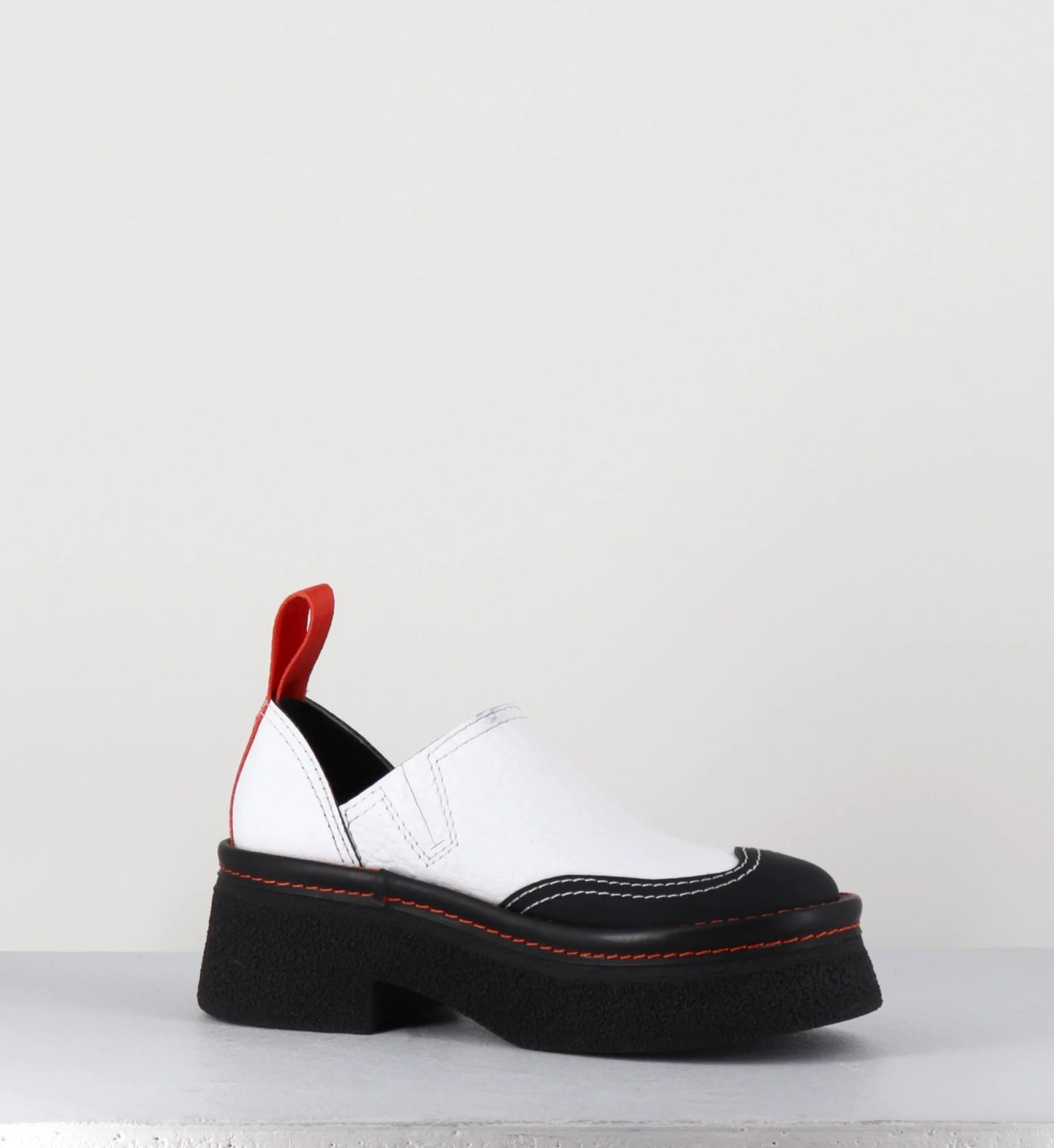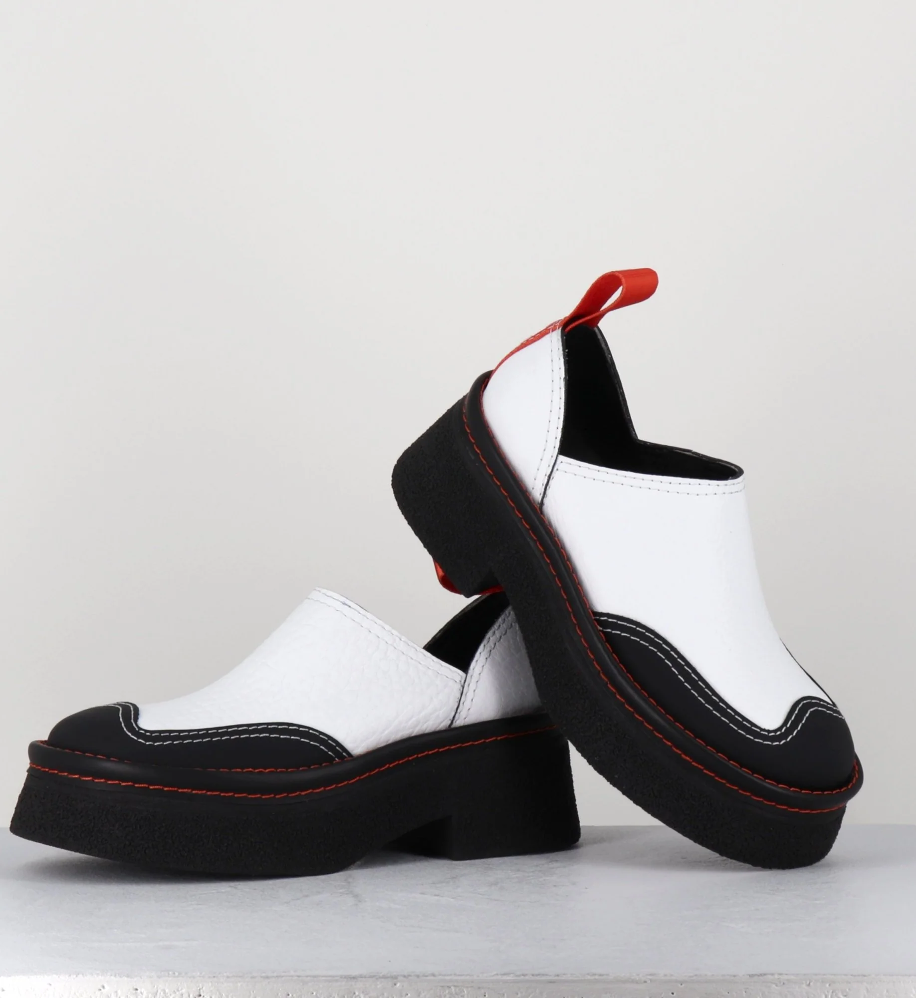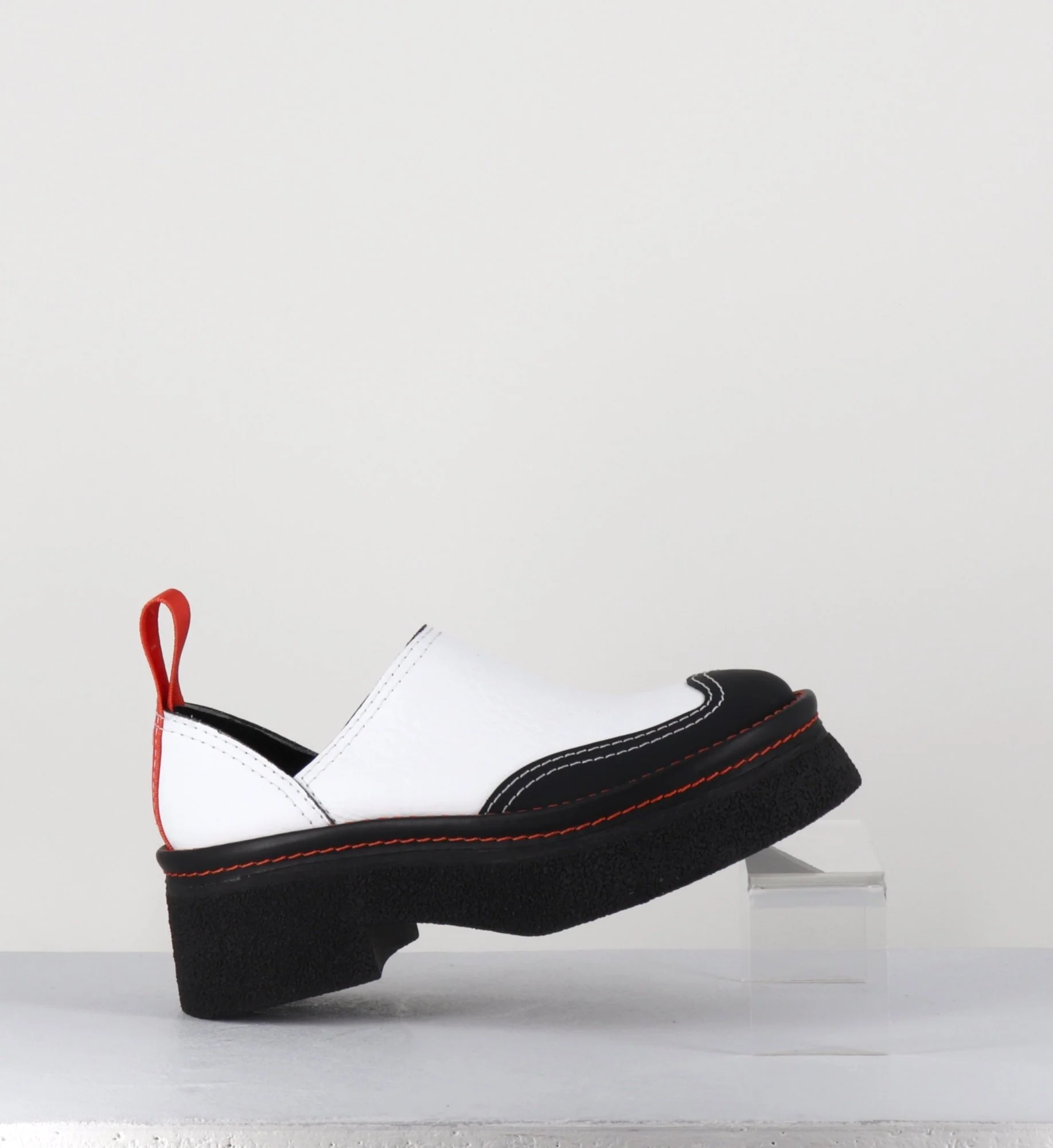Entre le sabot et la mule, Odile est réalisé dans un cuir grainé blanc, découpe avec empiècement gomme noire à l’avant & surpiqures blanches, bout arrondi esprit 90s, montées sur une semelle épaisse en gomme texturé avec surpiqures orange contrastantes et un petit talon confortable légèrement évasé, signature de la Maison Miista à l’arrière de la chaussure