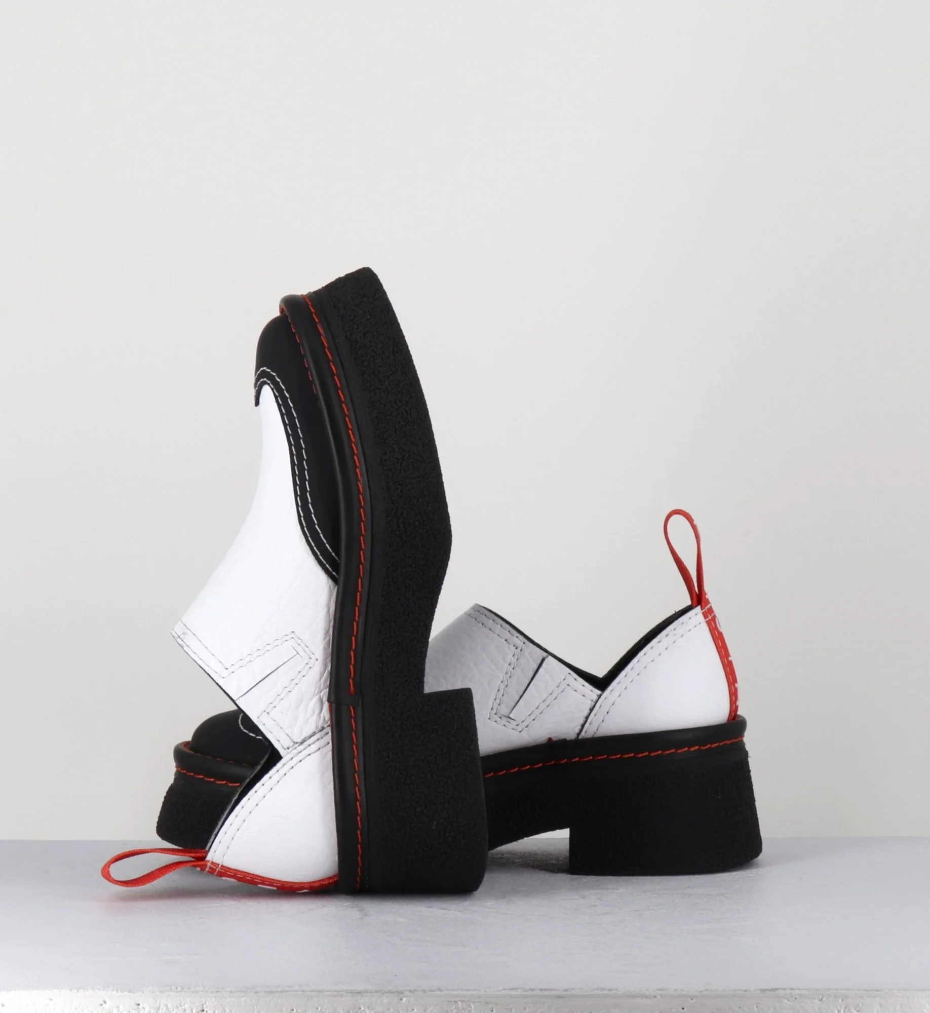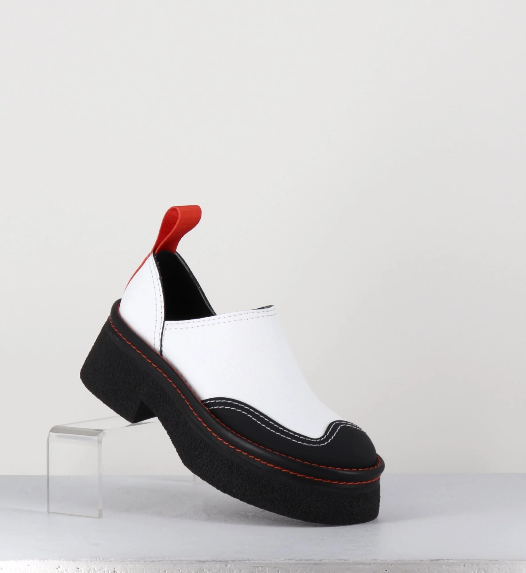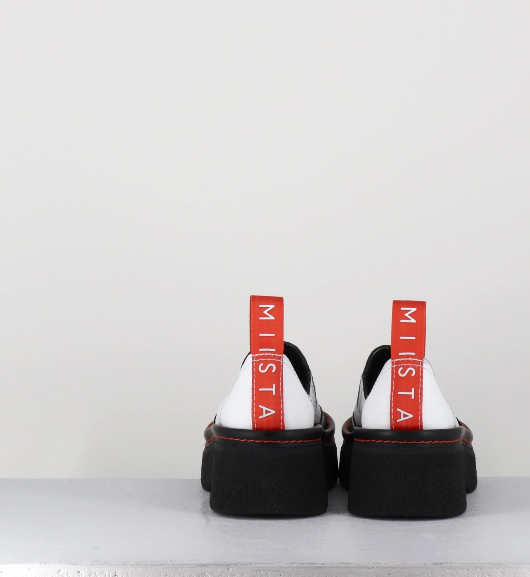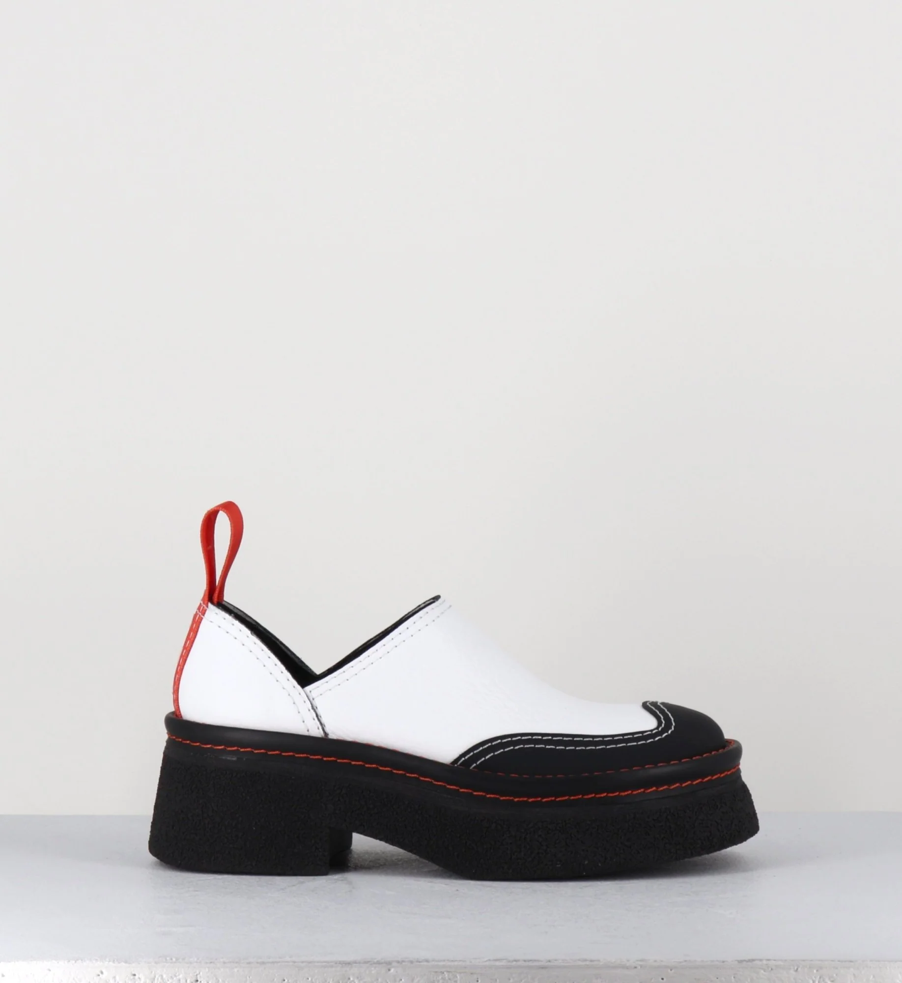 Entre le sabot et la mule, Odile est réalisé dans un cuir grainé blanc, découpe avec empiècement gomme noire à l’avant & surpiqures blanches, bout arrondi esprit 90s, montées sur une semelle épaisse en gomme texturé avec surpiqures orange contrastantes et un petit talon confortable légèrement évasé, signature de la Maison Miista à l’arrière de la chaussure