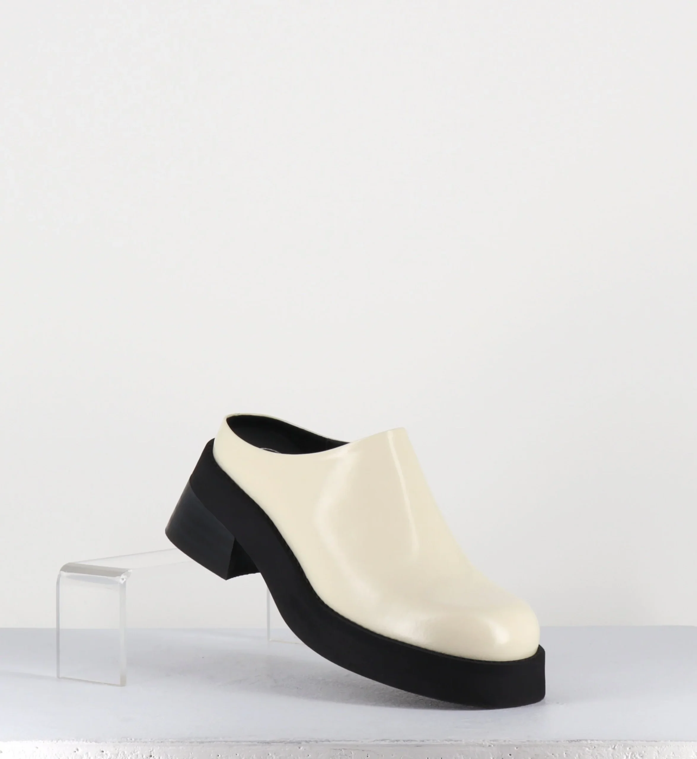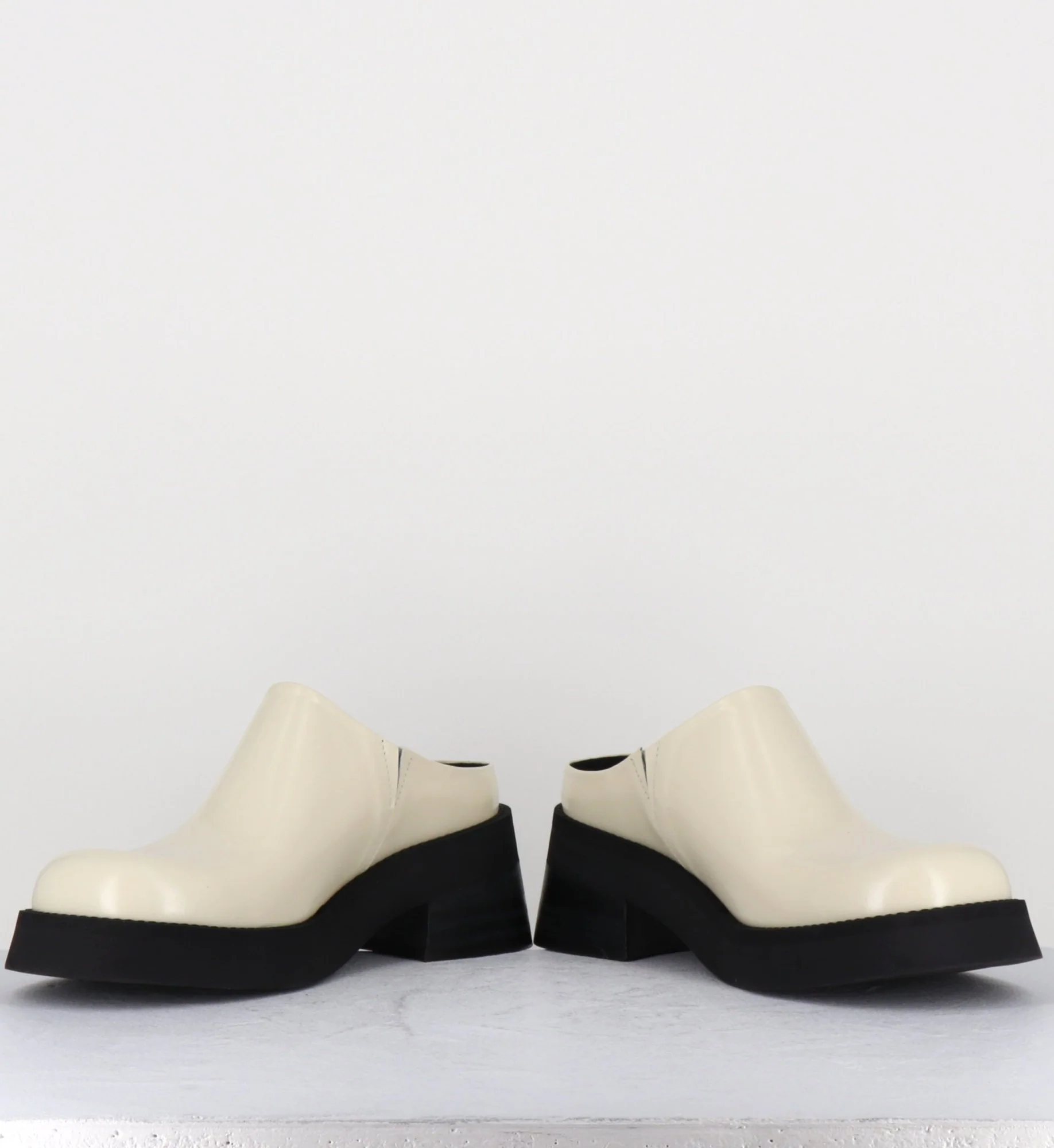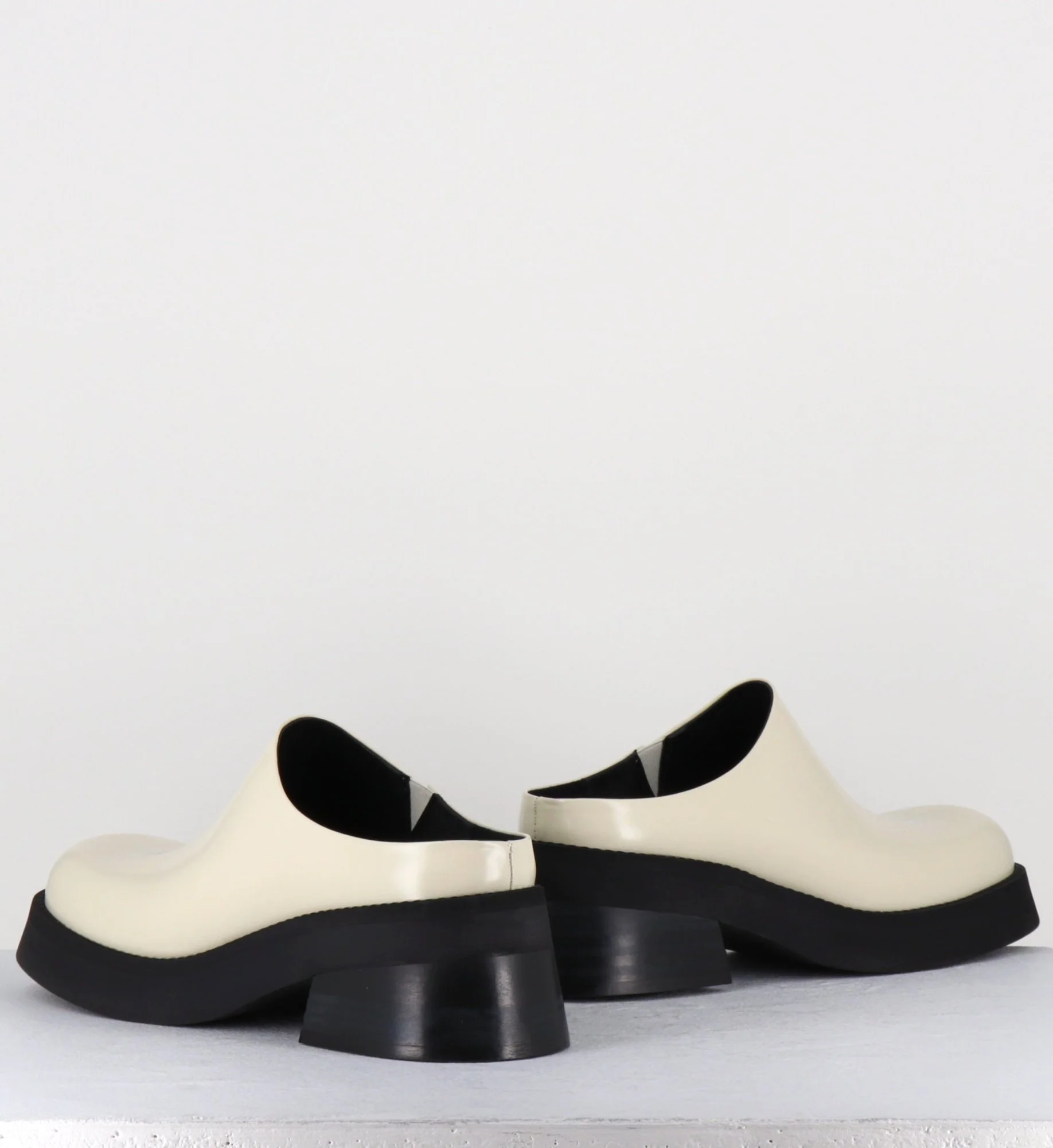 Entre le sabot et la mule, Odile est réalisé dans un cuir lisse beige, ligne pure sans coutures apparentes, bout arrondi esprit 90s, muni d’un petit élastique intérieur invisible pour plus d’aisance, montées sur une semelle épaisse en gomme et un petit talon confortable légèrement évasé, signature de la Maison.