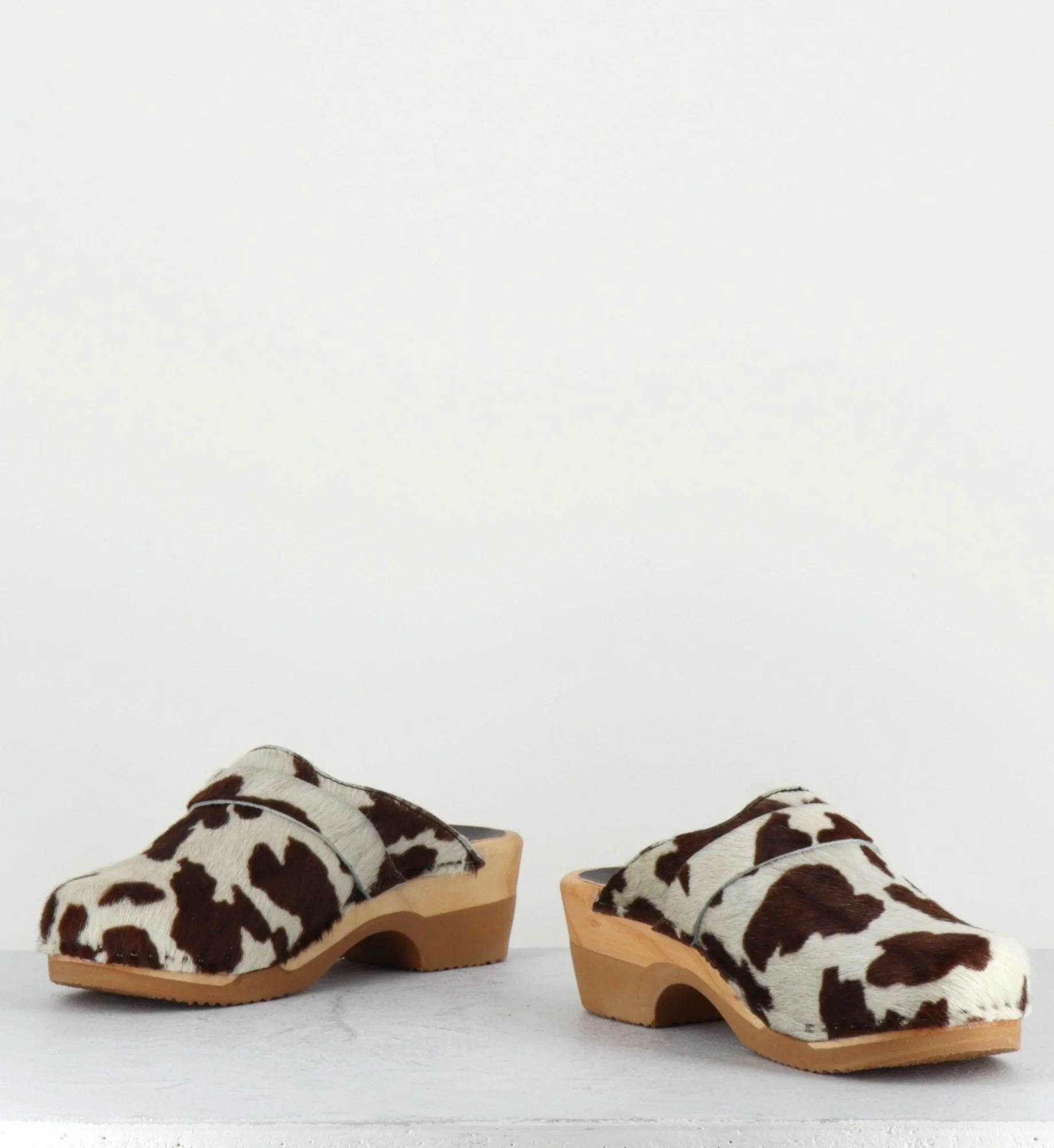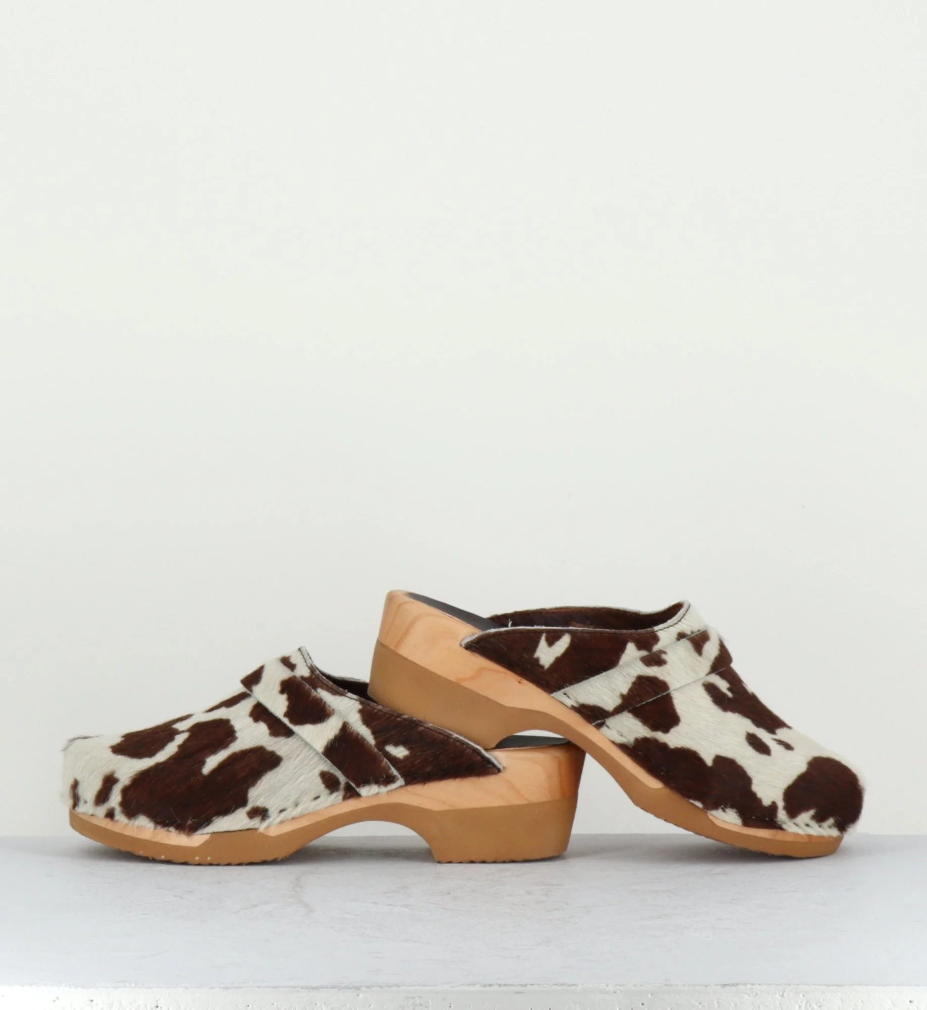 Petits sabots en « poulain » imprimé vache marron & blanc, réalisés dans un bois ultra léger avec un insert de caoutchouc qui permet une vraie flexibilité !