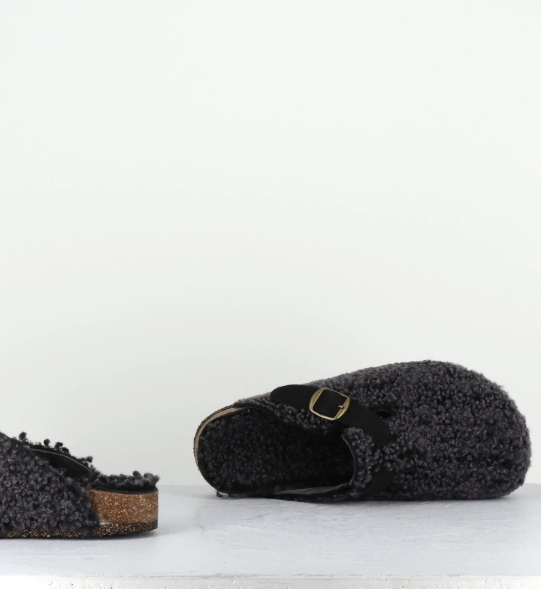 Sabots plat mouton gris anthracite, bride en daim noir avec boucle réglable, semelle intérieure anatomique, semelle extérieure crêpe naturel Fabriqué dans les Ateliers de la Maison Bosabo en France. Toutes les matières sélectionnées par la Maison Bosabo sont respectueuses de l’environnement et de votre peau (sans solvant / ni chrome). Chausse normalement