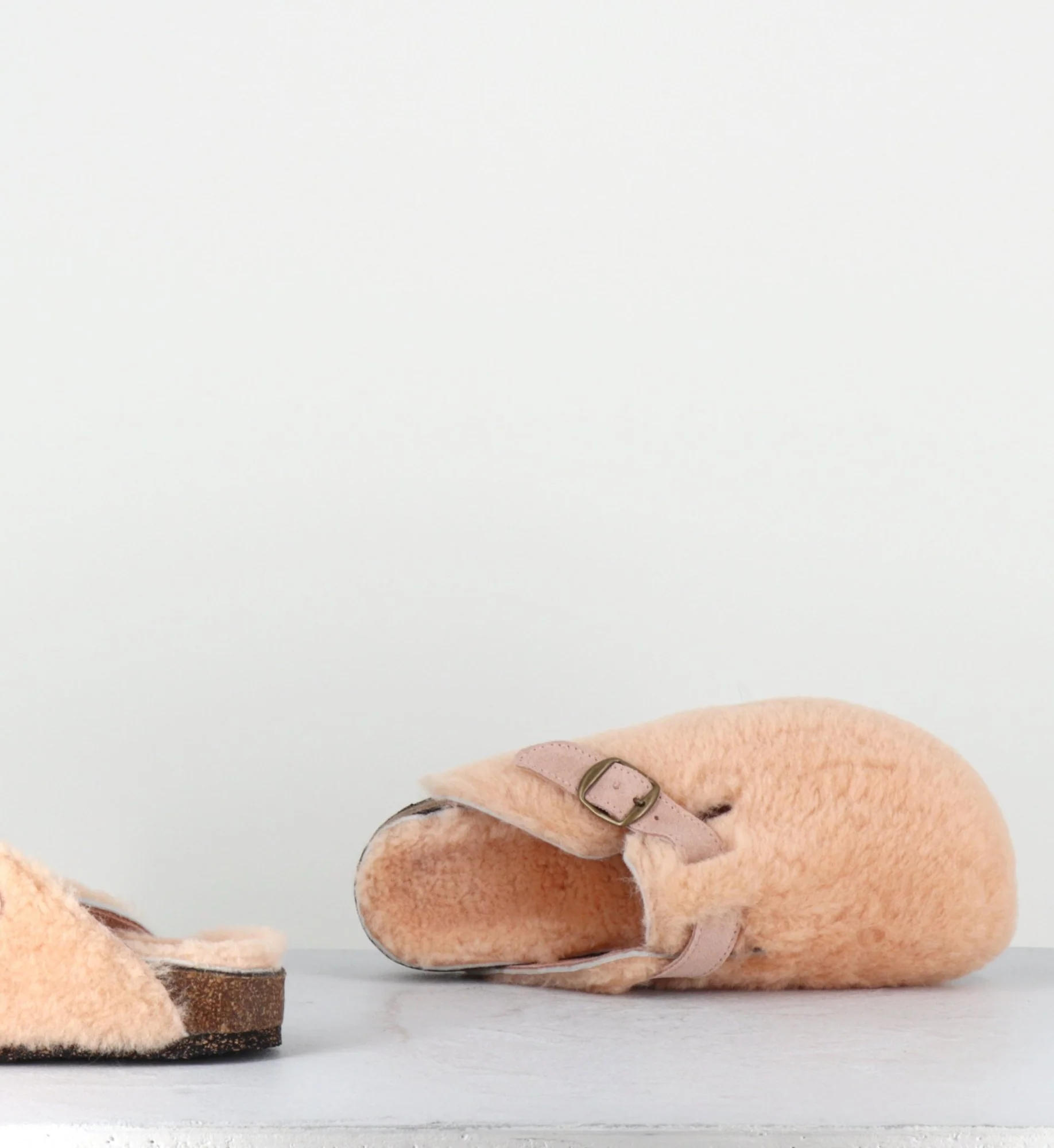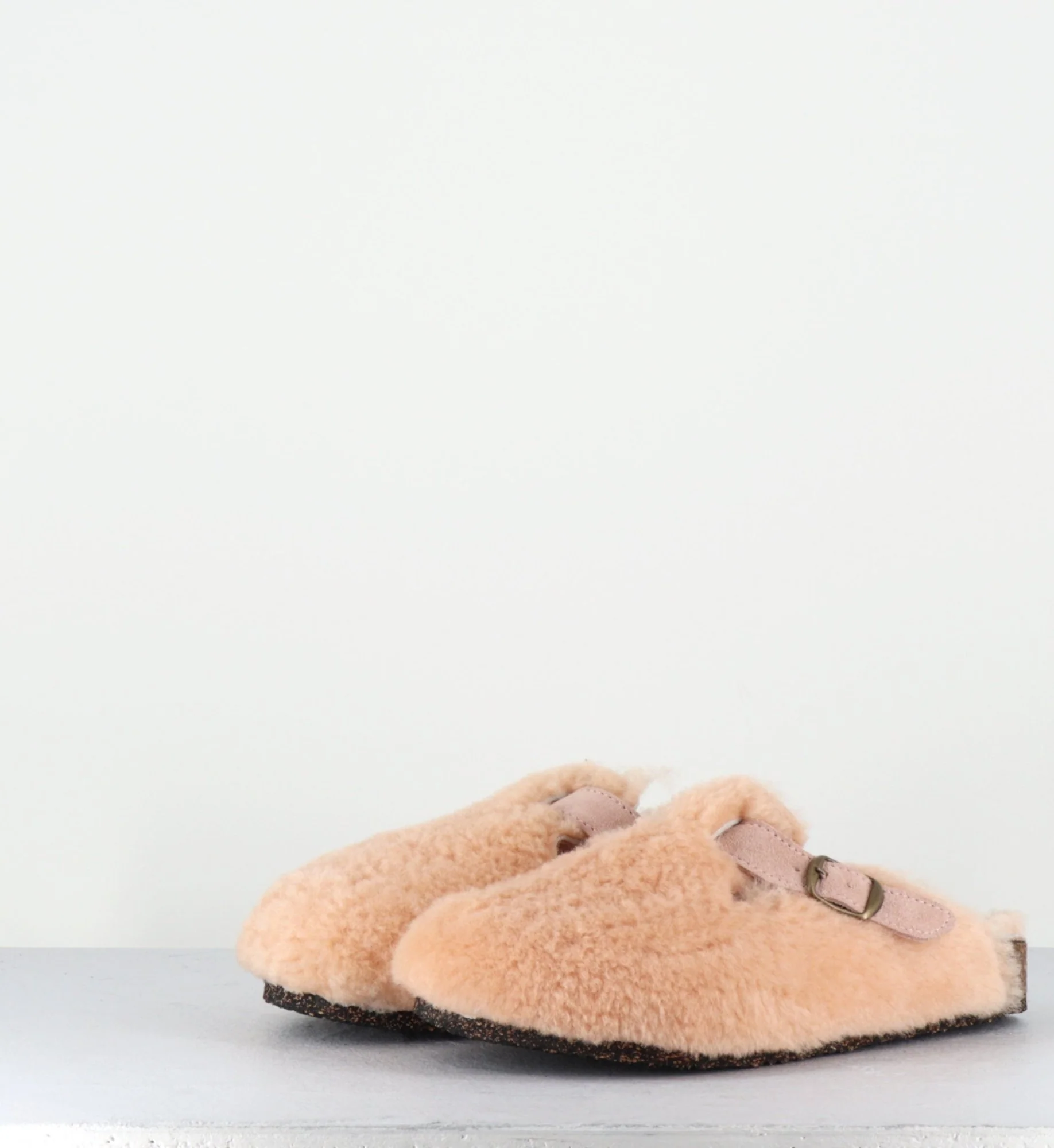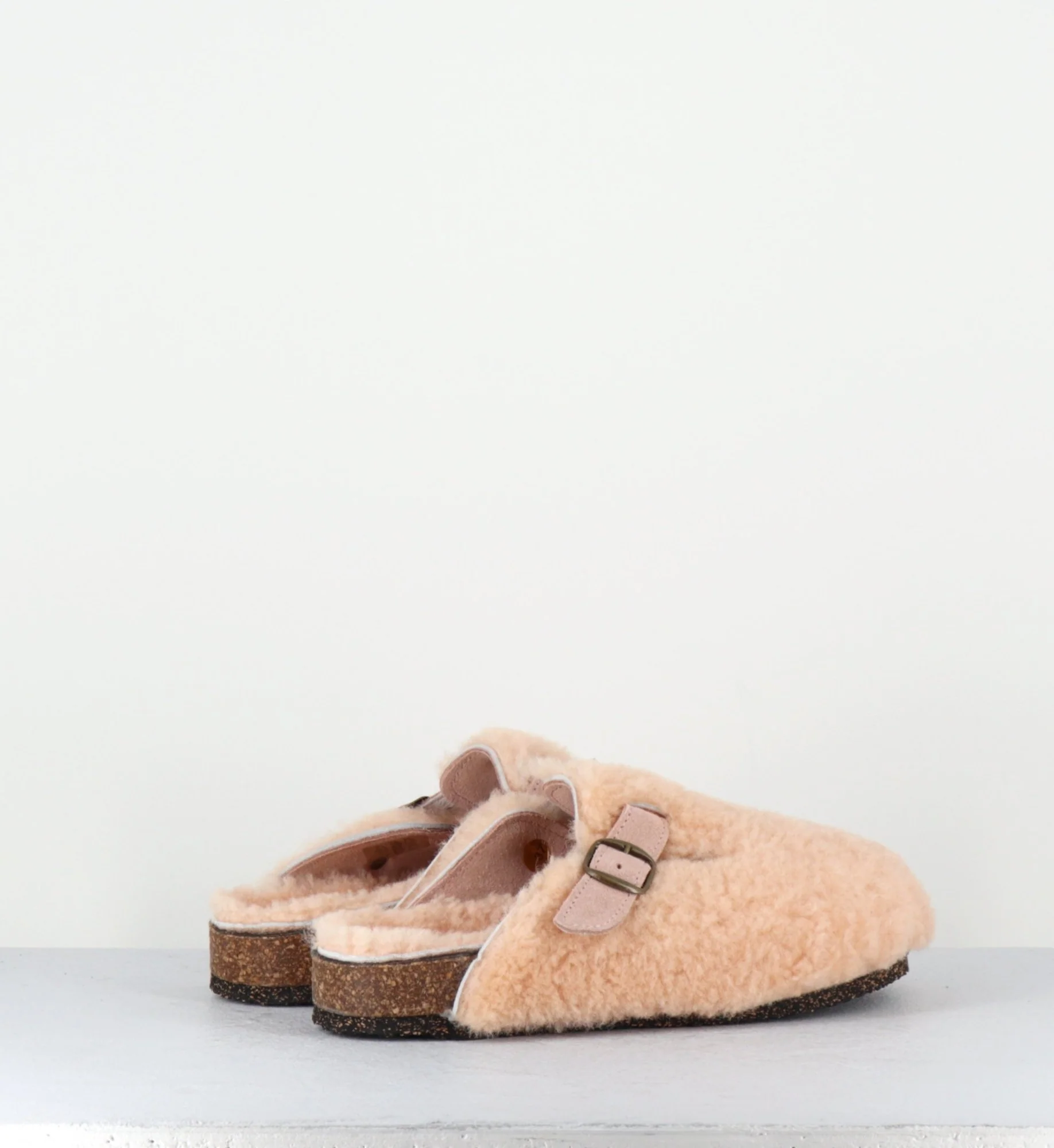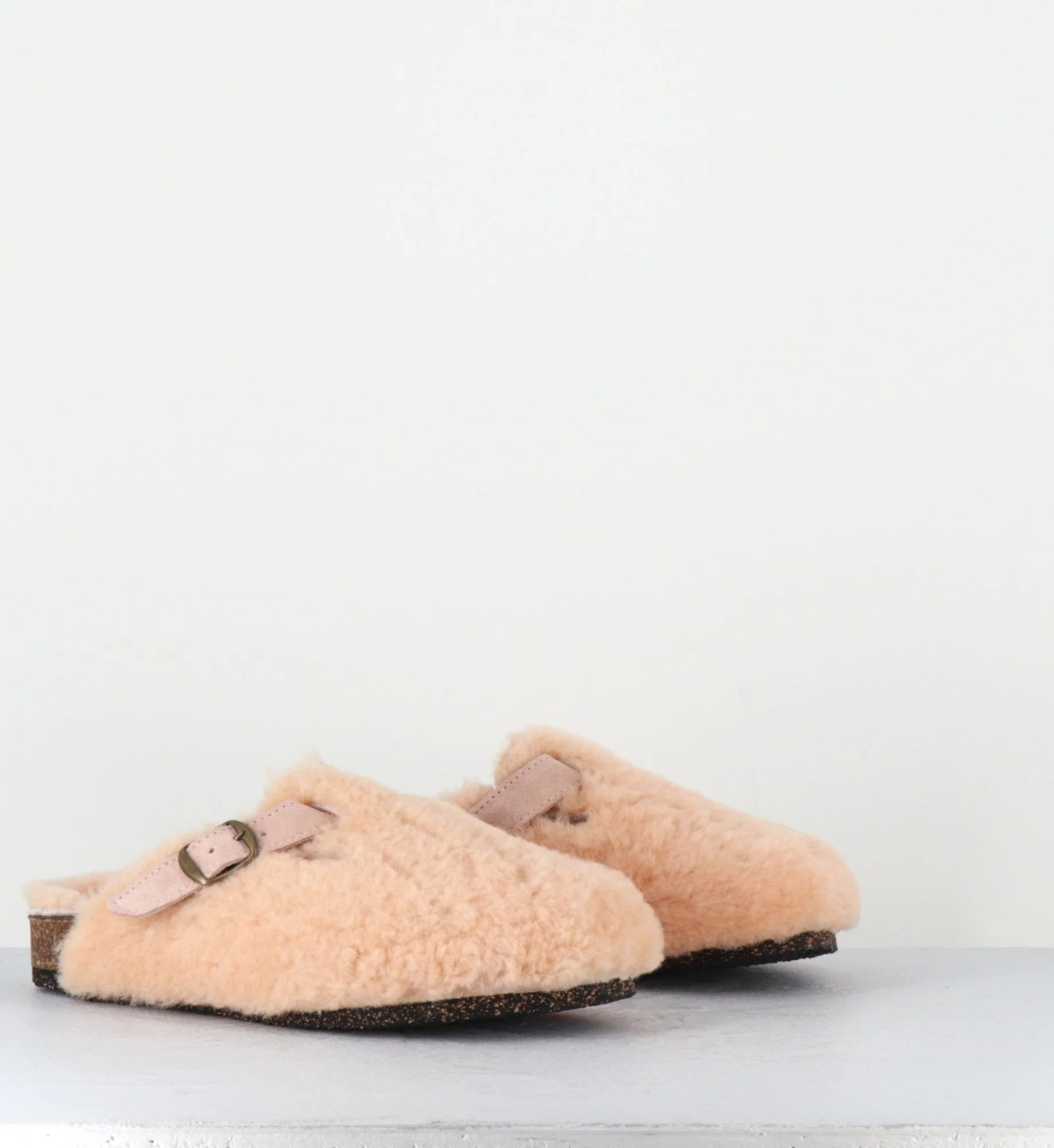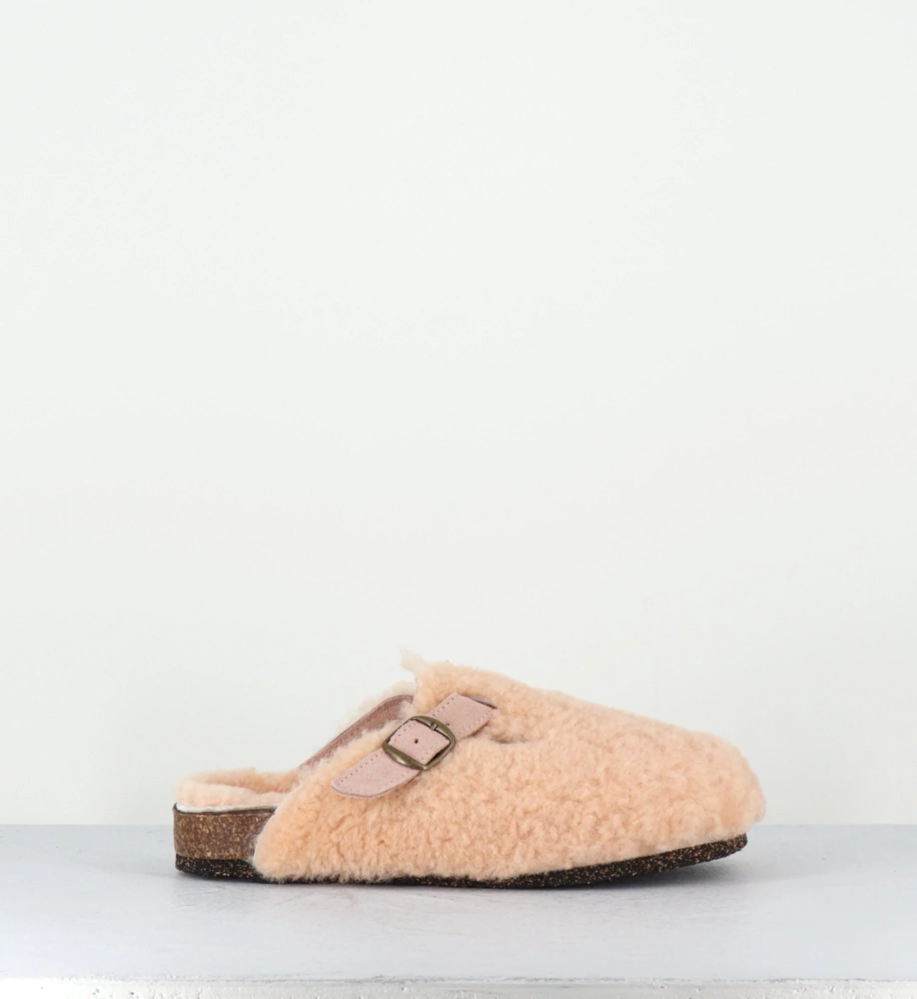 Sabots plat mouton rose, bride en daim avec boucle réglable, semelle intérieure anatomique, semelle extérieure crêpe naturel