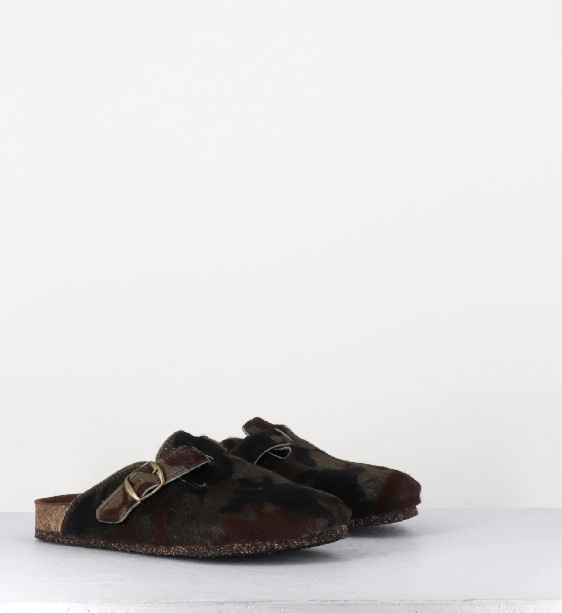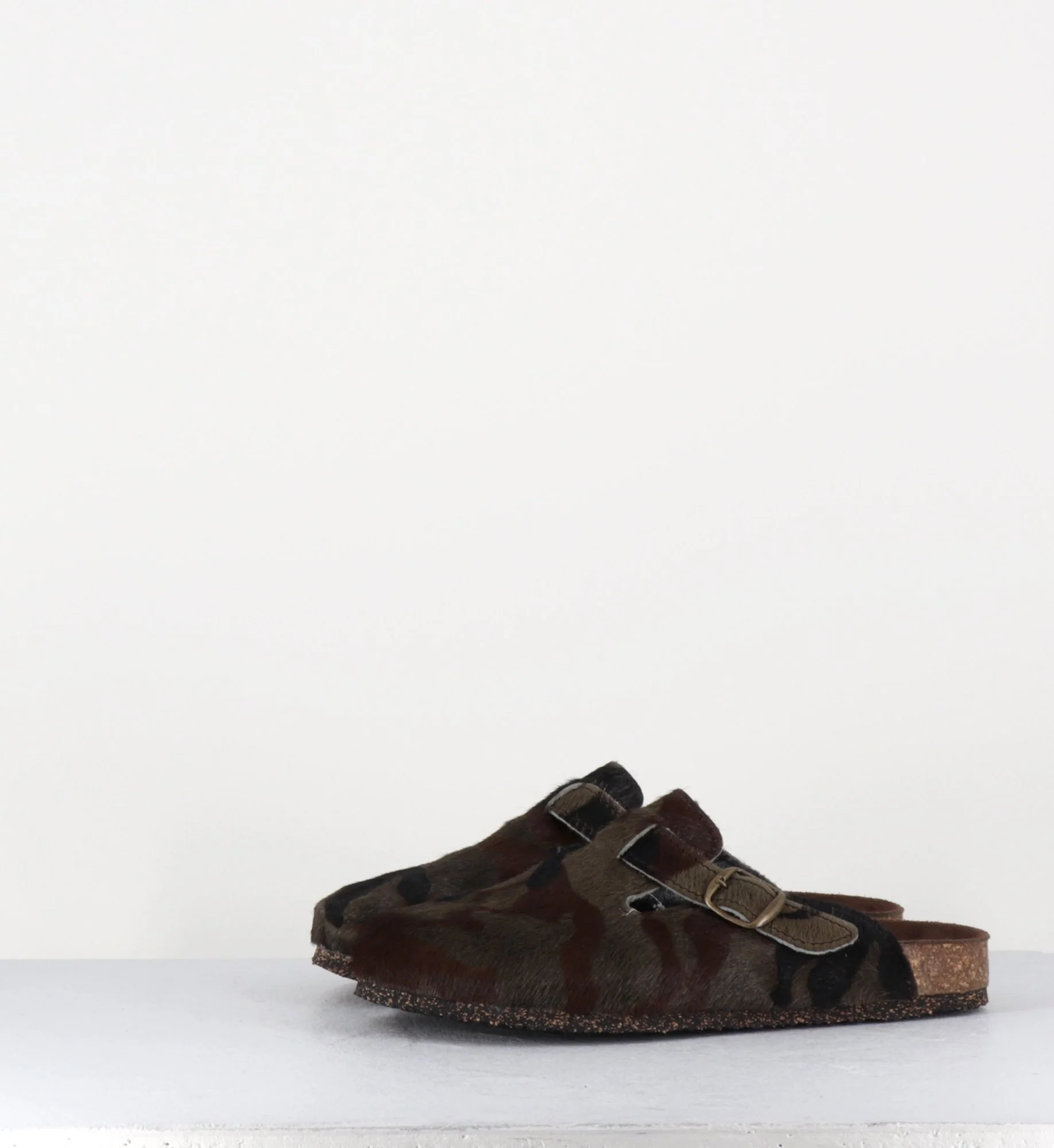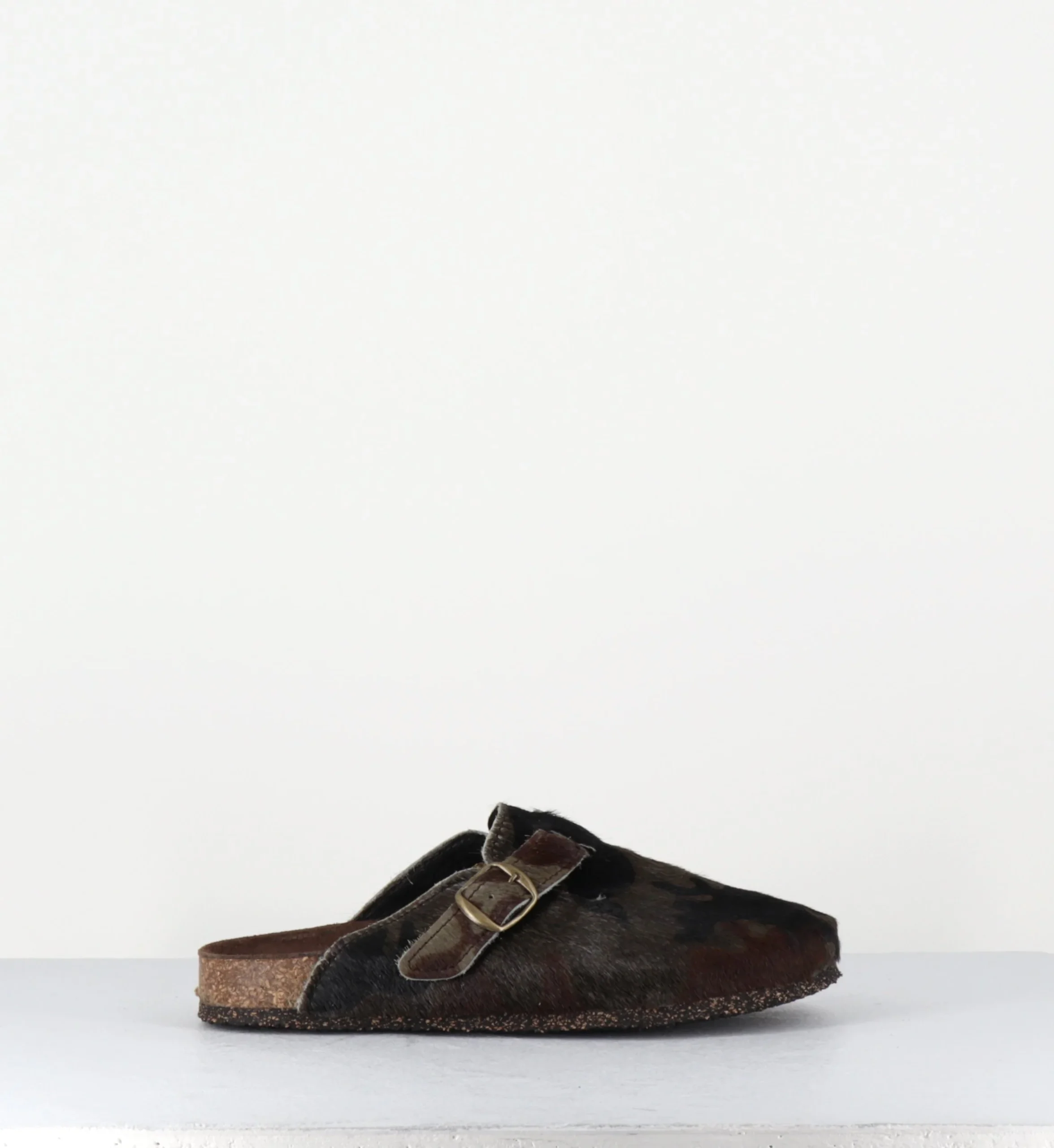 Sabots plat « poulain » -cuir de vache- imprimé camouflage khaki/noir, petite boucle réglable, semelle intérieure anatomique, semelle extérieure crêpe naturel