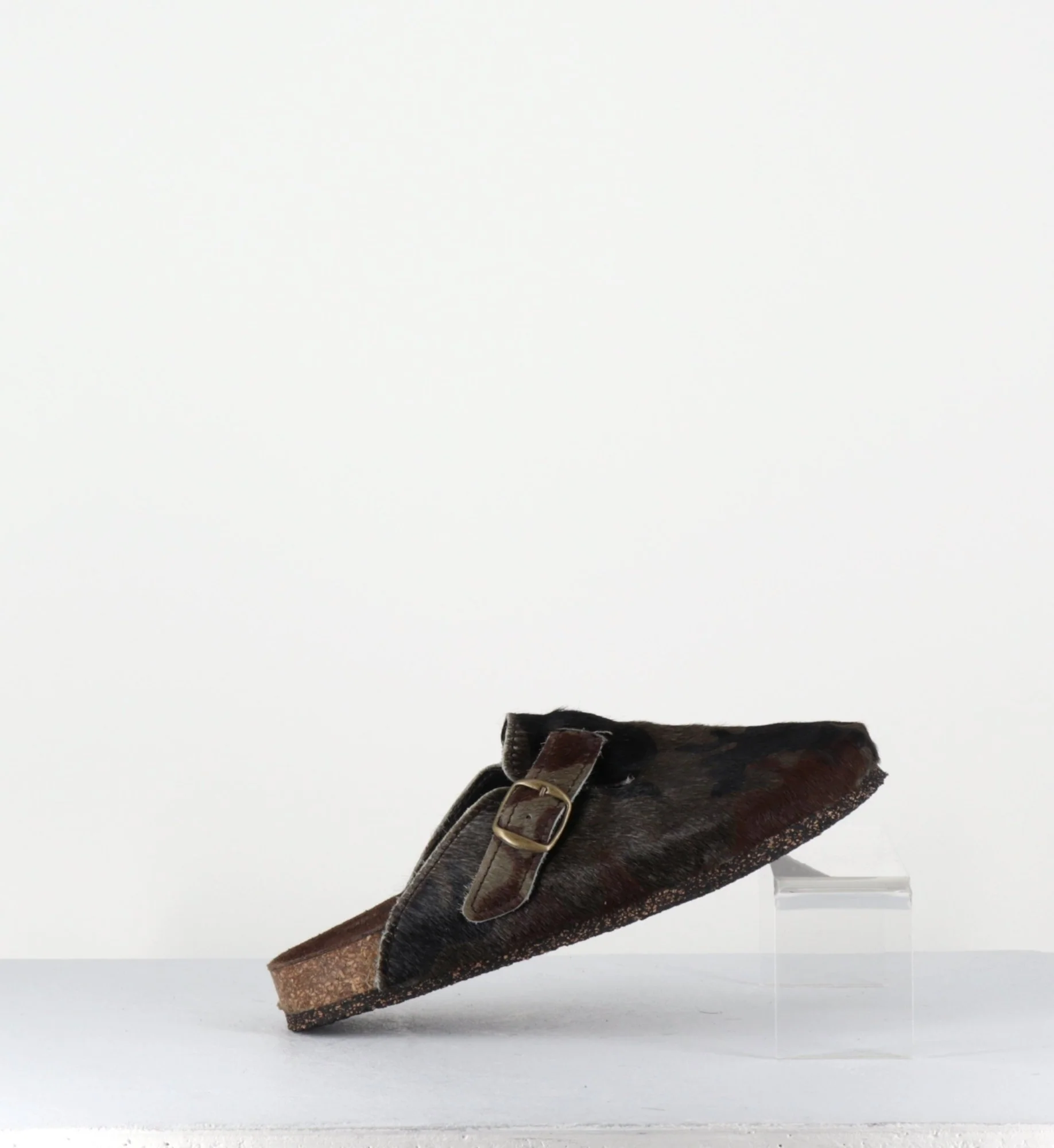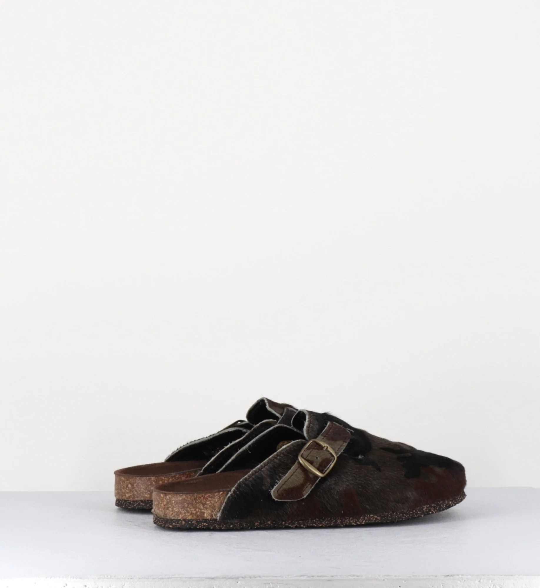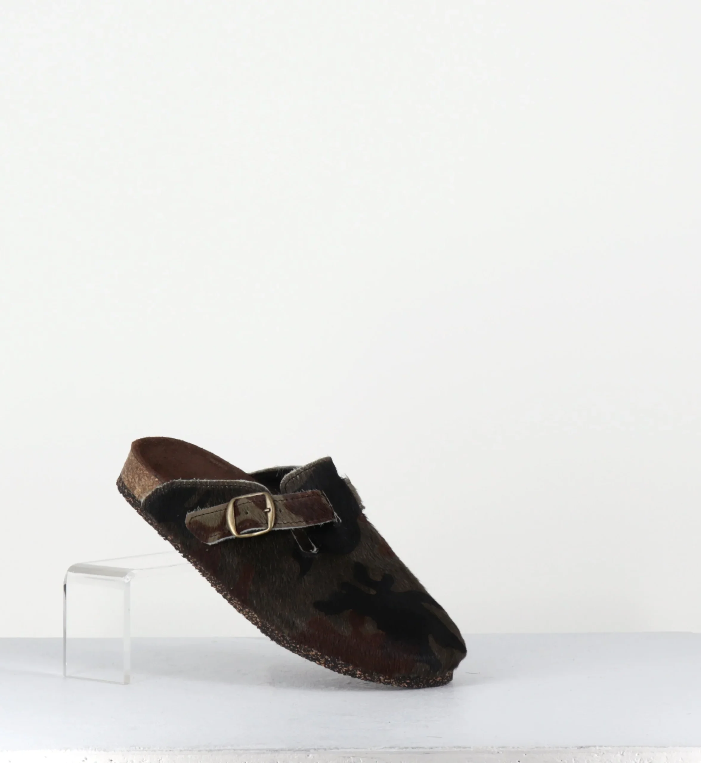 Sabots plat « poulain » -cuir de vache- imprimé camouflage khaki/noir, petite boucle réglable, semelle intérieure anatomique, semelle extérieure crêpe naturel