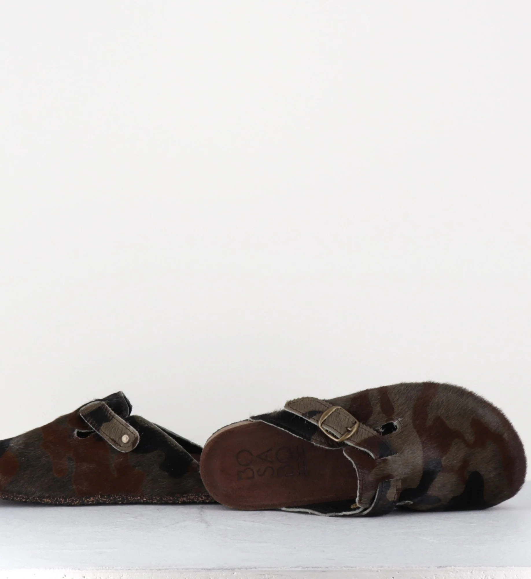 Sabots plat « poulain » -cuir de vache- imprimé camouflage khaki/noir, petite boucle réglable, semelle intérieure anatomique, semelle extérieure crêpe naturel Fabriqué dans les Ateliers de la Maison Bosabo en France. Toutes les matières sélectionnées par la Maison Bosabo sont respectueuses de l’environnement et de votre peau (sans solvant / ni chrome). Chausse normalement