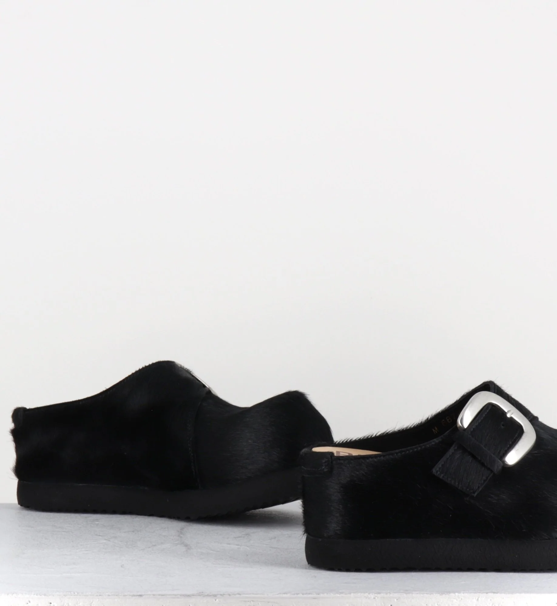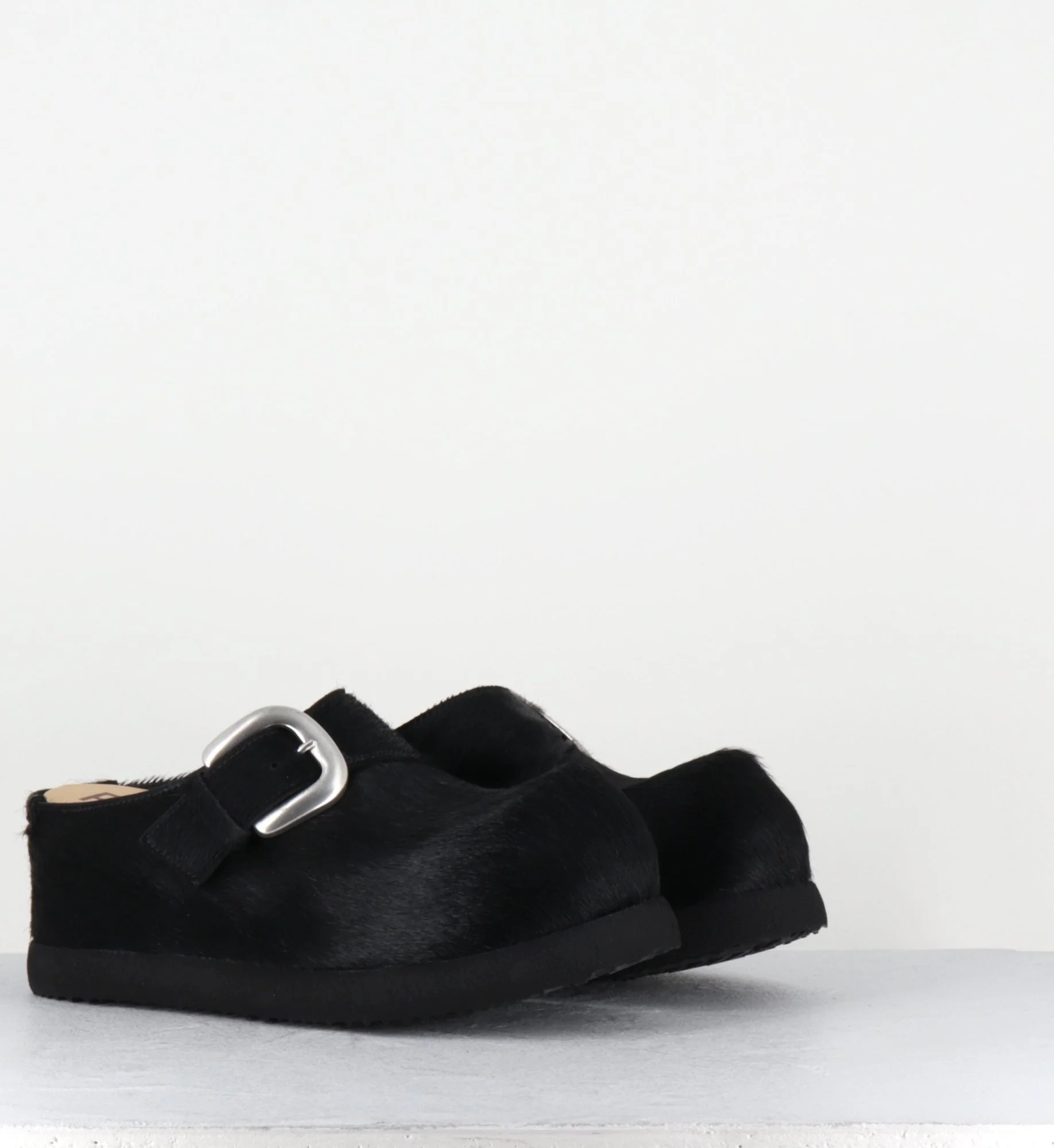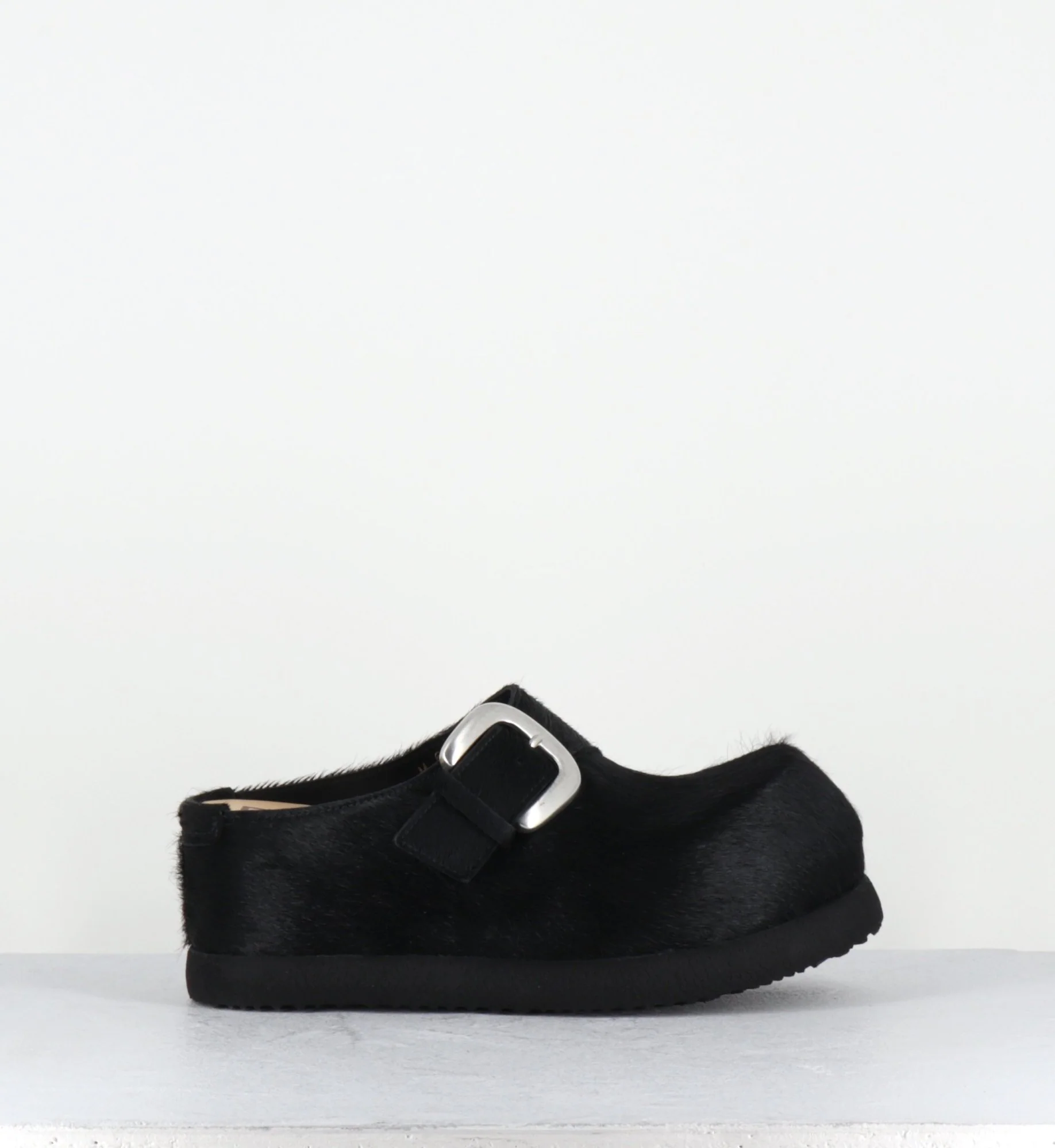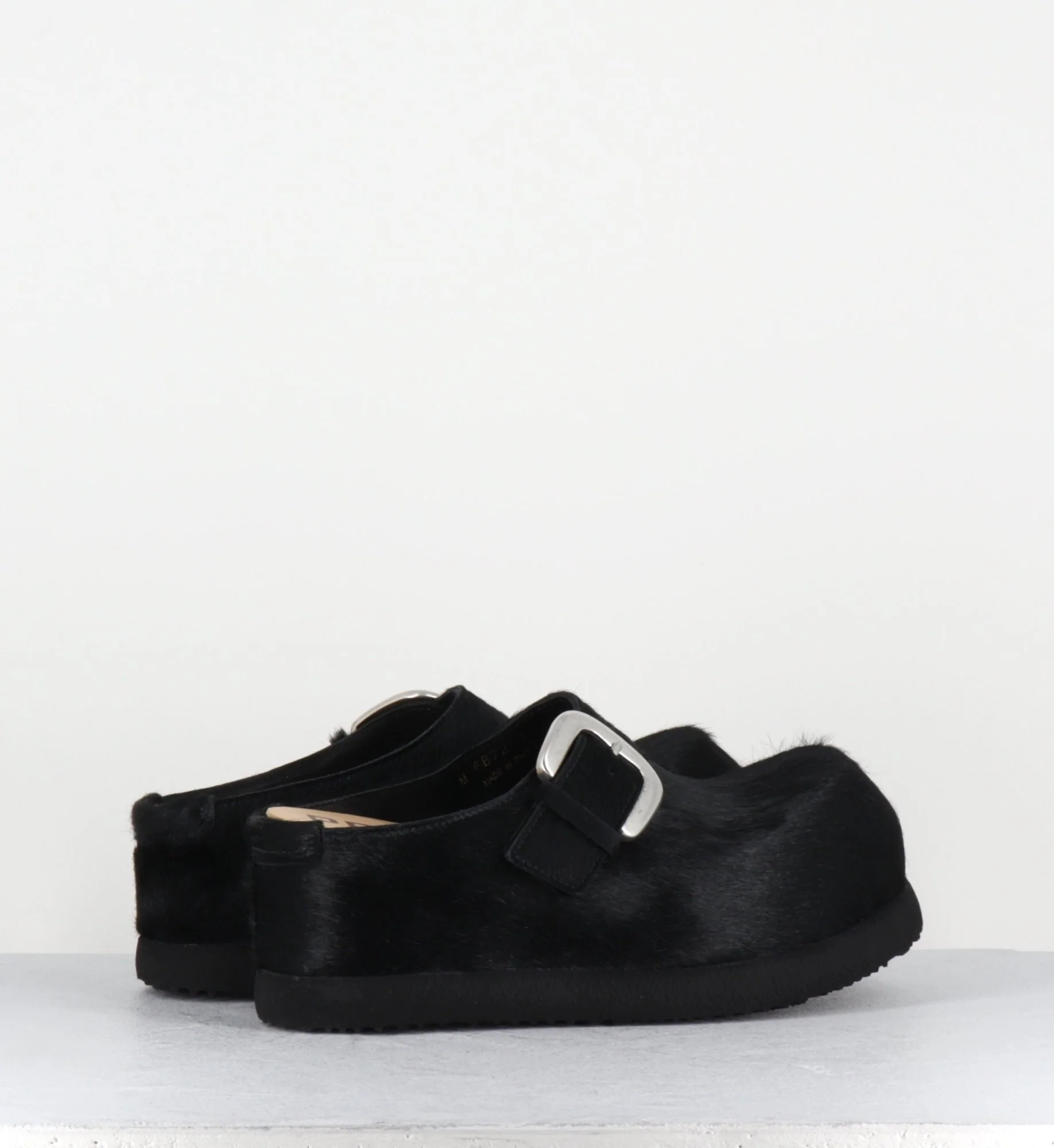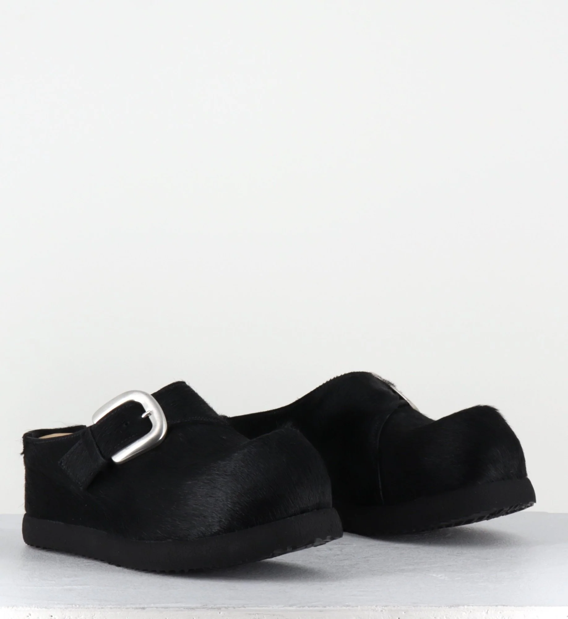 Chaussures sabots en ‘poulain’ noir, forme exagérée et déstructurée à l’avant, boucle argent mat, semelle intérieure à mémoire de forme amovible, montées sur une plateforme ultra légère et une semelle en micro-fibre