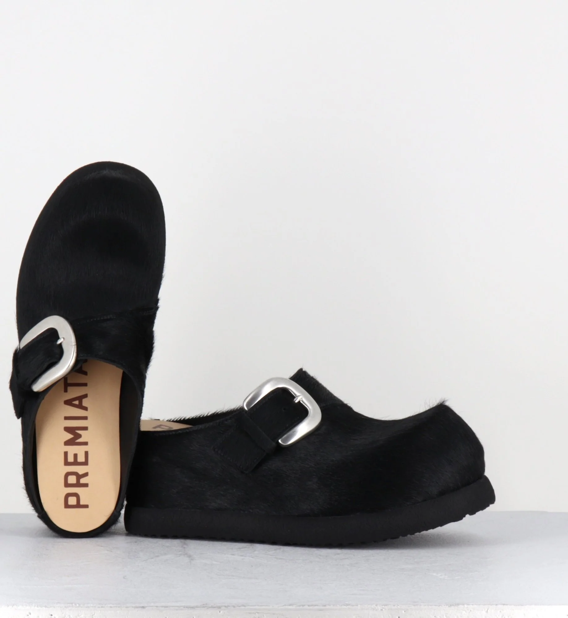 Chaussures sabots en ‘poulain’ noir, forme exagérée et déstructurée à l’avant, boucle argent mat, semelle intérieure à mémoire de forme amovible, montées sur une plateforme ultra légère et une semelle en micro-fibre Fabrication Artisanale Italienne – Ateliers Premiata Chausse légèrement grand
