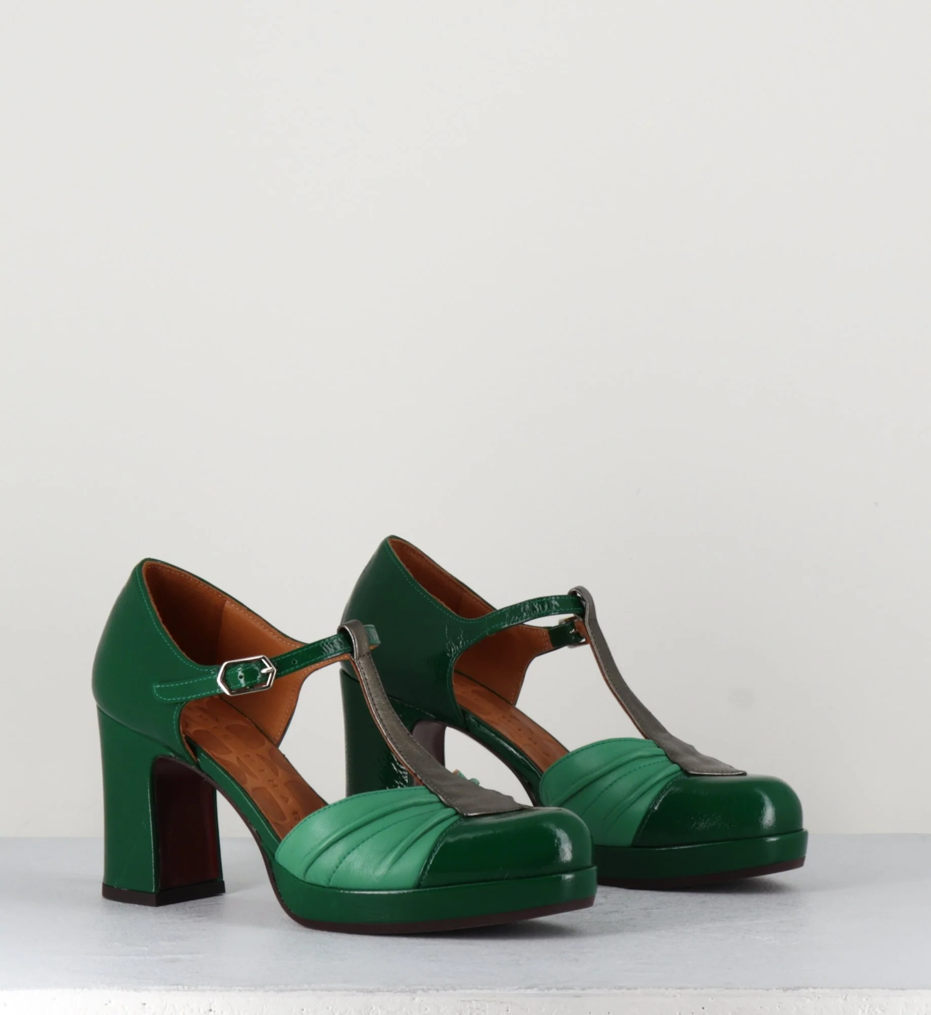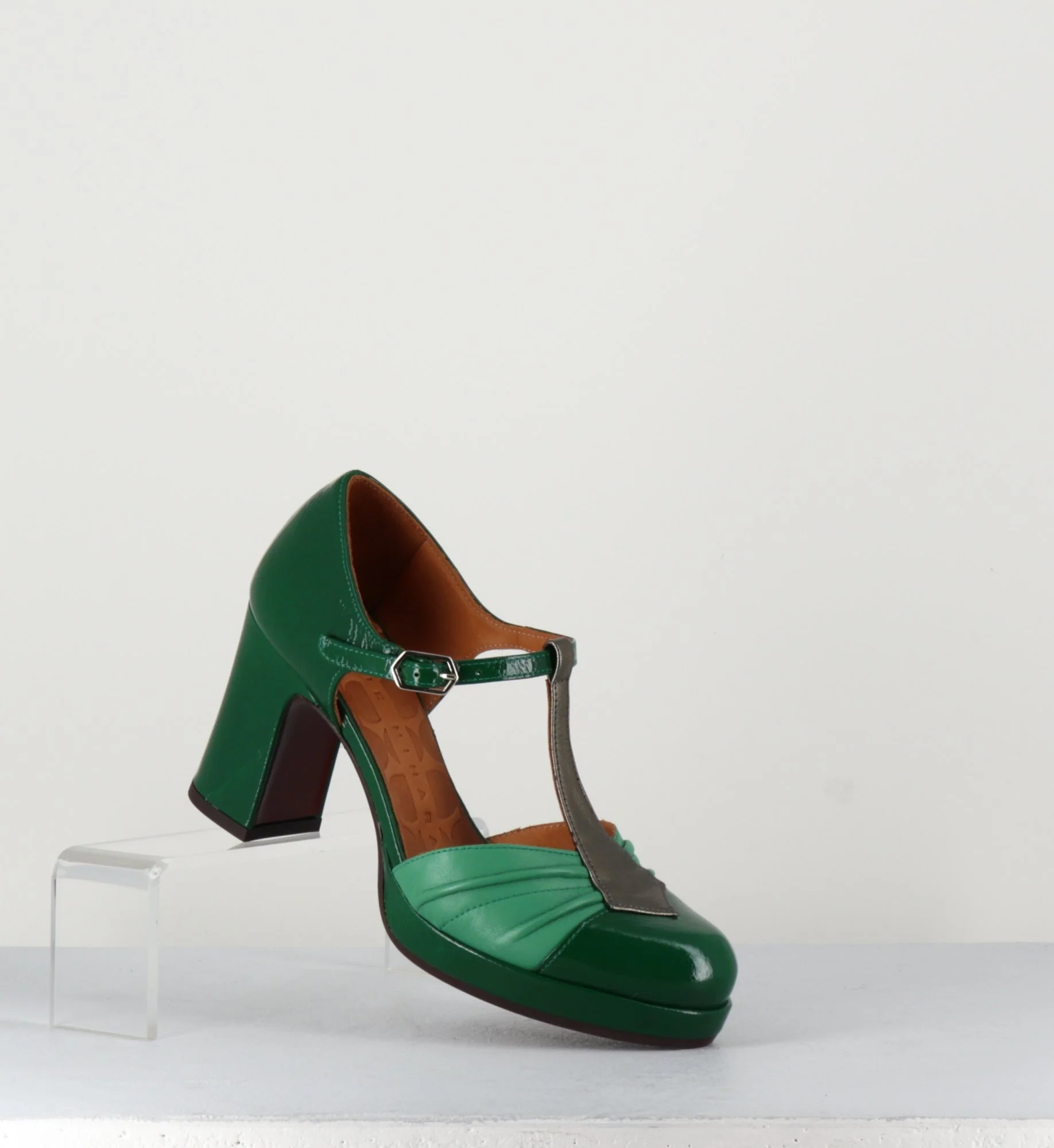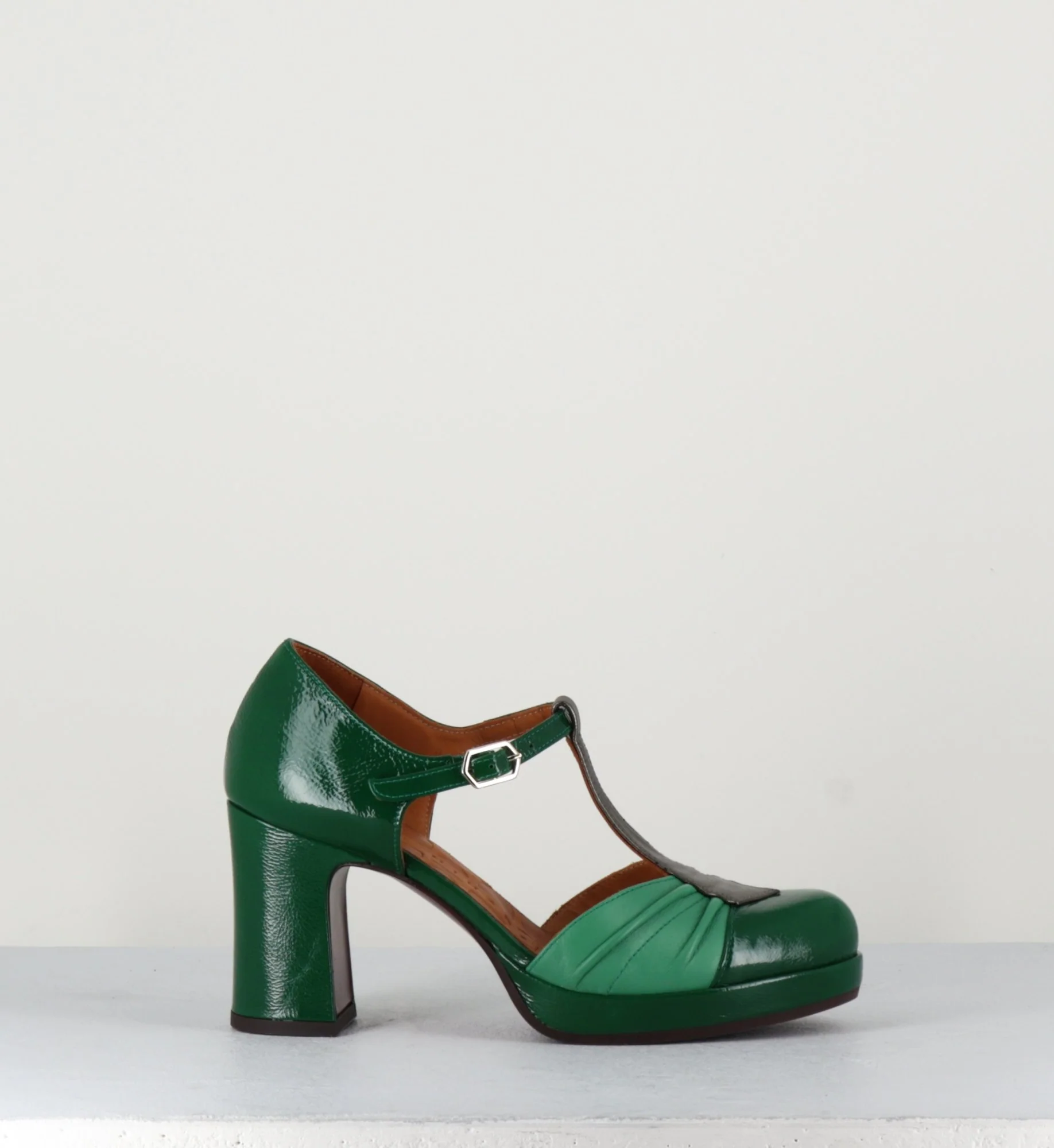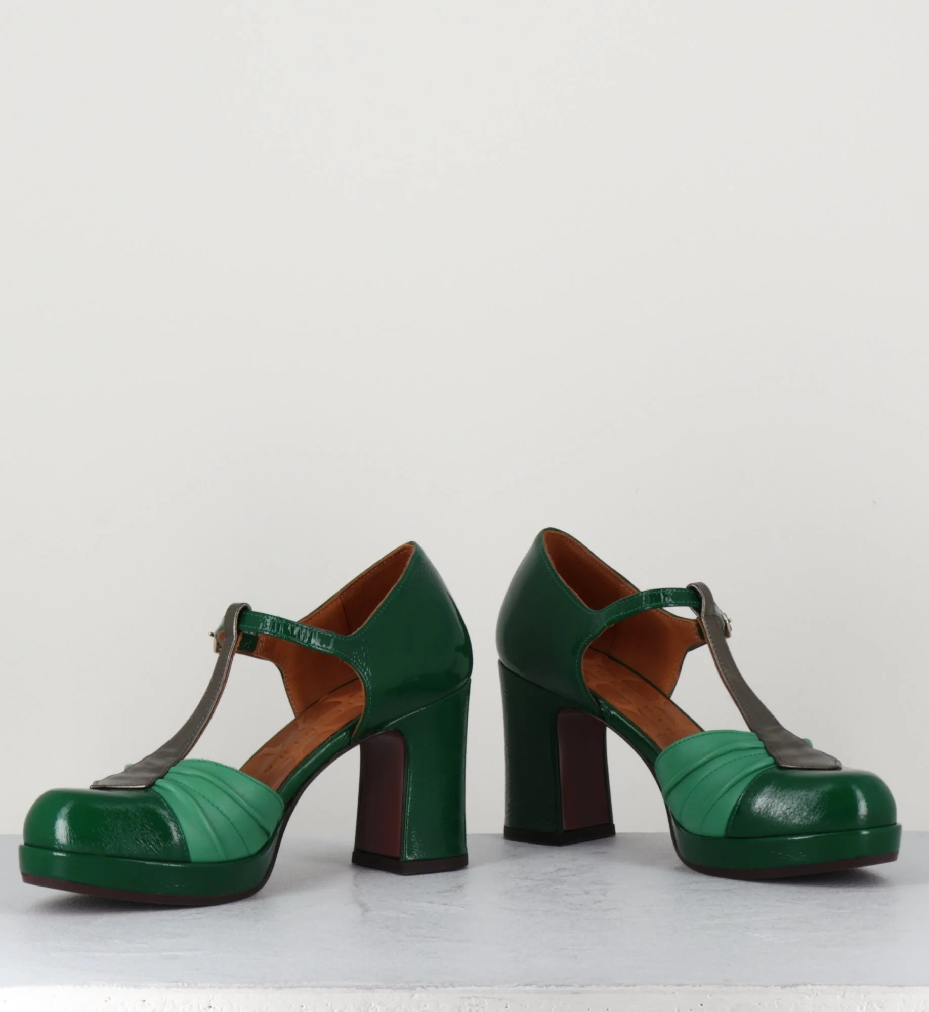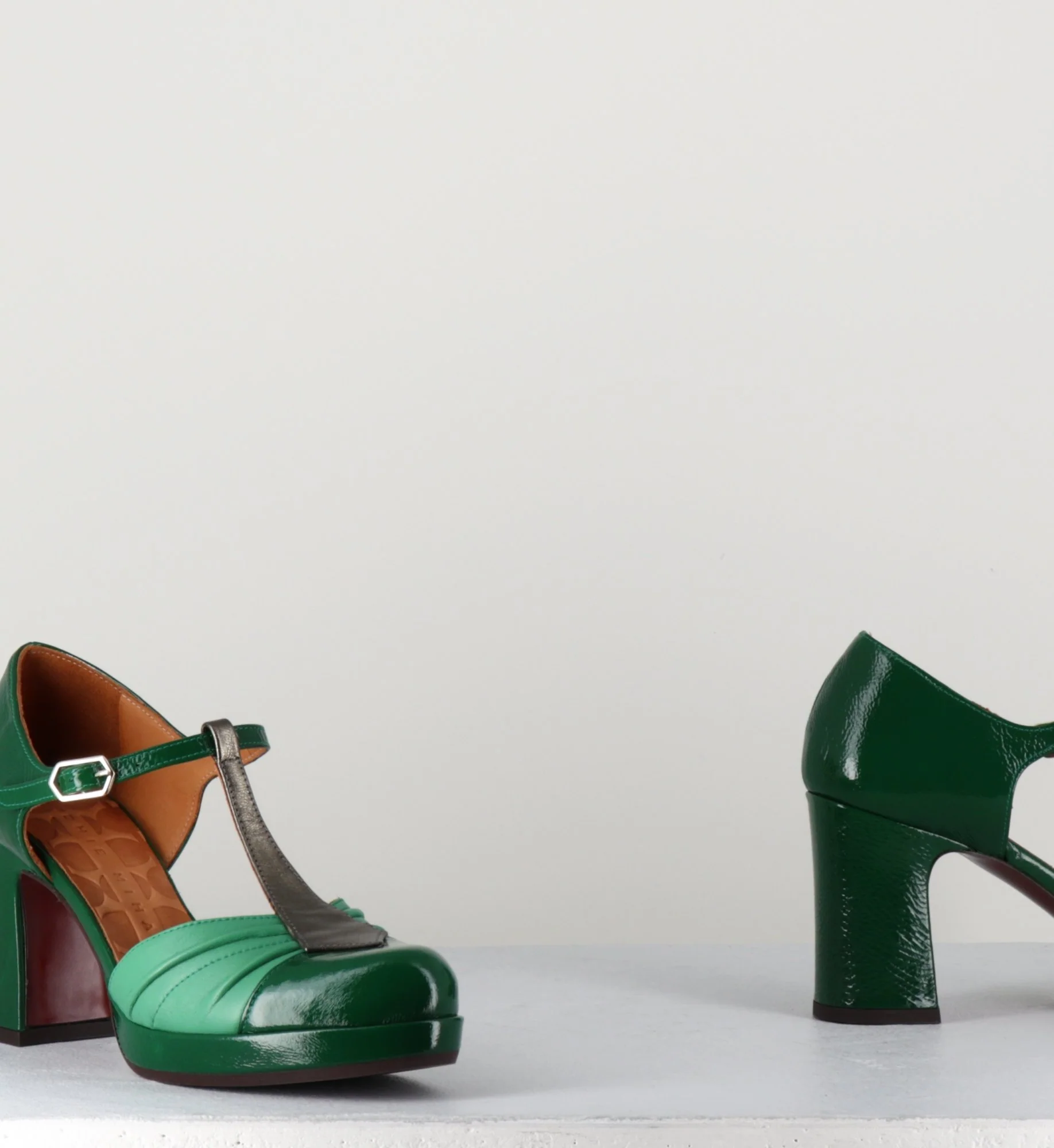 Chaussure à bride Salomé en cuir effet vernis vert foncé & vert d’eau, empeigne métallisée, montée sur une fine plateforme et un talon large confortable. Fabrication Artisanale espagnole – Ateliers Chie Mihara Chausse légèrement grand.