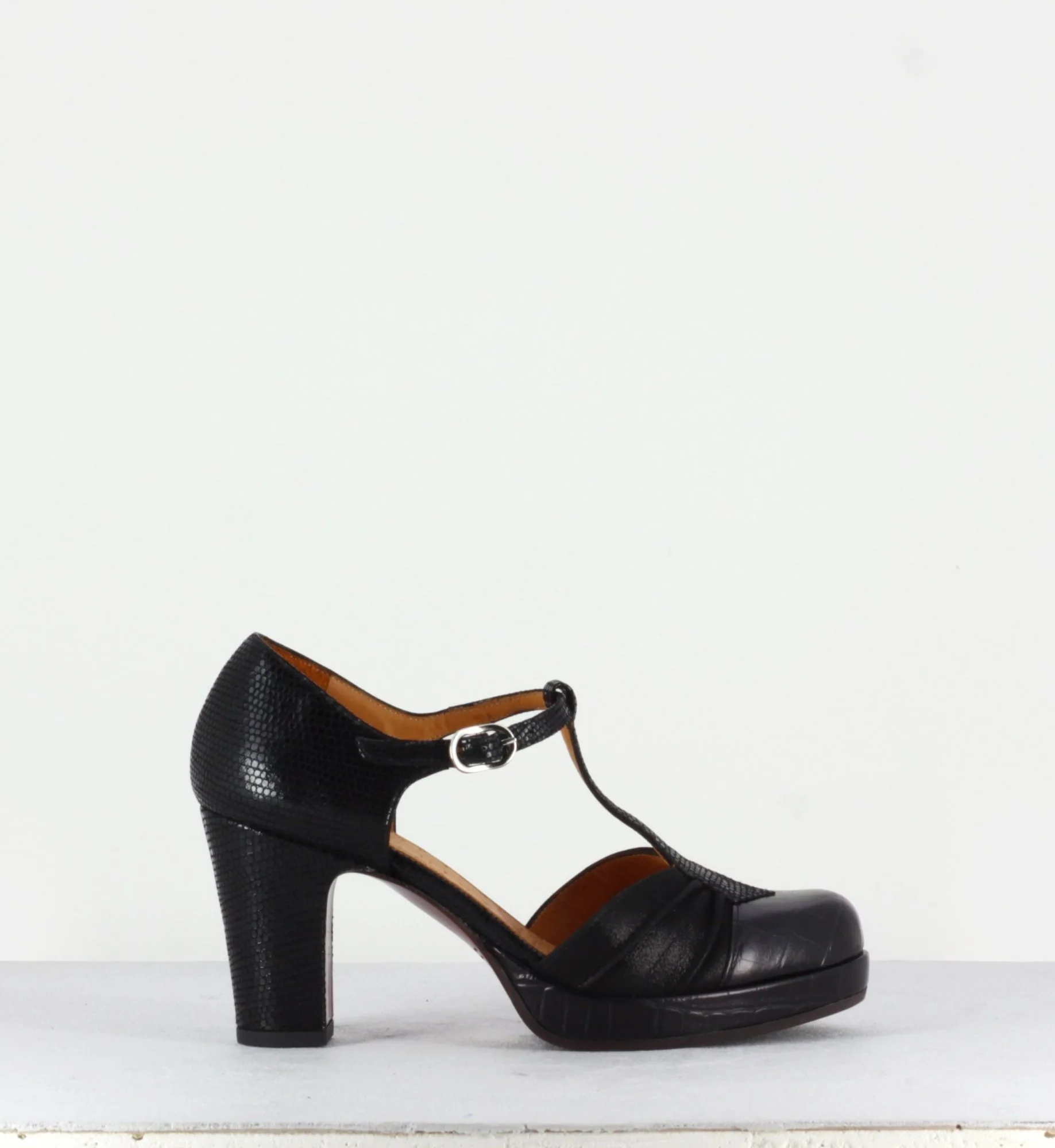 Chaussure à bride Salomé en cuir noir, montée sur une fine plateforme et un talon large.
