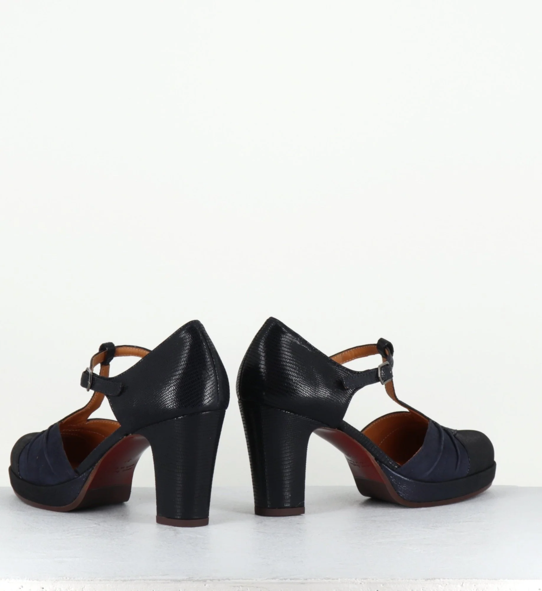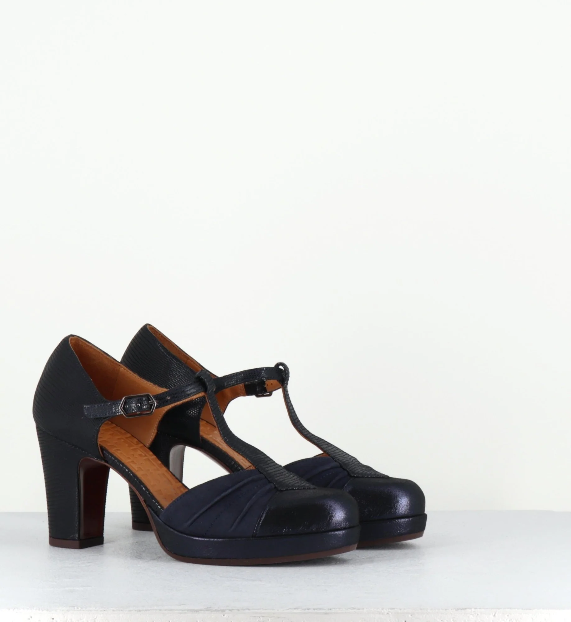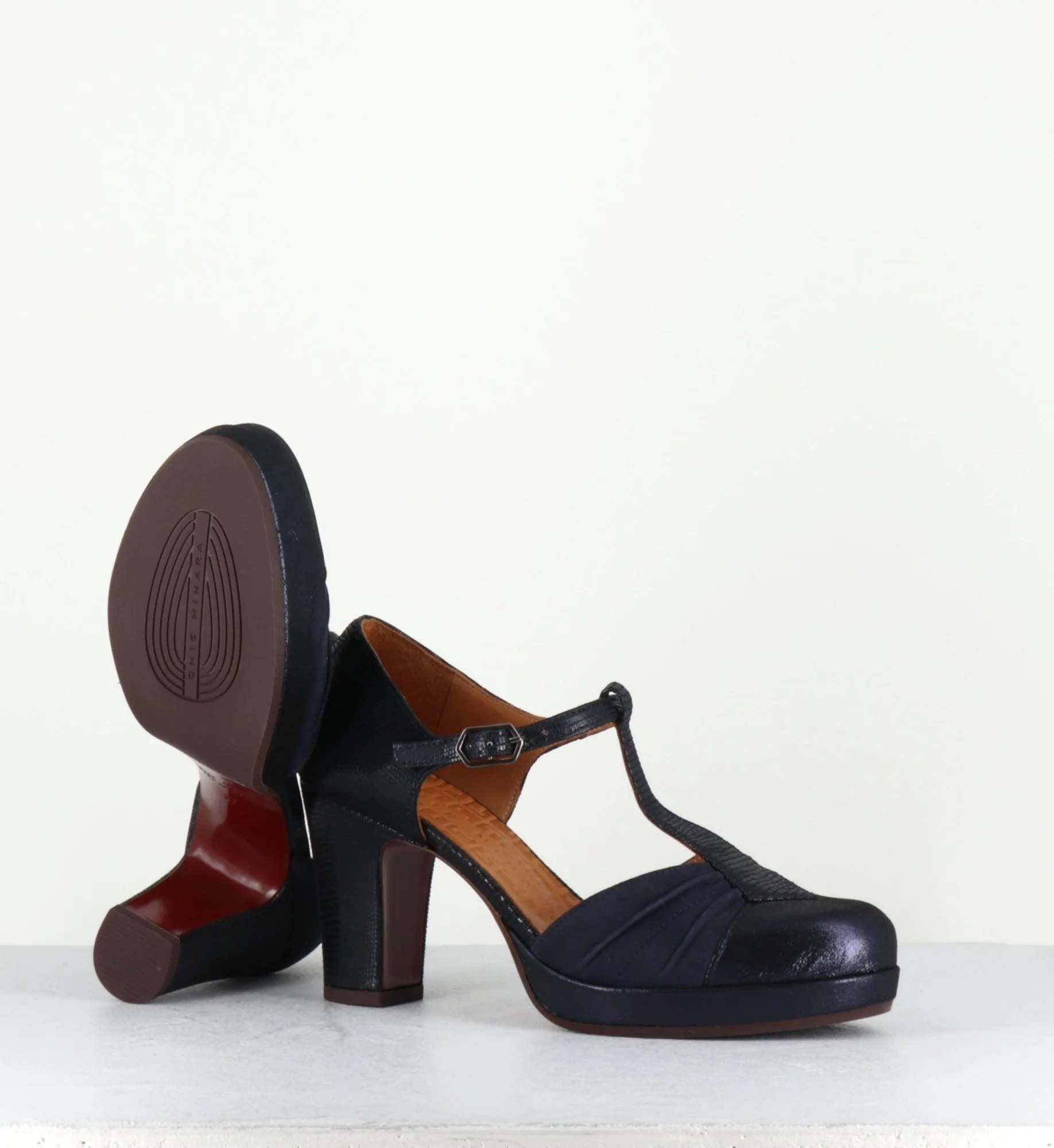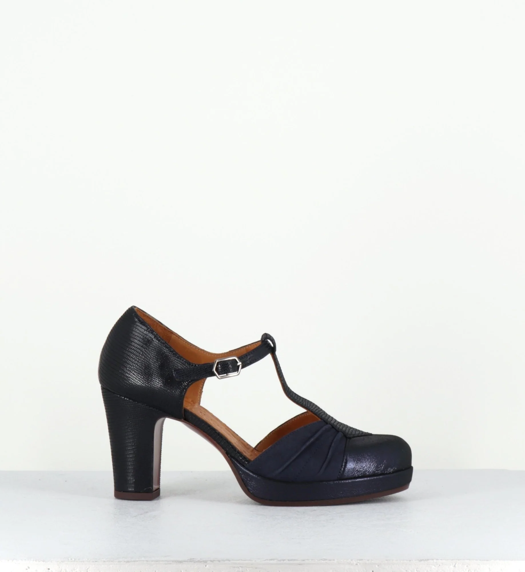 Chaussure à bride Salomé en daim bleu marine imprimé reptile à l’arrière et irisé à l’avant, montée sur une fine plateforme et un talon confortable au look rétro Fabrication Artisanale espagnole – Ateliers Chie Mihara Chausse légèrement grand