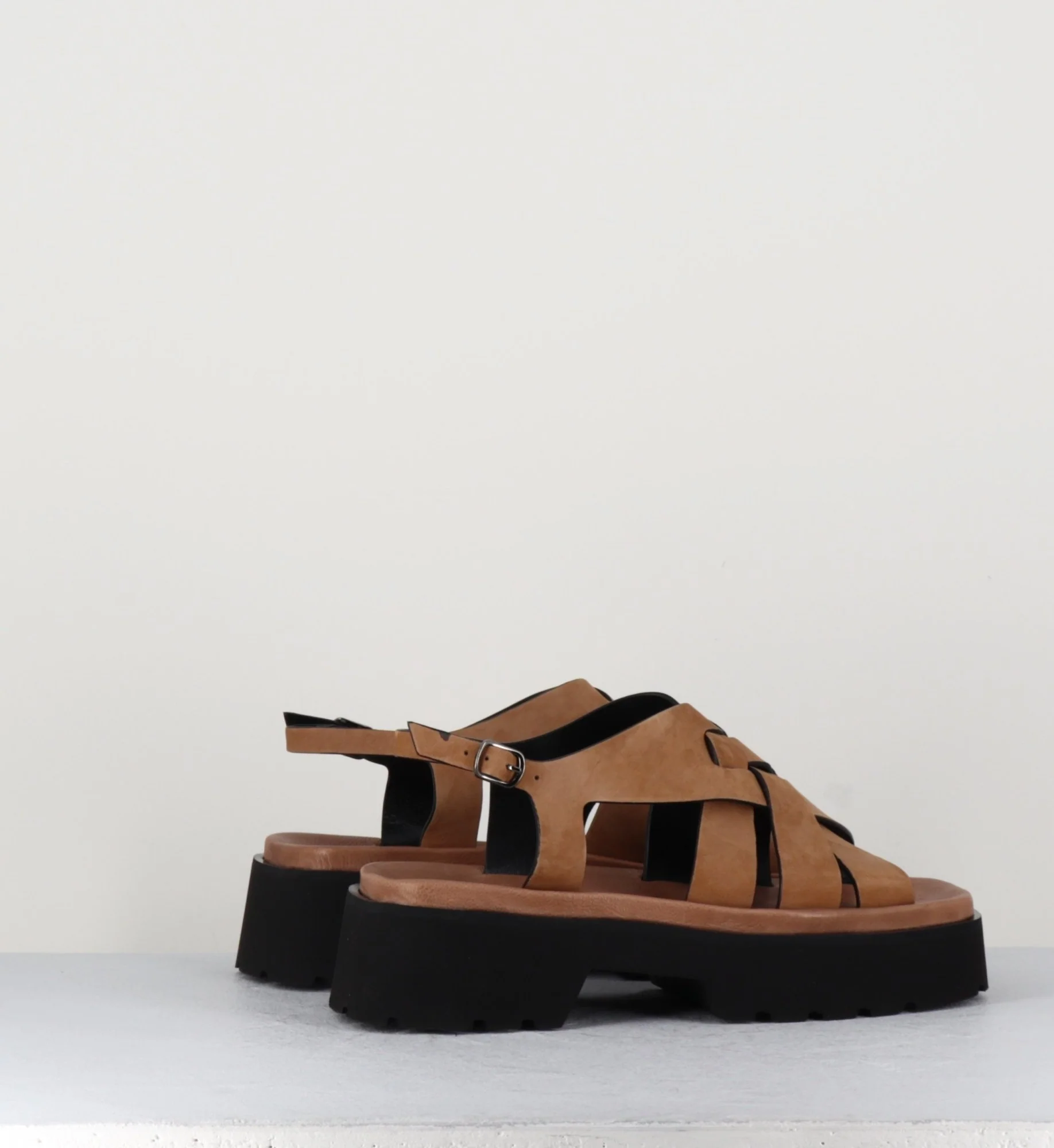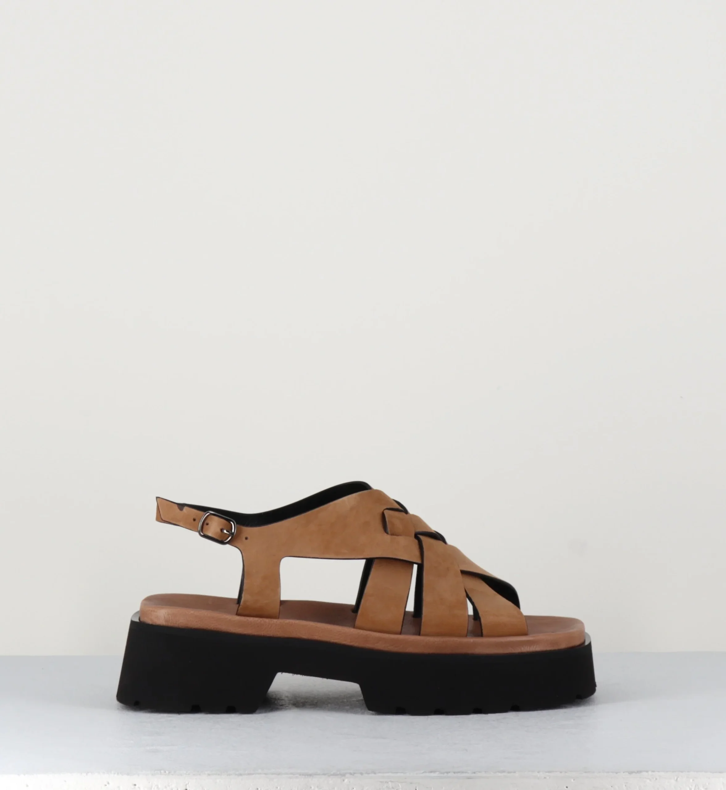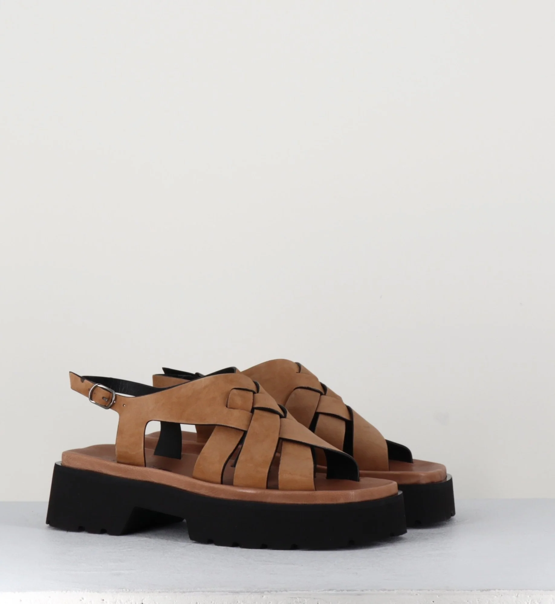 Sandales en daim camel à multi-brides tressées, bout carré, montées sur une plateforme à deux blocs ultra légère en micro-fibre à semelle légèrement crantée.