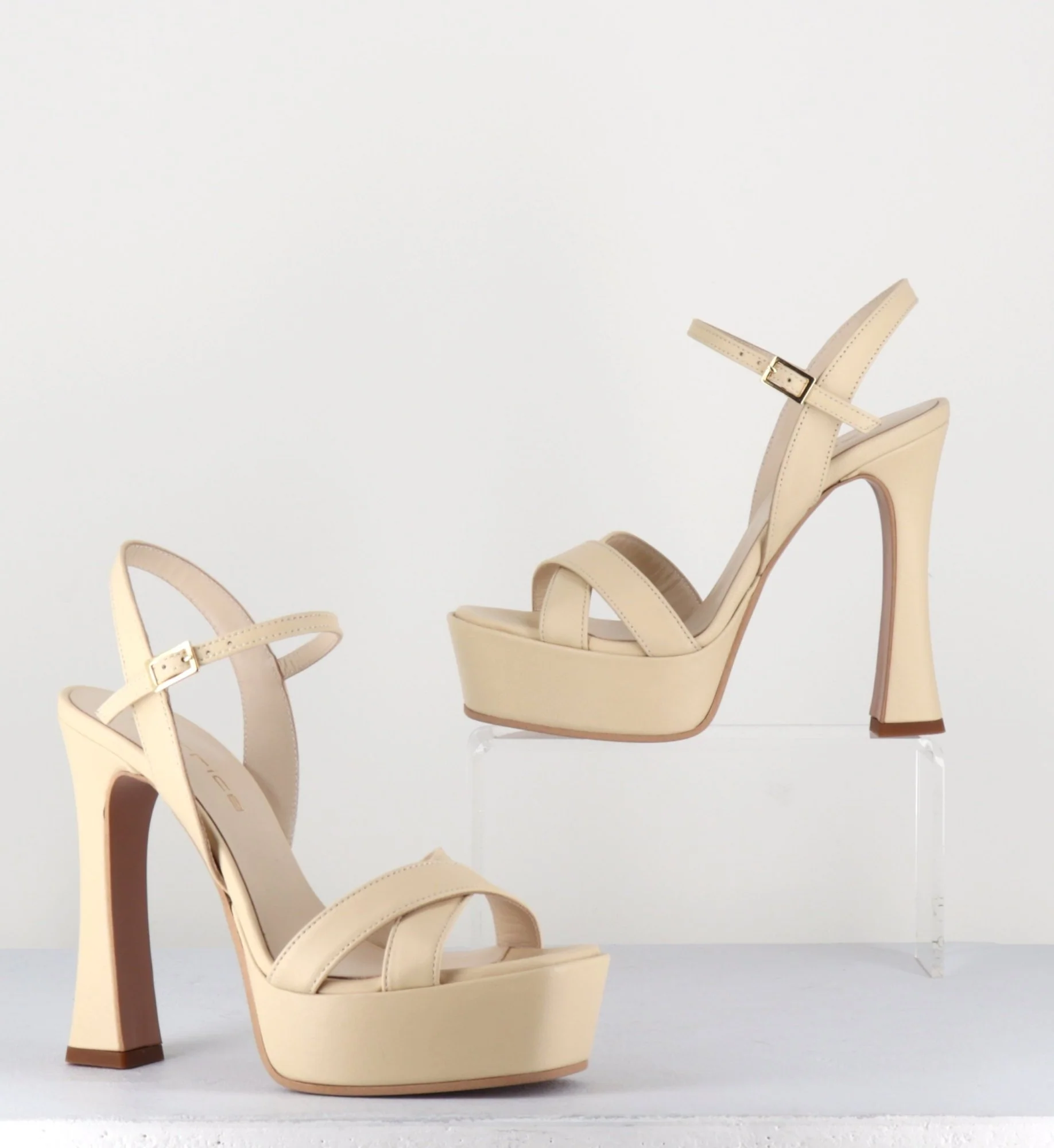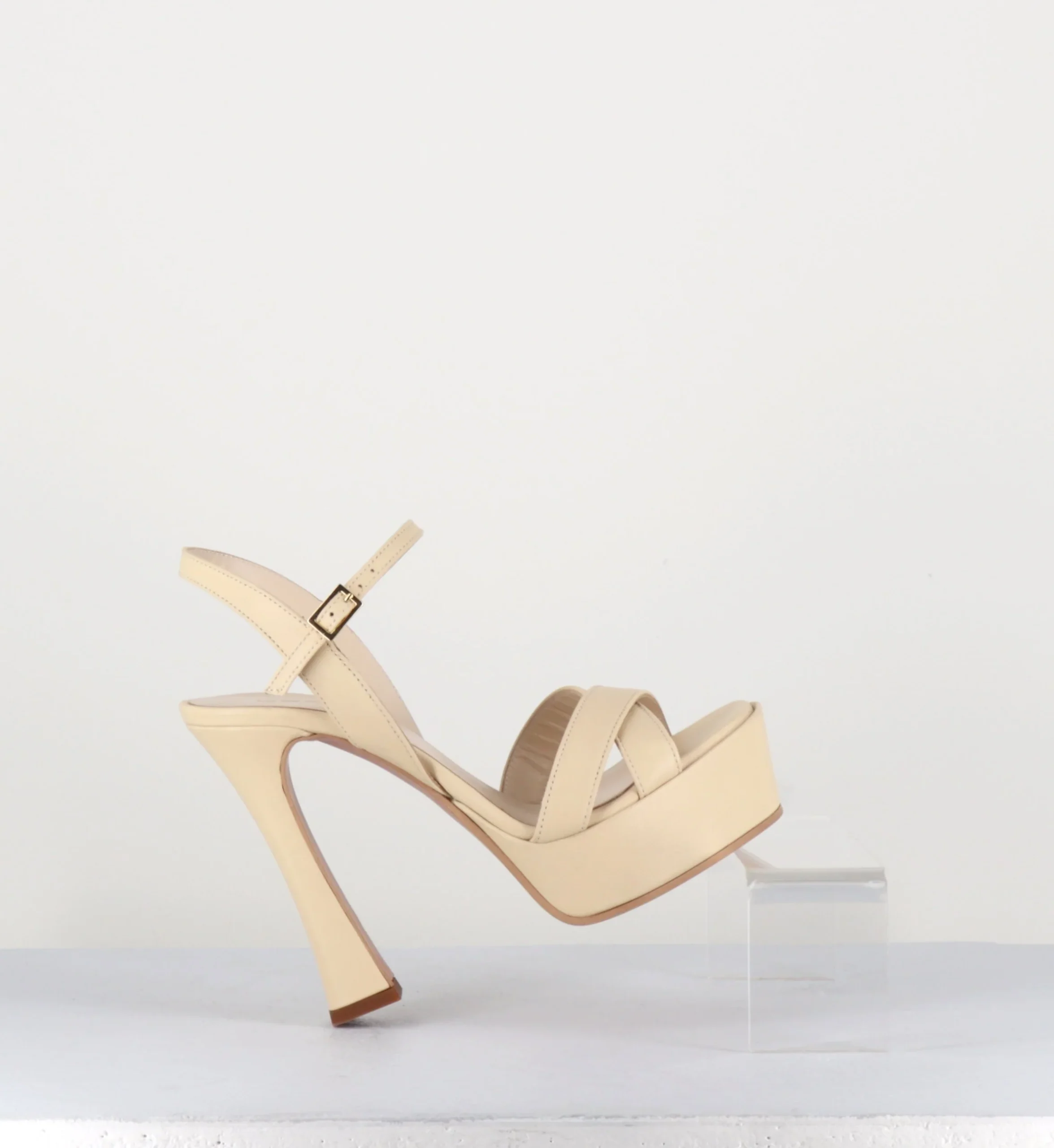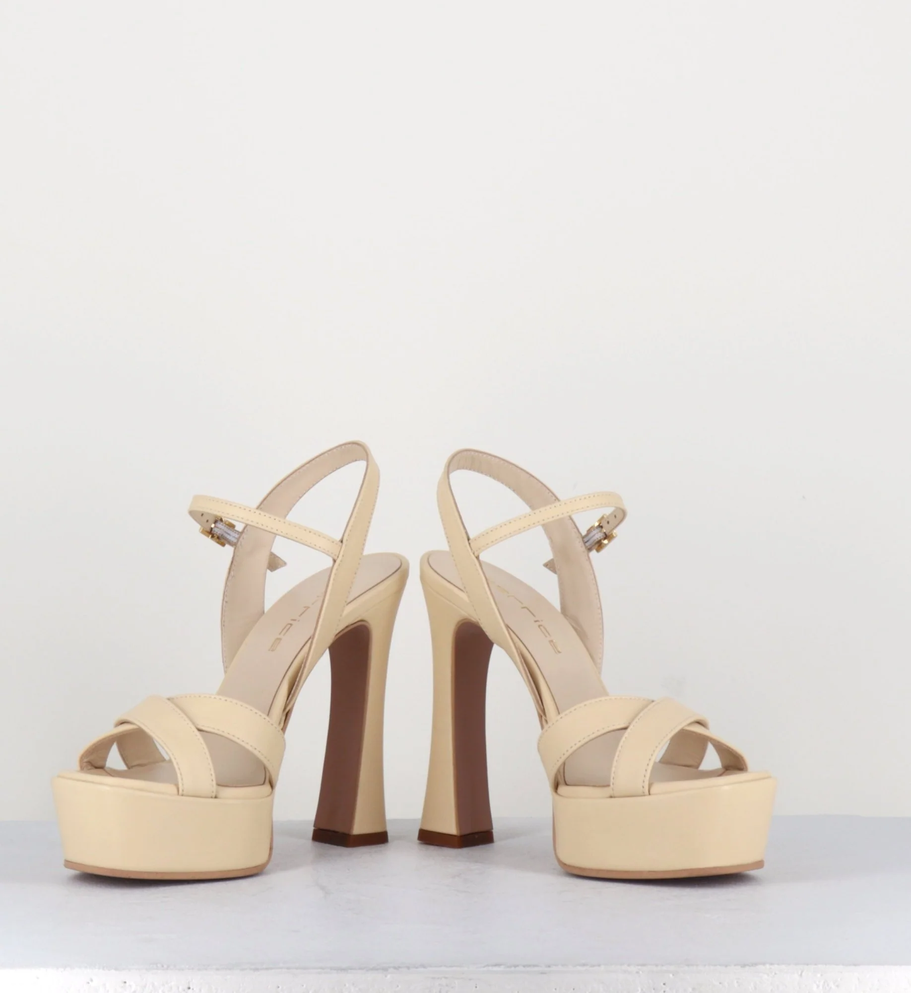 Sandales en cuir beige « nude » brides croisées, bride réglable, bout carré, montées sur une large plateforme et un talon haut légèrement évasé recouverts. Fabrication Artisanale Italienne Chausse légèrement grand.