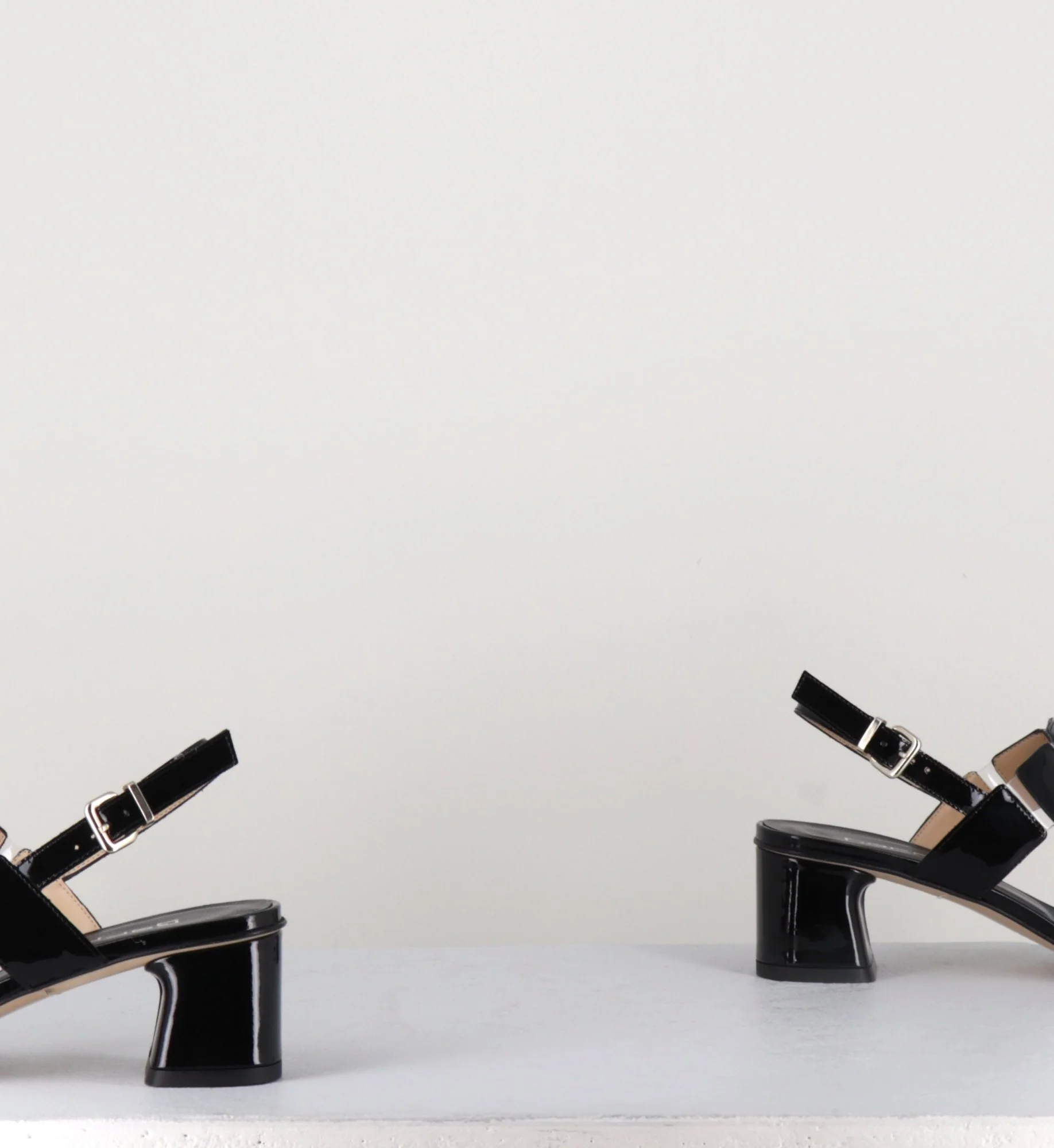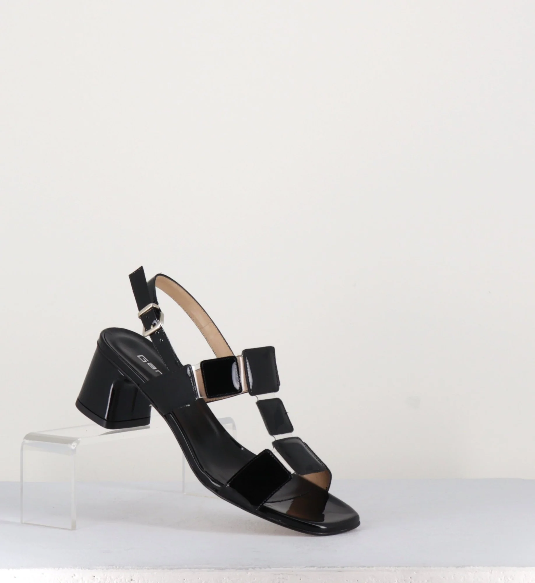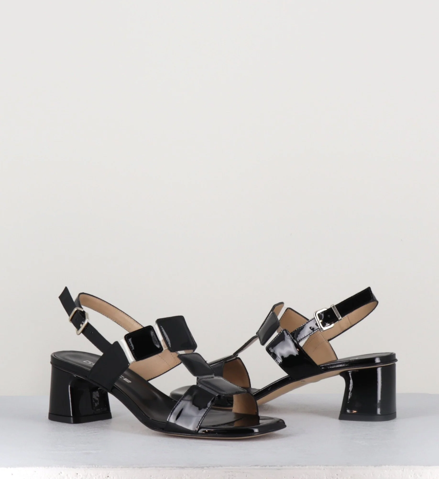 Sandales à bout carré et petit talon en cuir vernis noir, confectionnées à la main dans nos ateliers Italiens. Sur le cou-de-pied sont disposés 3 petits carrés maintenus par de fines bandes de PVC transparent. 60s rétro chic!