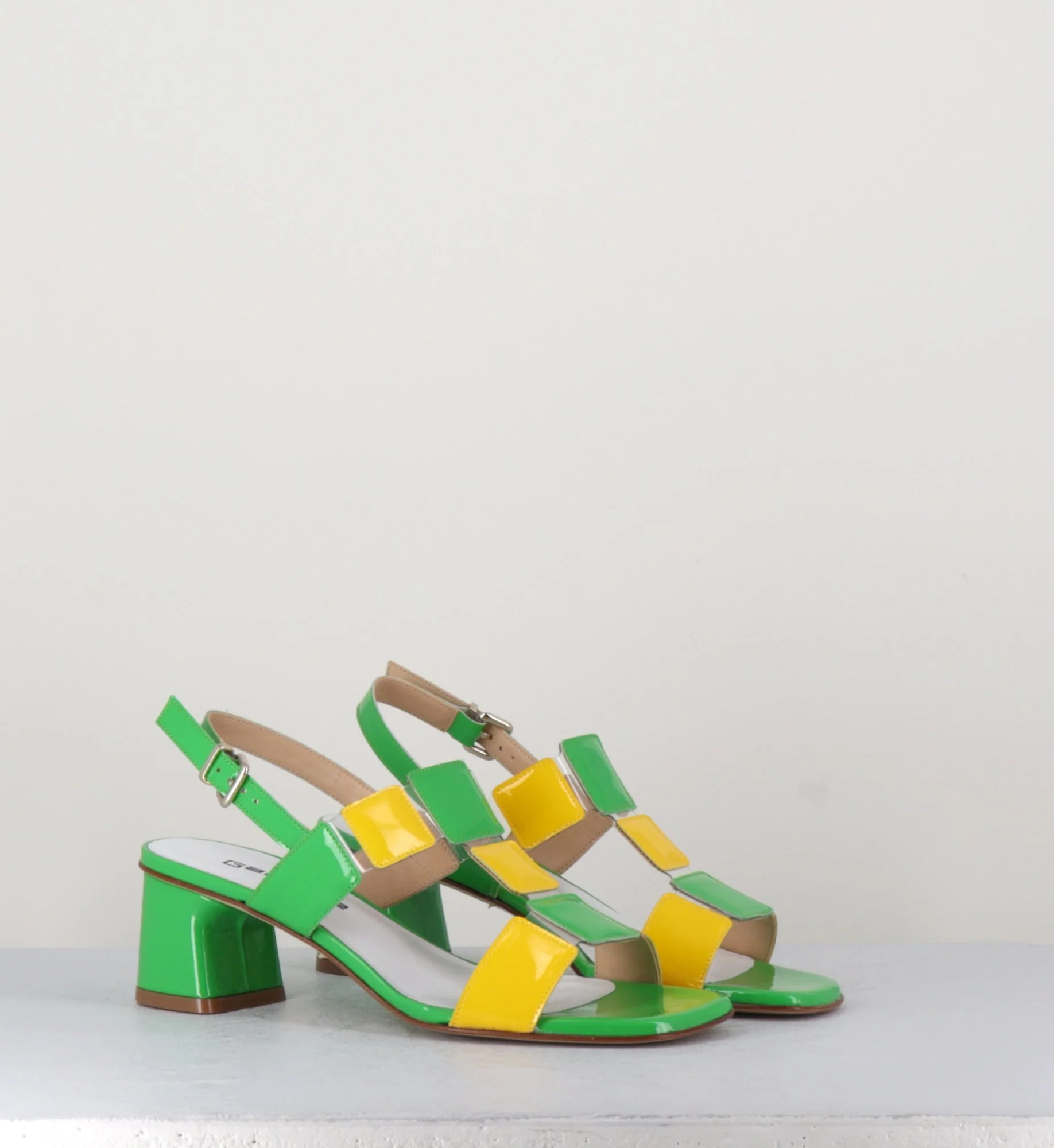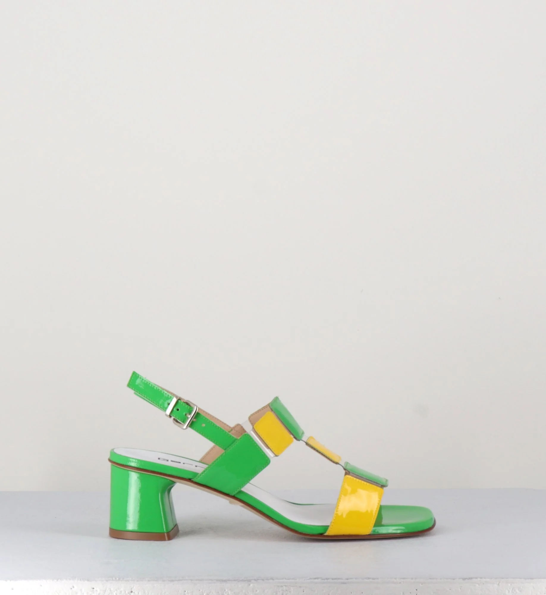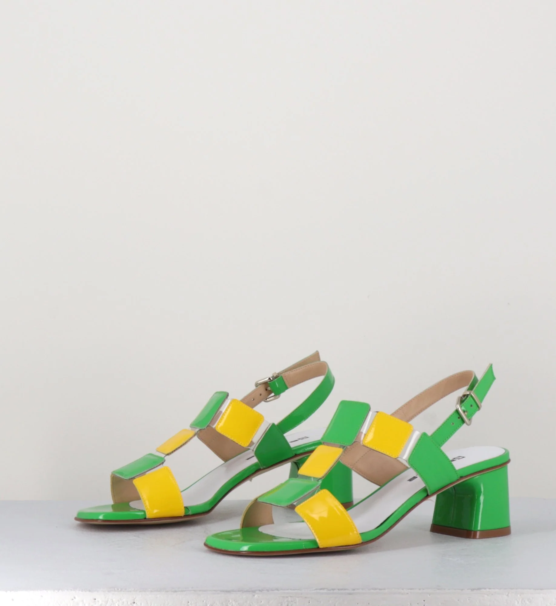 Sandales 60s bout carré en cuir vernis vert&jaune – 604 GREEN YELLOW