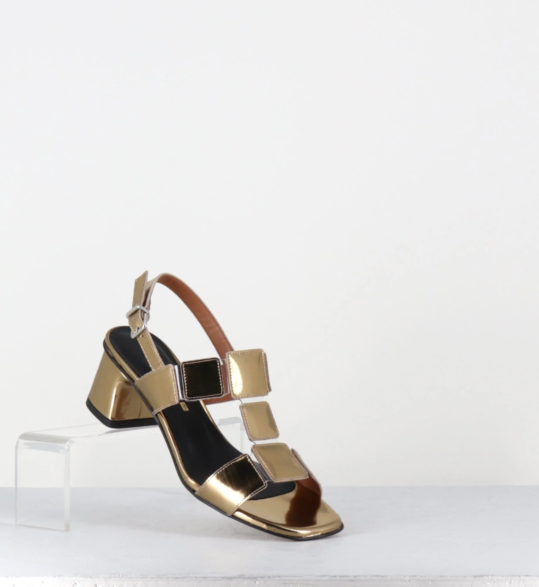 Sandales à bout carré et petit talon en cuir miroir argent, confectionnées à la main dans nos ateliers Italiens. Sur le cou-de-pied sont disposés 3 petits carrés maintenus par de fines bandes de PVC transparent. 60s rétro chic !