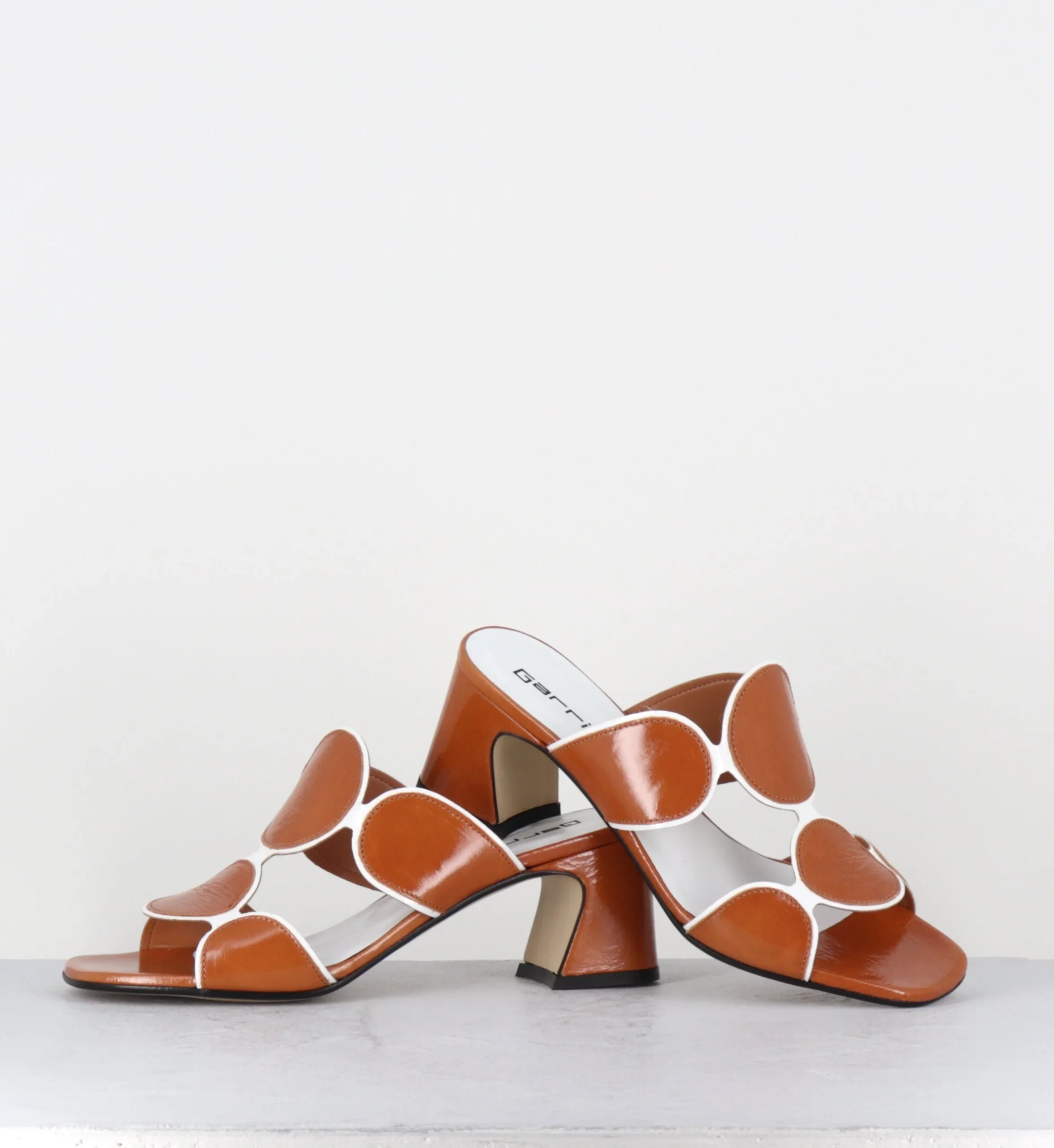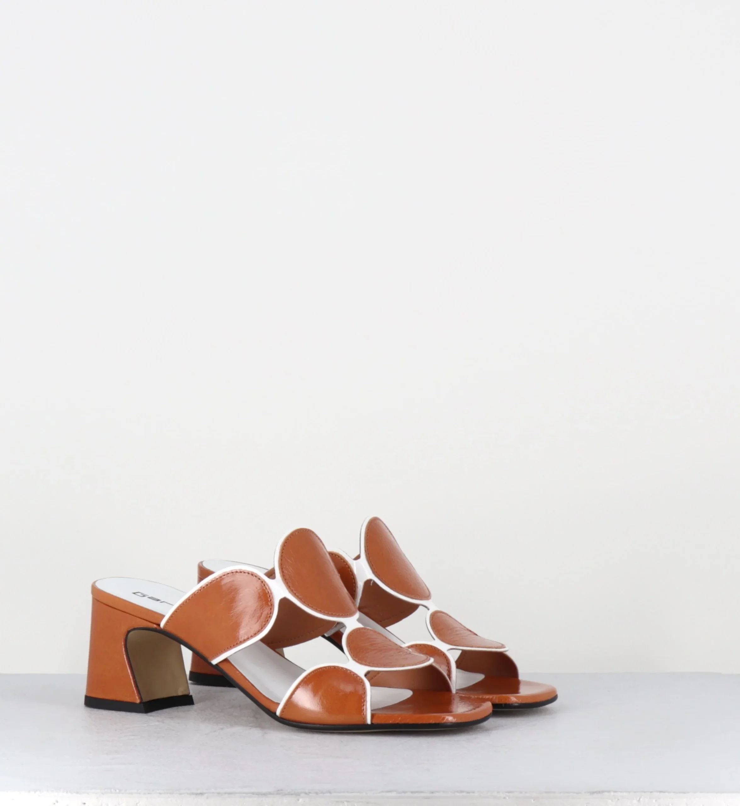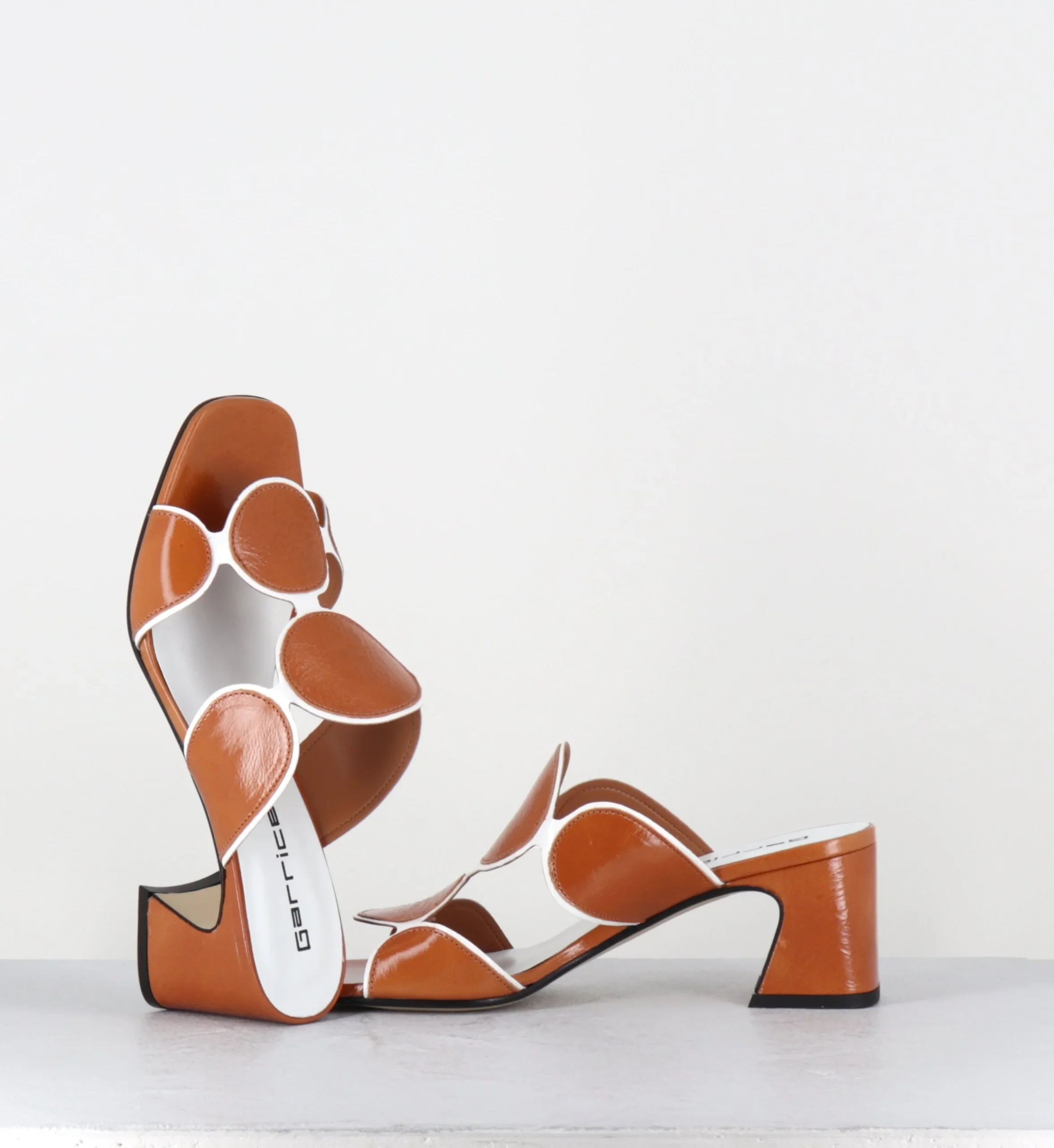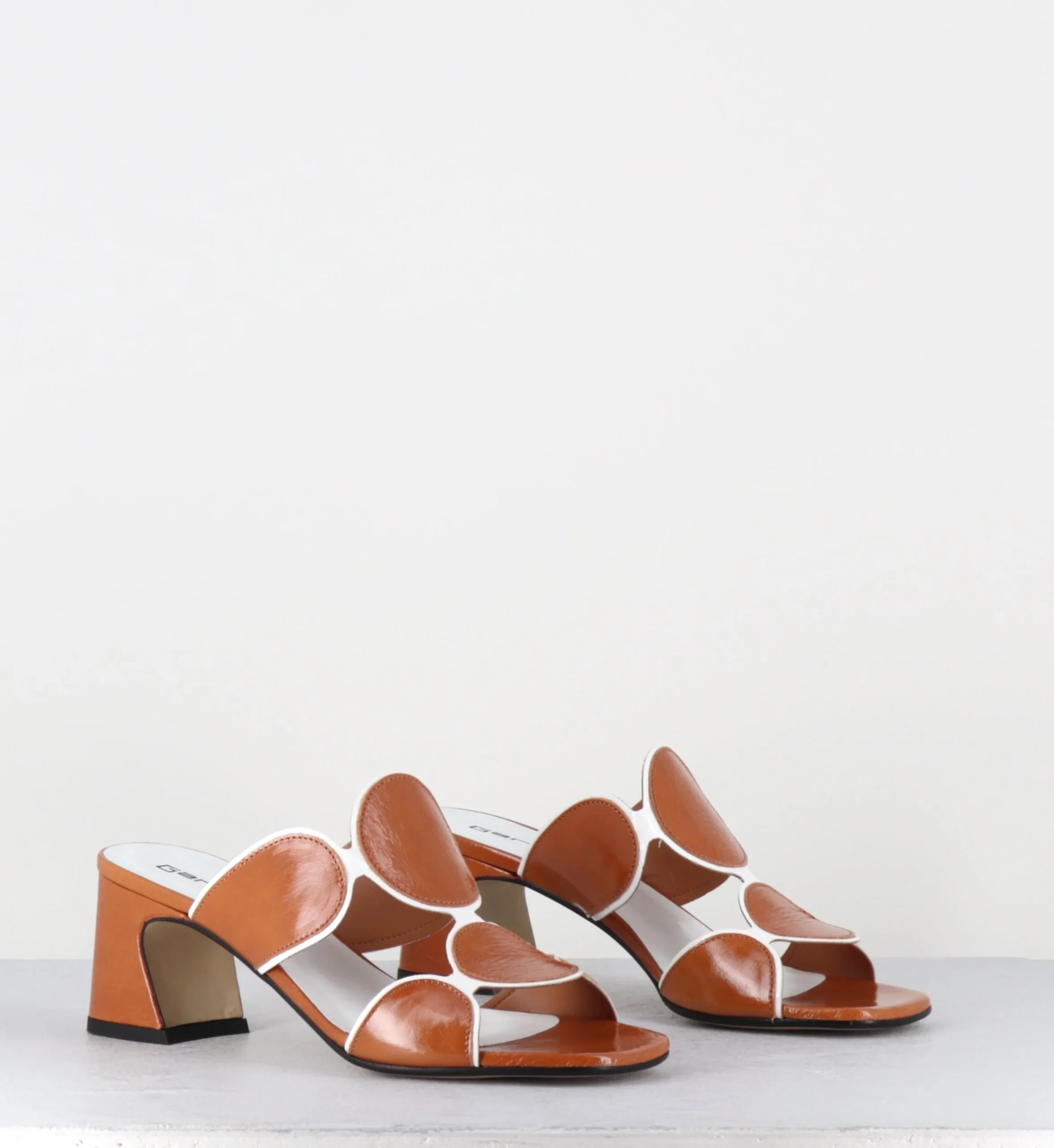 Sandales – mules en cuir effet froissé camel, design géométrique esprit 60s fait de ronds entourés d’un liseré vernis blanc & montées sur un talon stylisé confortable Fabrication Artisanale Italienne – Ateliers GarriceLab Chausse normalement