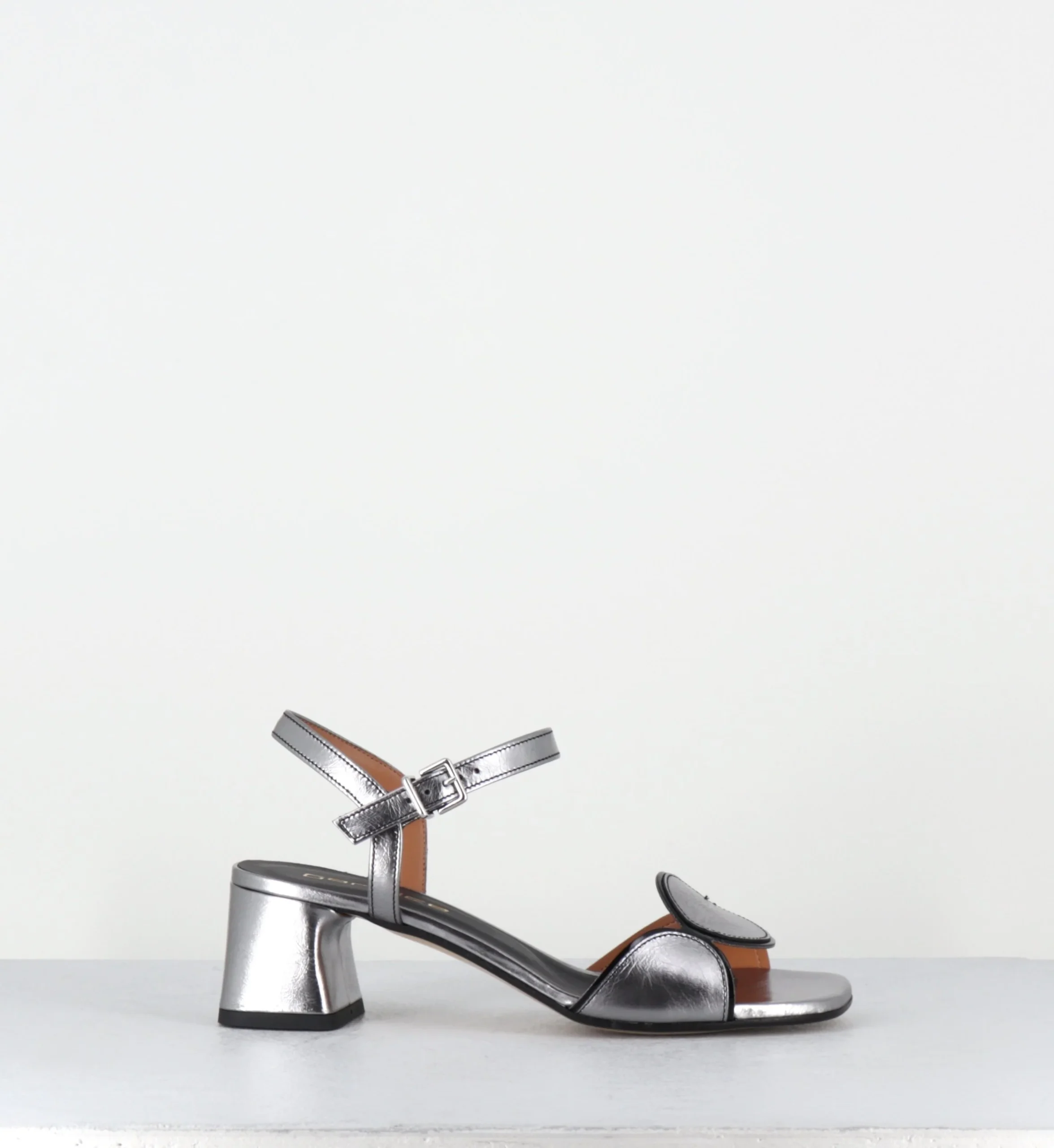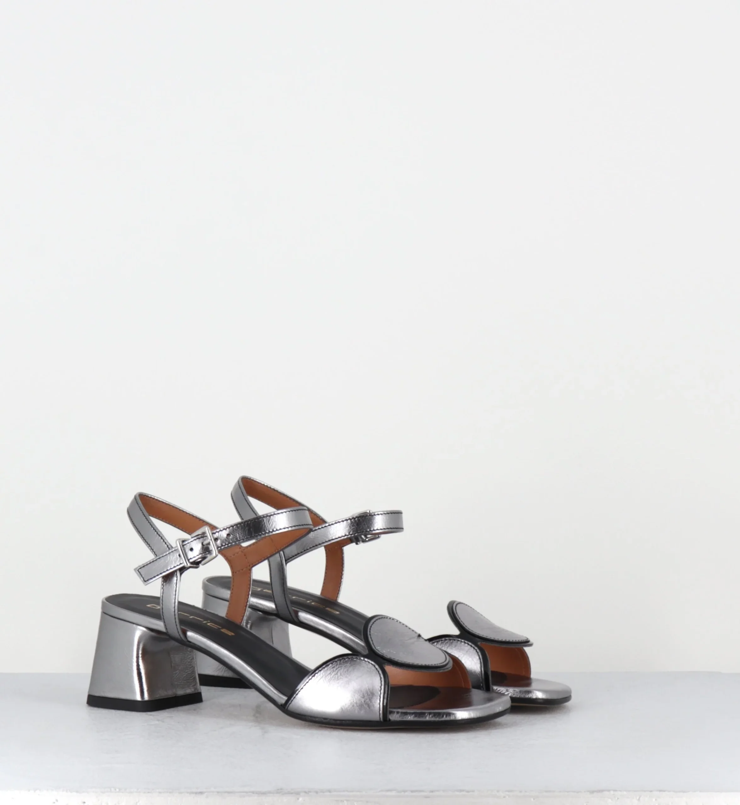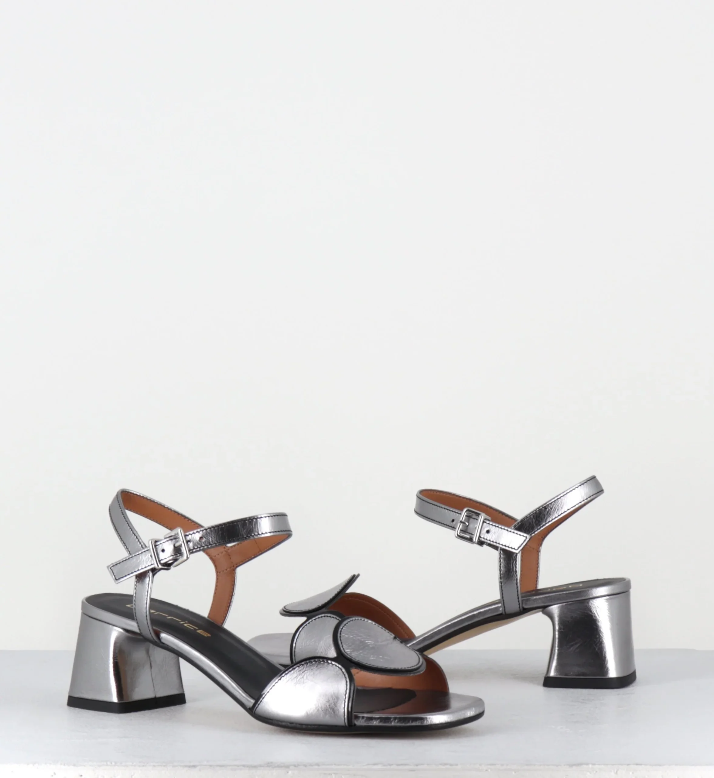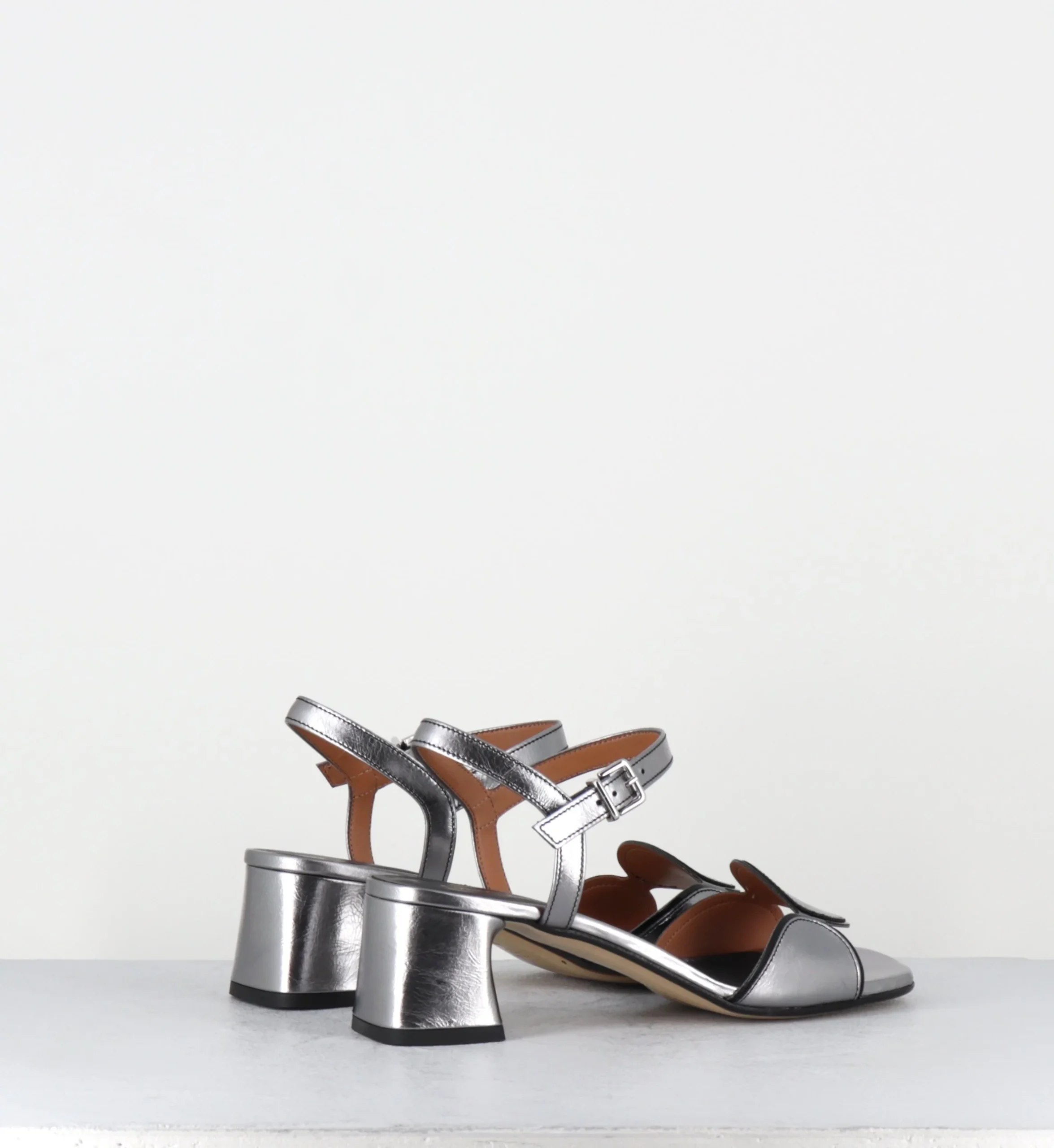 Sandales en cuir métallisé argent sombre, design géométrique esprit 60s souligné d’un liseré noir & montées sur un talon stylisé confortable