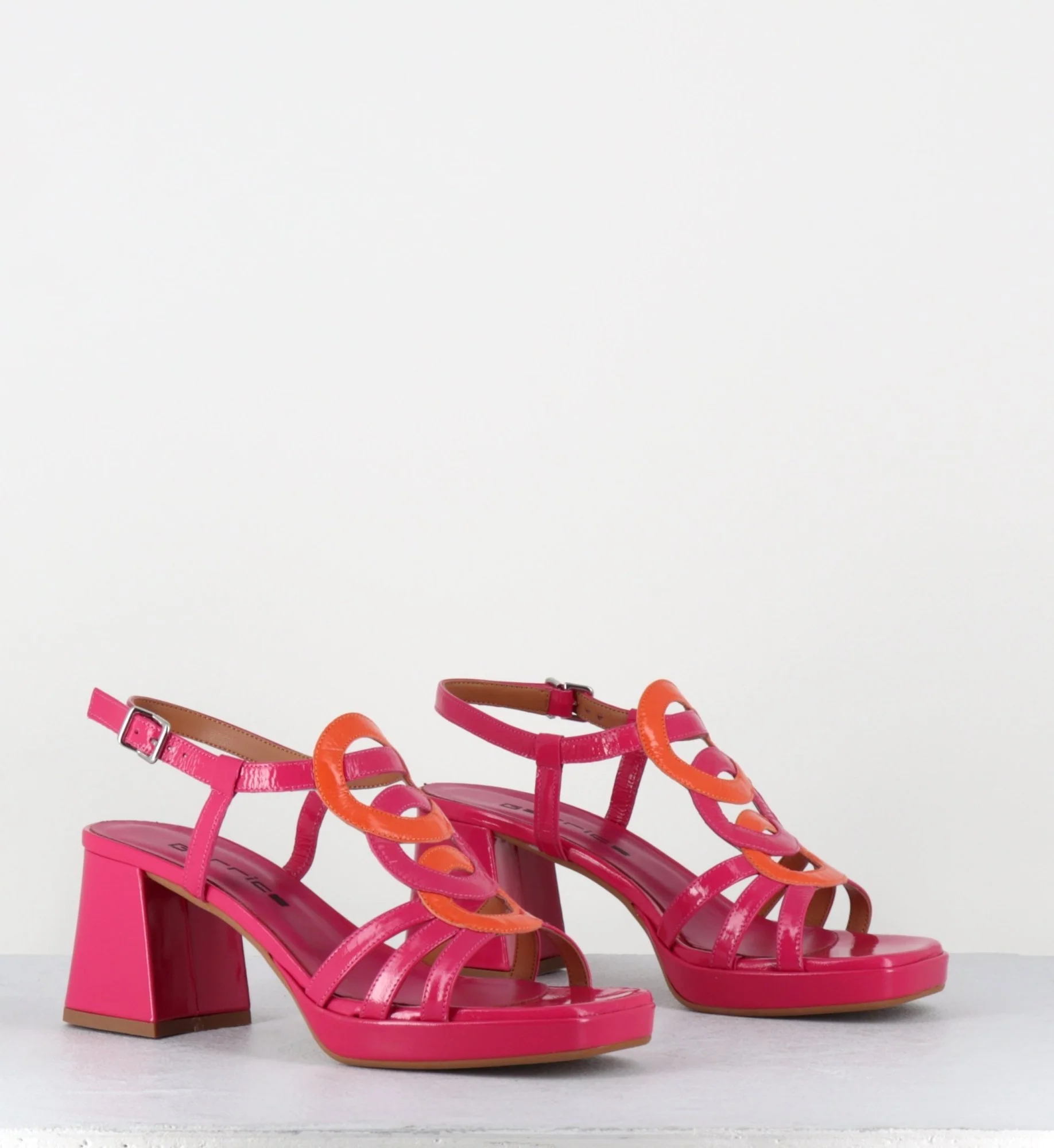 Sandales bout carré esprit 70s en cuir vernis fuchsia et orange, design géométrique rétro à l’avant, bride arrière réglable, montées sur un talon bloc légèrement évasé et une fine plateforme confortable