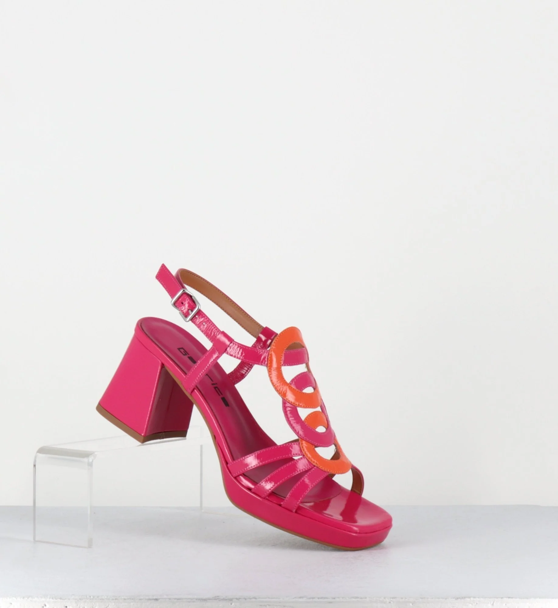 Sandales bout carré esprit 70s en cuir vernis fuchsia et orange, design géométrique rétro à l’avant, bride arrière réglable, montées sur un talon bloc légèrement évasé et une fine plateforme confortable Fabrication Artisanale Italienne – Ateliers GarriceLab Chausse légèrement grand