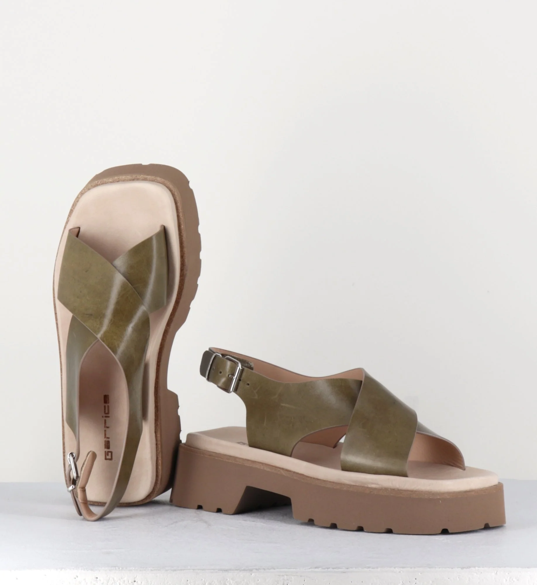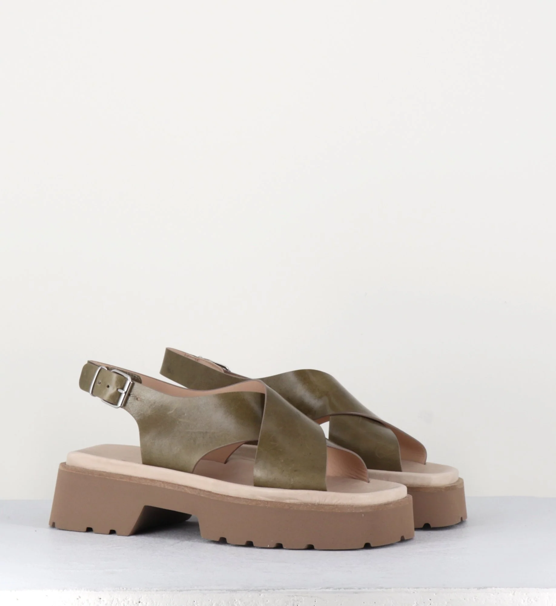 Sandales en cuir lisse khaki, larges brides croisées, bride à boucle réglable sur le côté, look 90s, bout carré, montées sur une plateforme à deux blocs ultra légère en micro-fibre à semelle légèrement crantée.