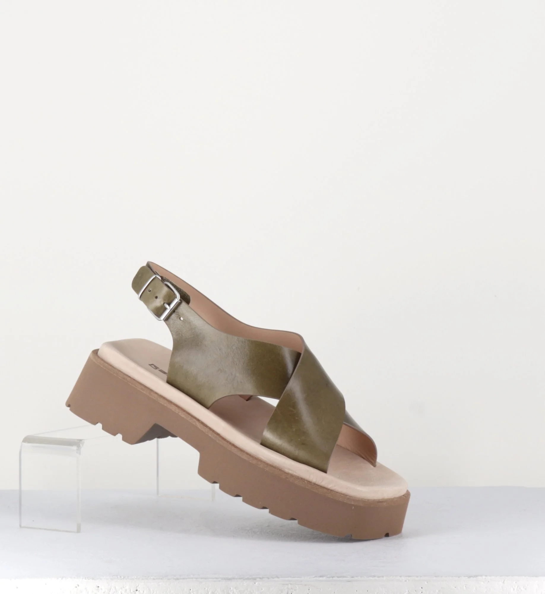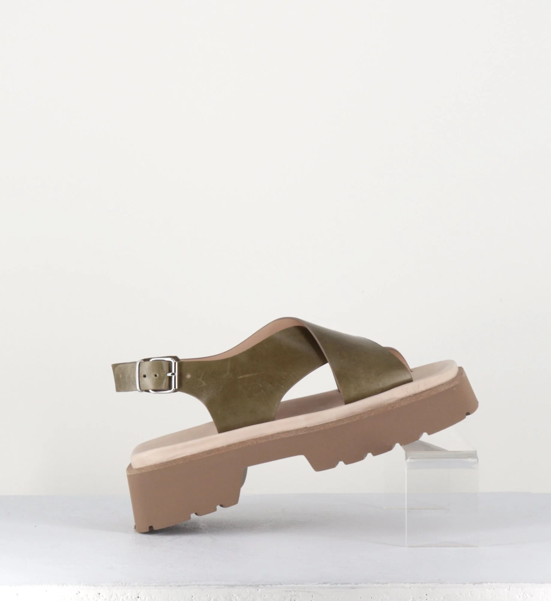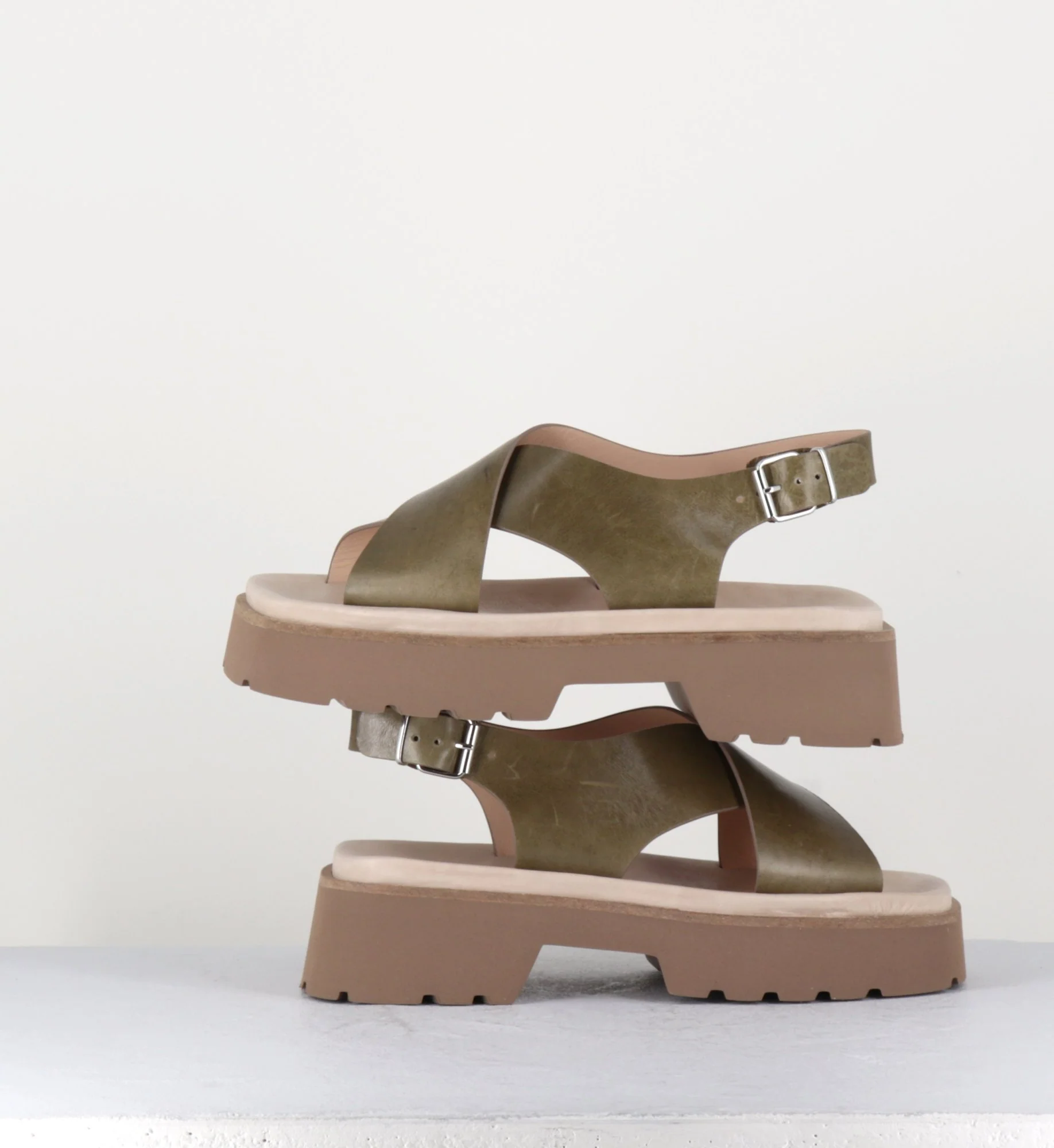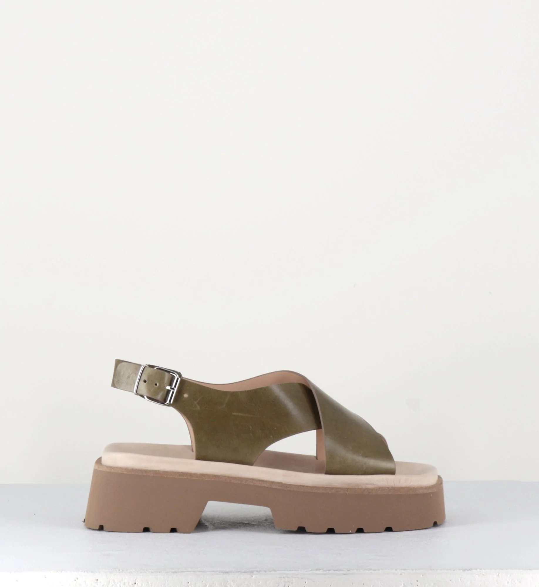 Sandales en cuir lisse khaki, larges brides croisées, bride à boucle réglable sur le côté, look 90s, bout carré, montées sur une plateforme à deux blocs ultra légère en micro-fibre à semelle légèrement crantée. Fabrication Artisanale Italienne Chausse légèrement grand.