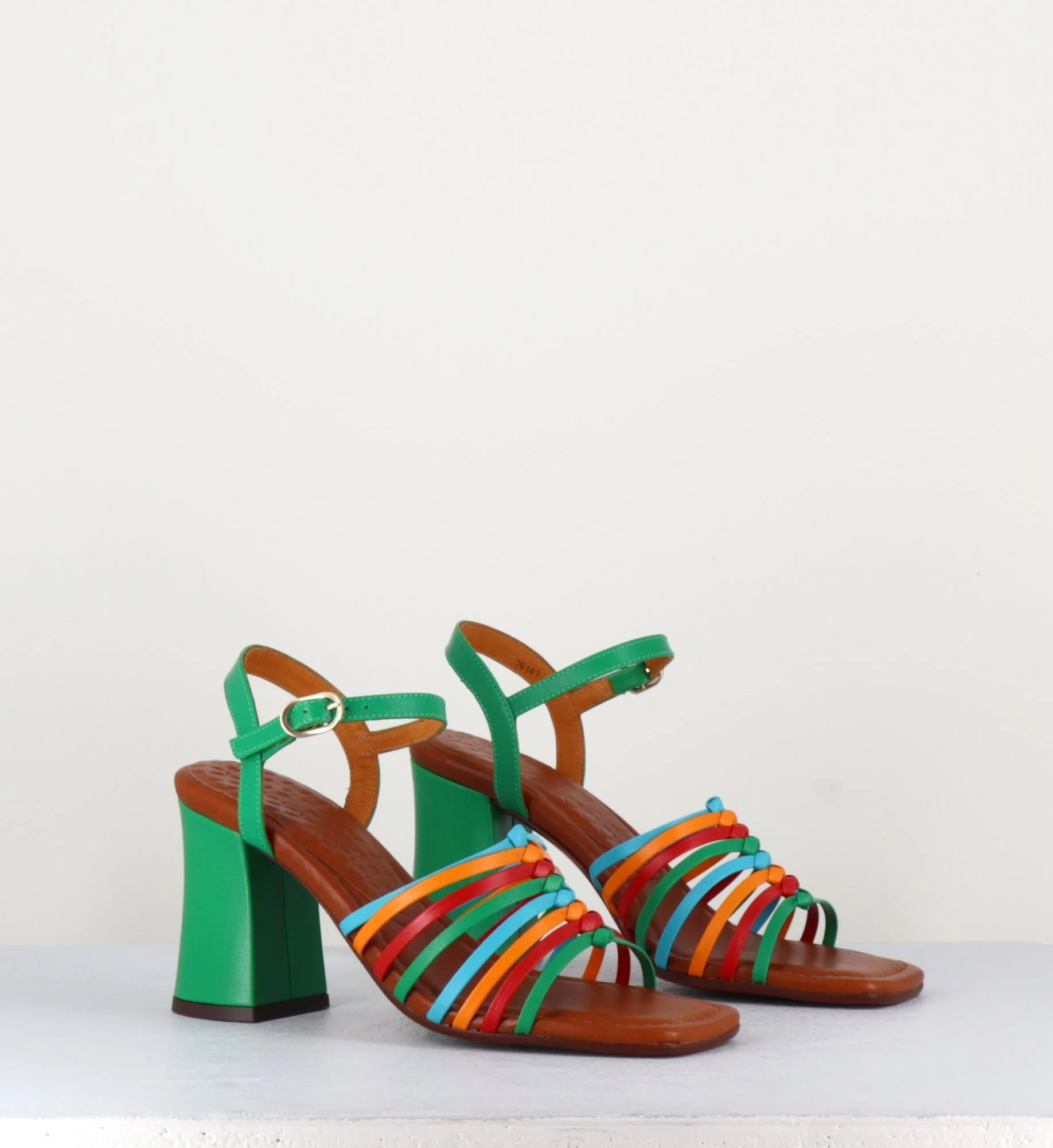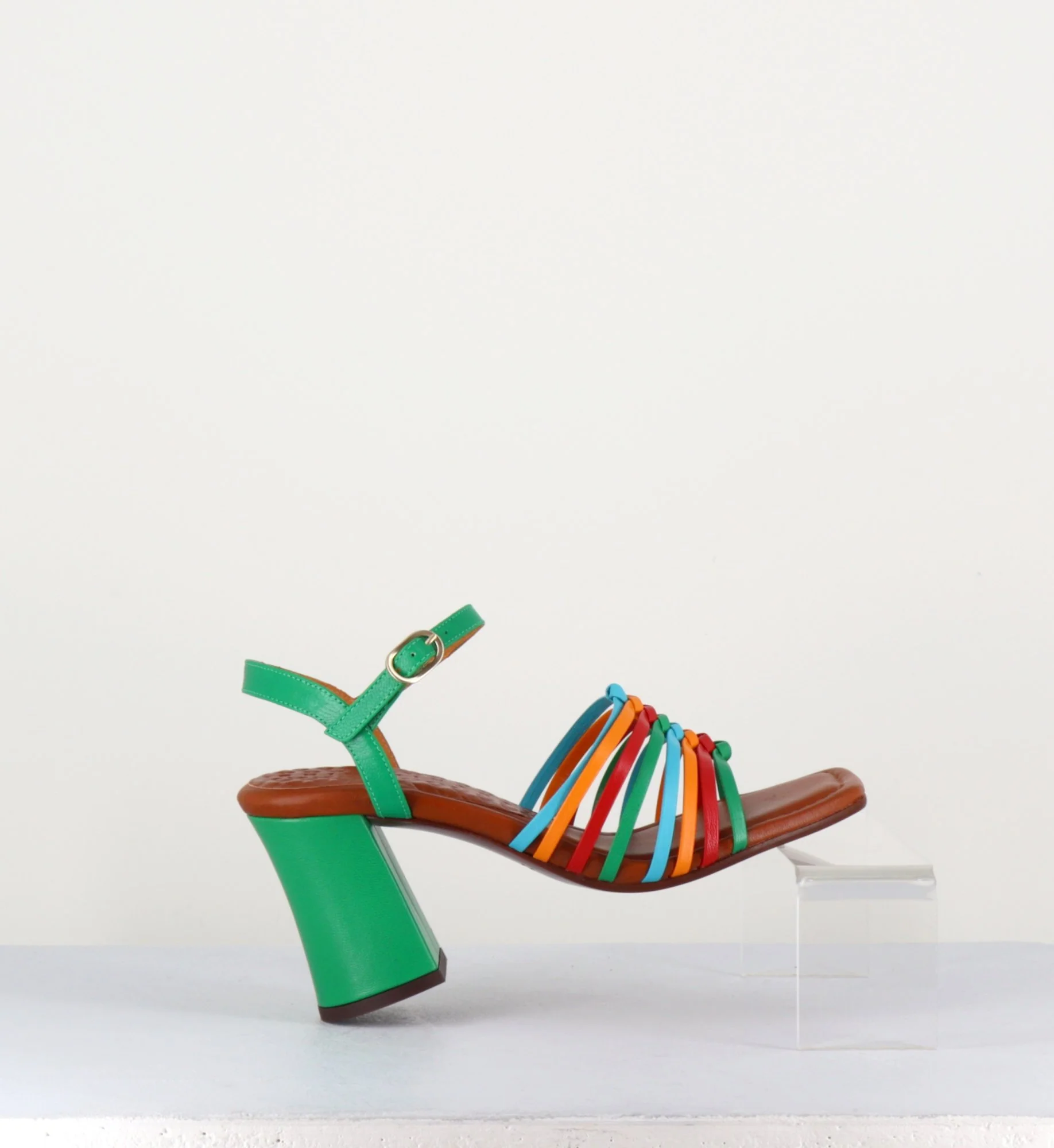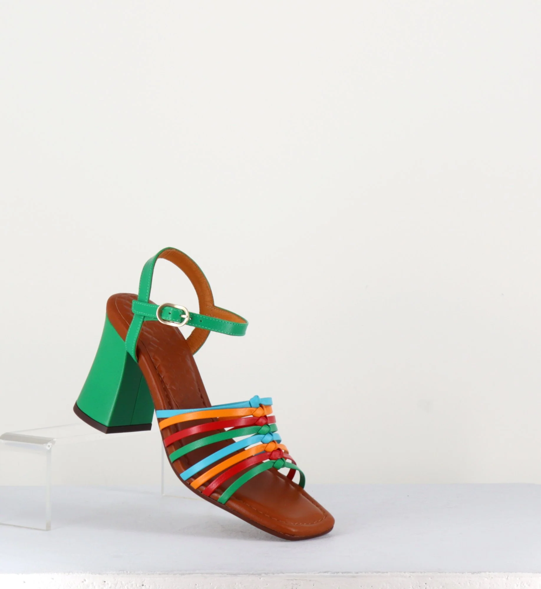 Sandales à fines brides tressées en cuir multi-color vert, rouge, orange & bleu, bout carré arrondi, bride réglable à la cheville, montées sur un talon légèrement évasé recouvert de cuir métallisé rose. Fabrication Artisanale Espagnole – Ateliers Chie Mihara Chausse légèrement grand