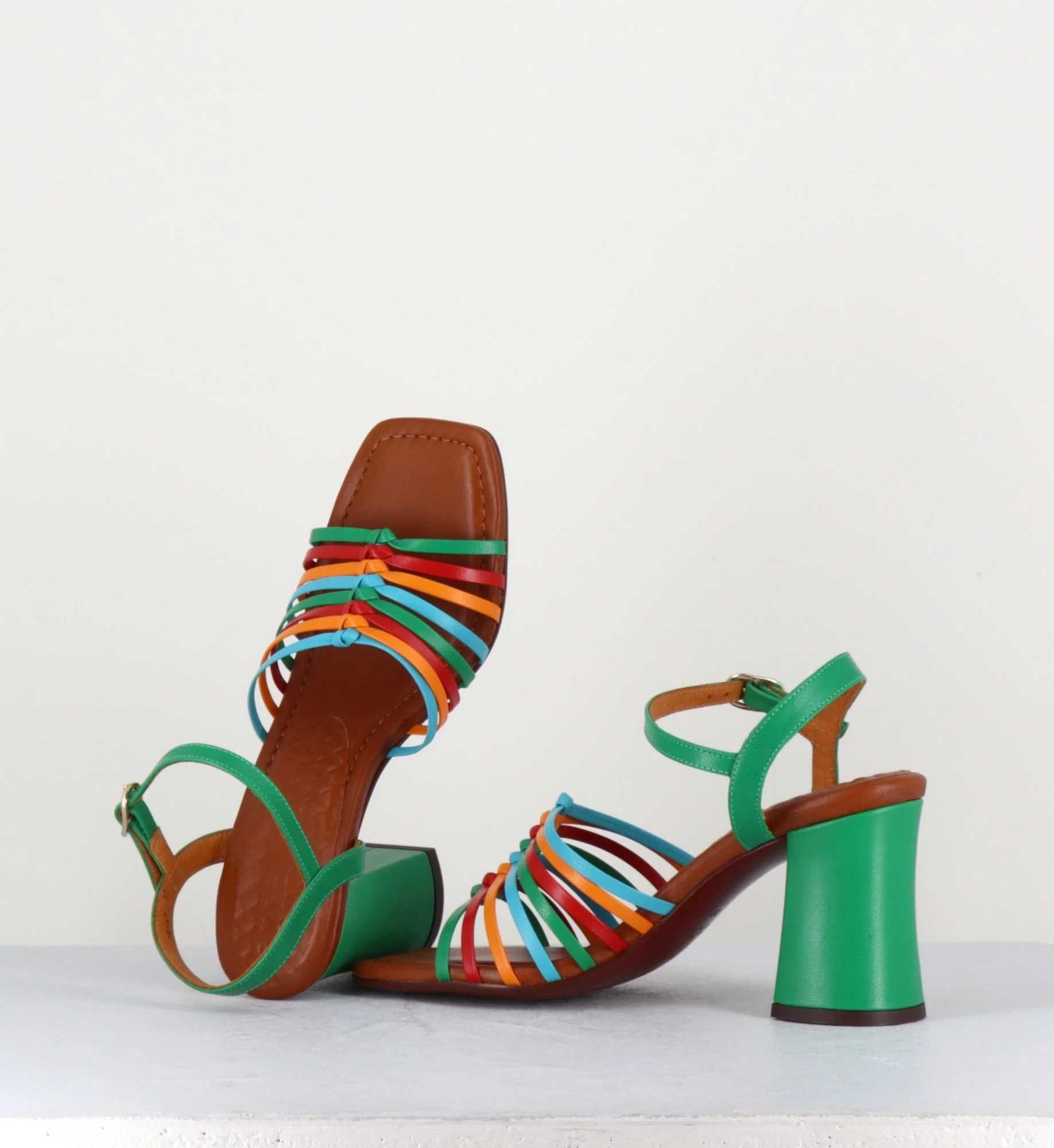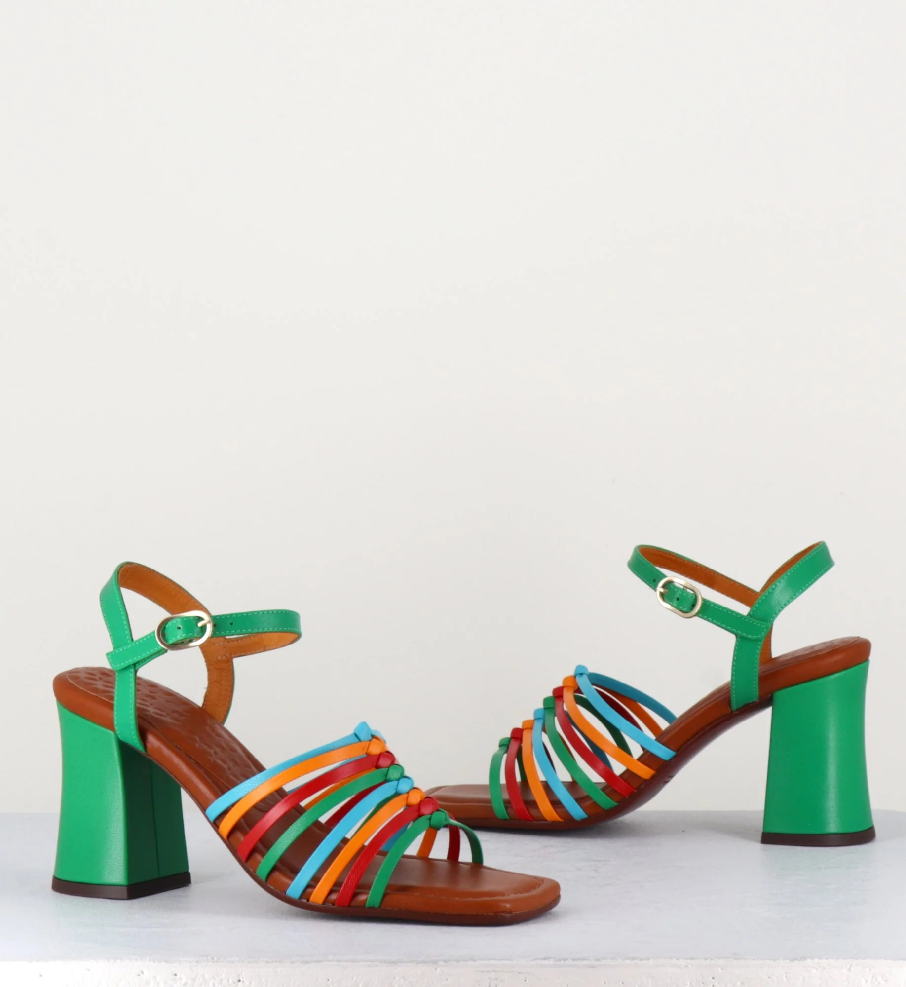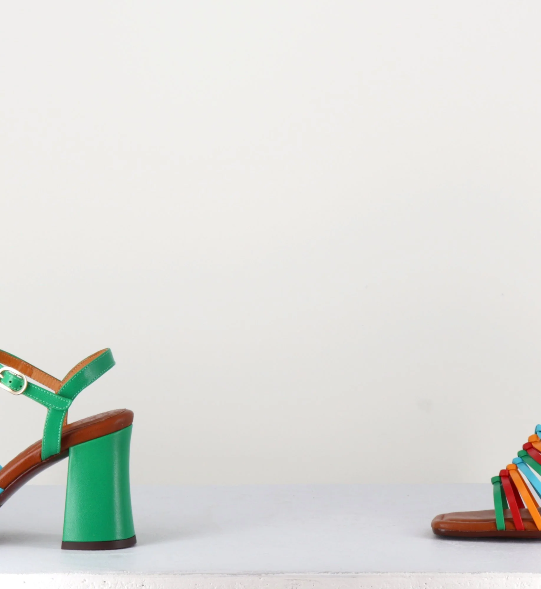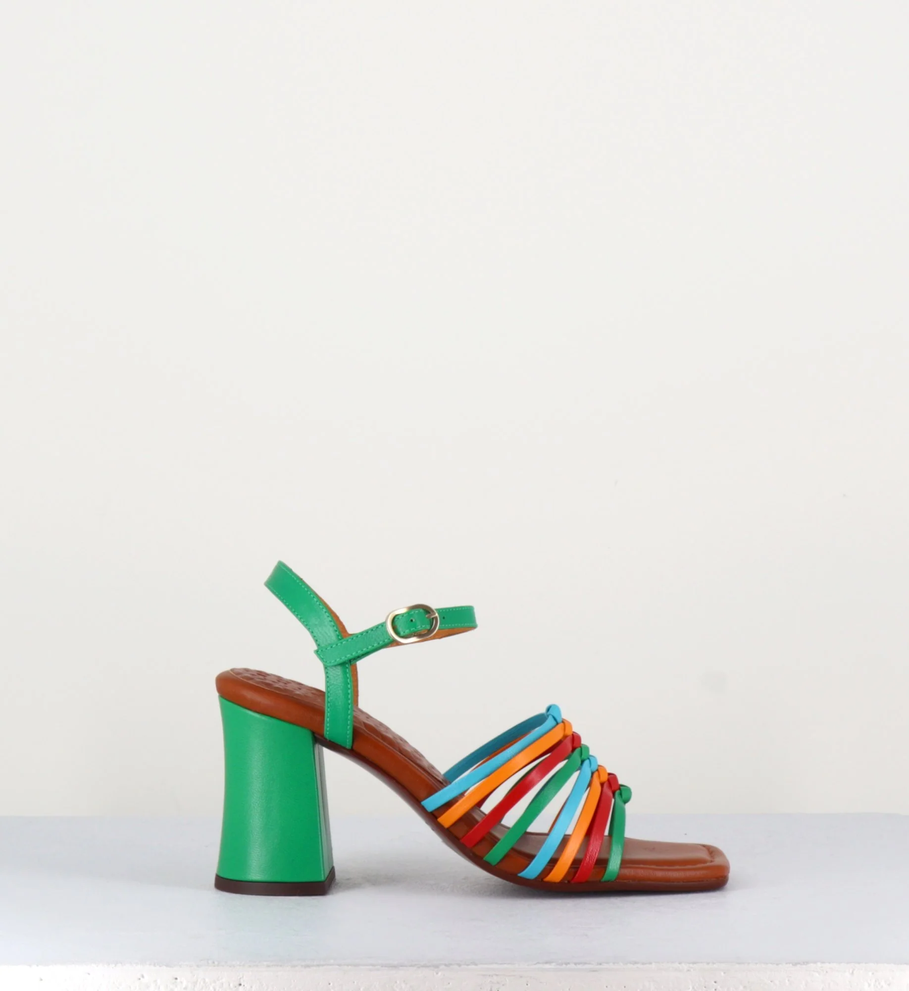 Sandales à fines brides tressées en cuir multi-color vert, rouge, orange & bleu, bout carré arrondi, bride réglable à la cheville, montées sur un talon légèrement évasé recouvert de cuir métallisé rose. Fabrication Artisanale Espagnole – Ateliers Chie Mihara Chausse légèrement grand
