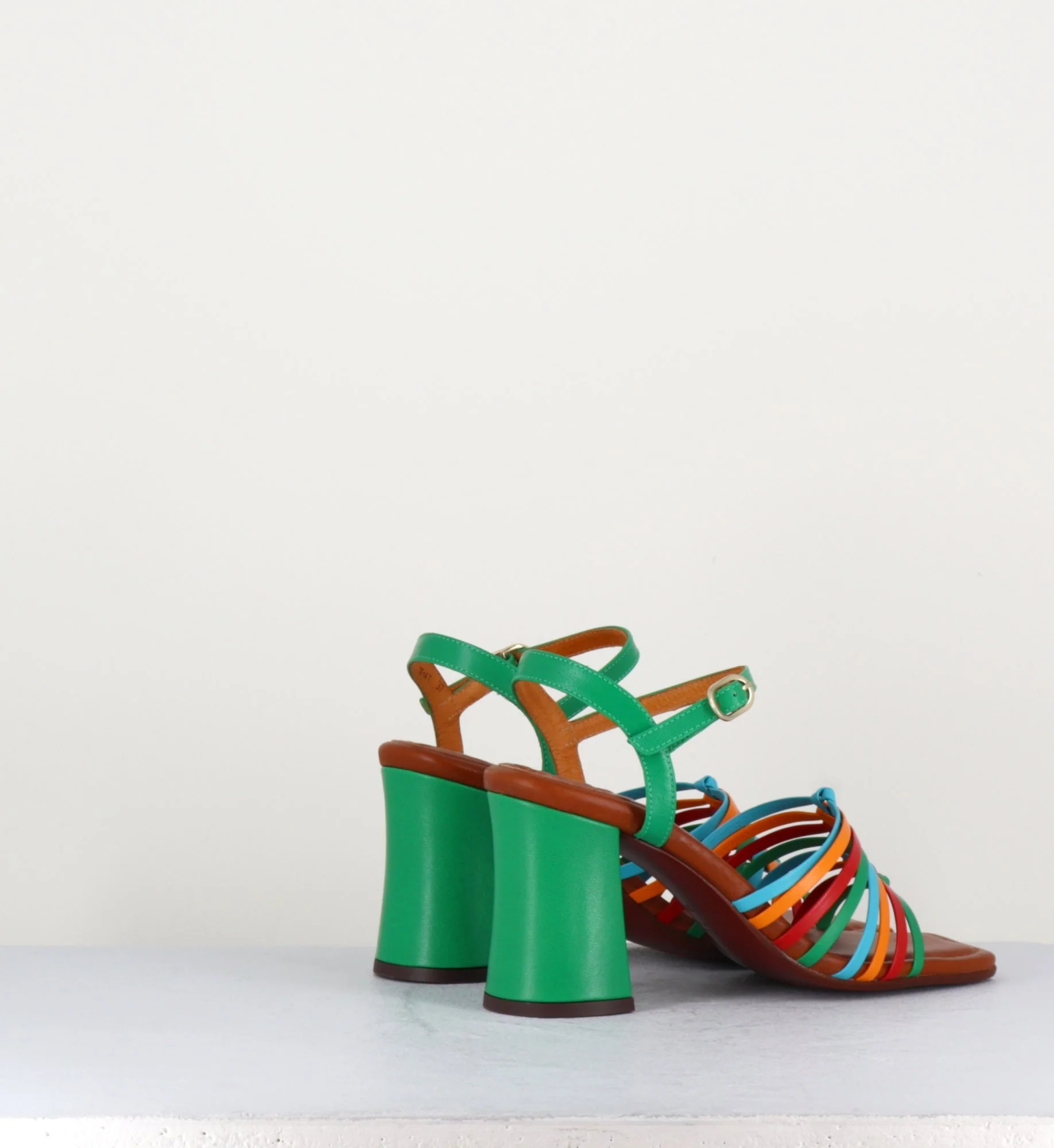Sandales à fines brides tressées en cuir multi-color vert, rouge, orange & bleu, bout carré arrondi, bride réglable à la cheville, montées sur un talon légèrement évasé recouvert de cuir métallisé rose.
