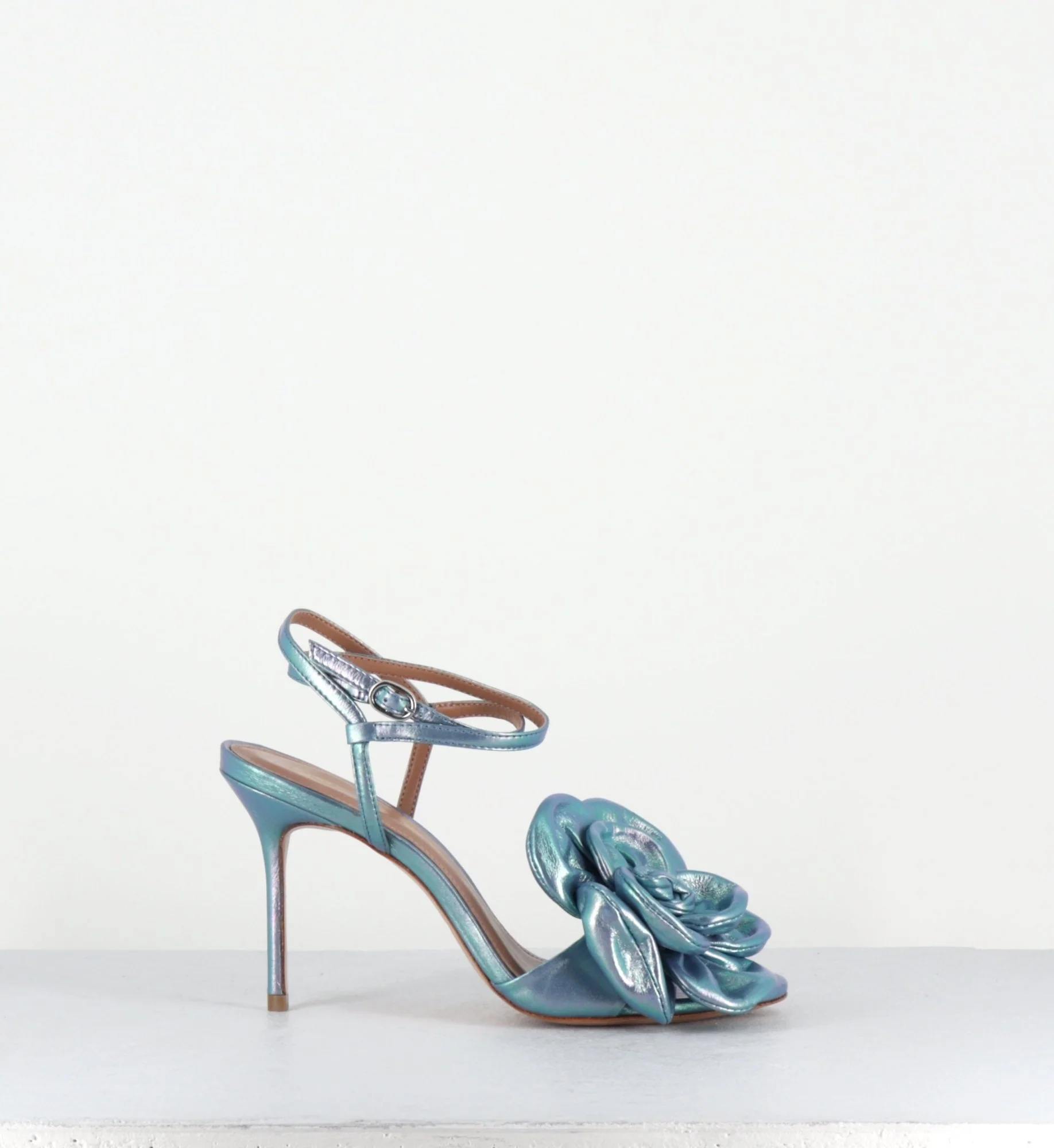 Sandales en cuir irisé bleu avec grosse fleur cousue à l’avant qui habille le pied, montées sur un haut talon fin, brides cheville double tour réglable, inspiré des lignes du début des années 2000