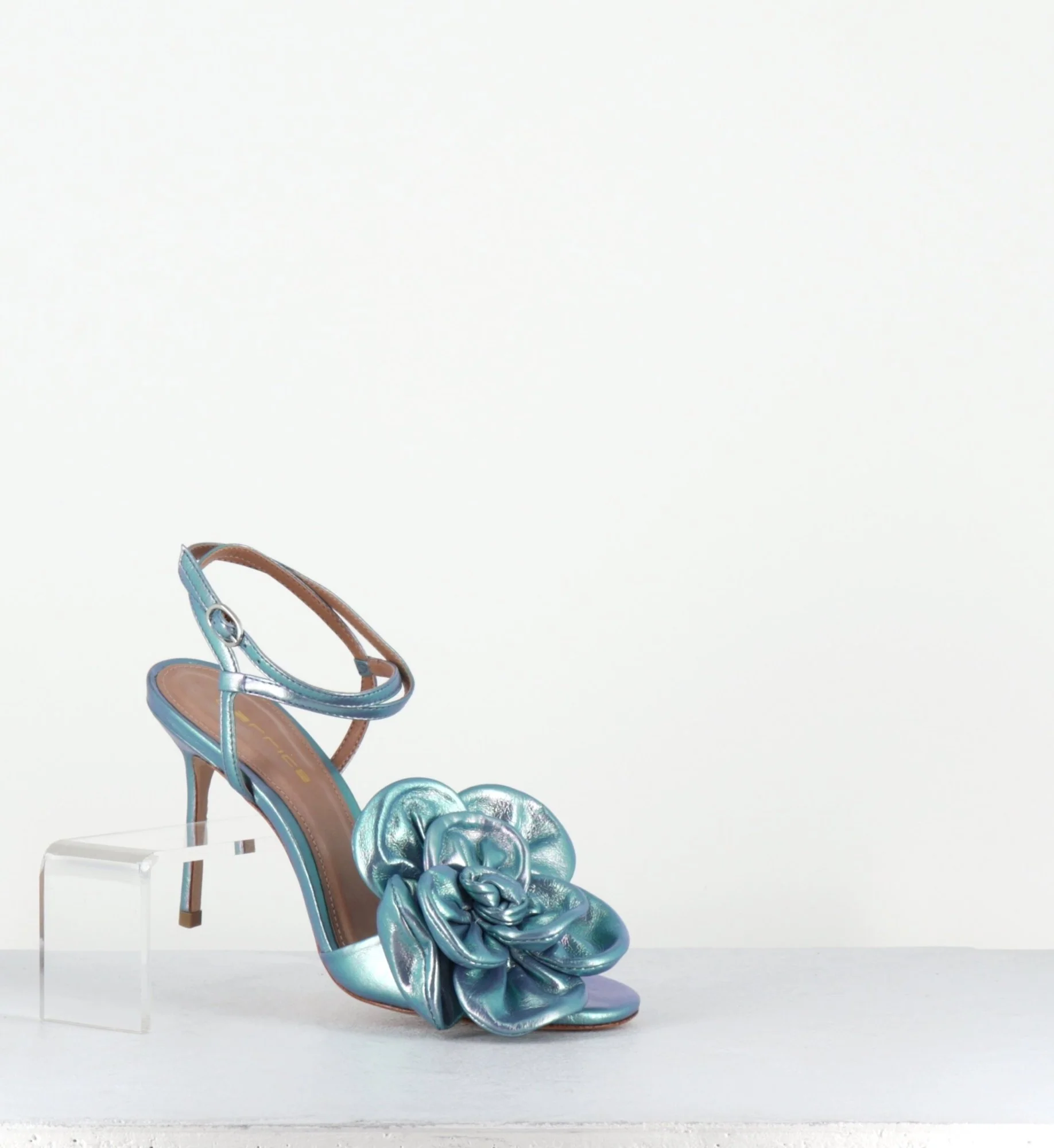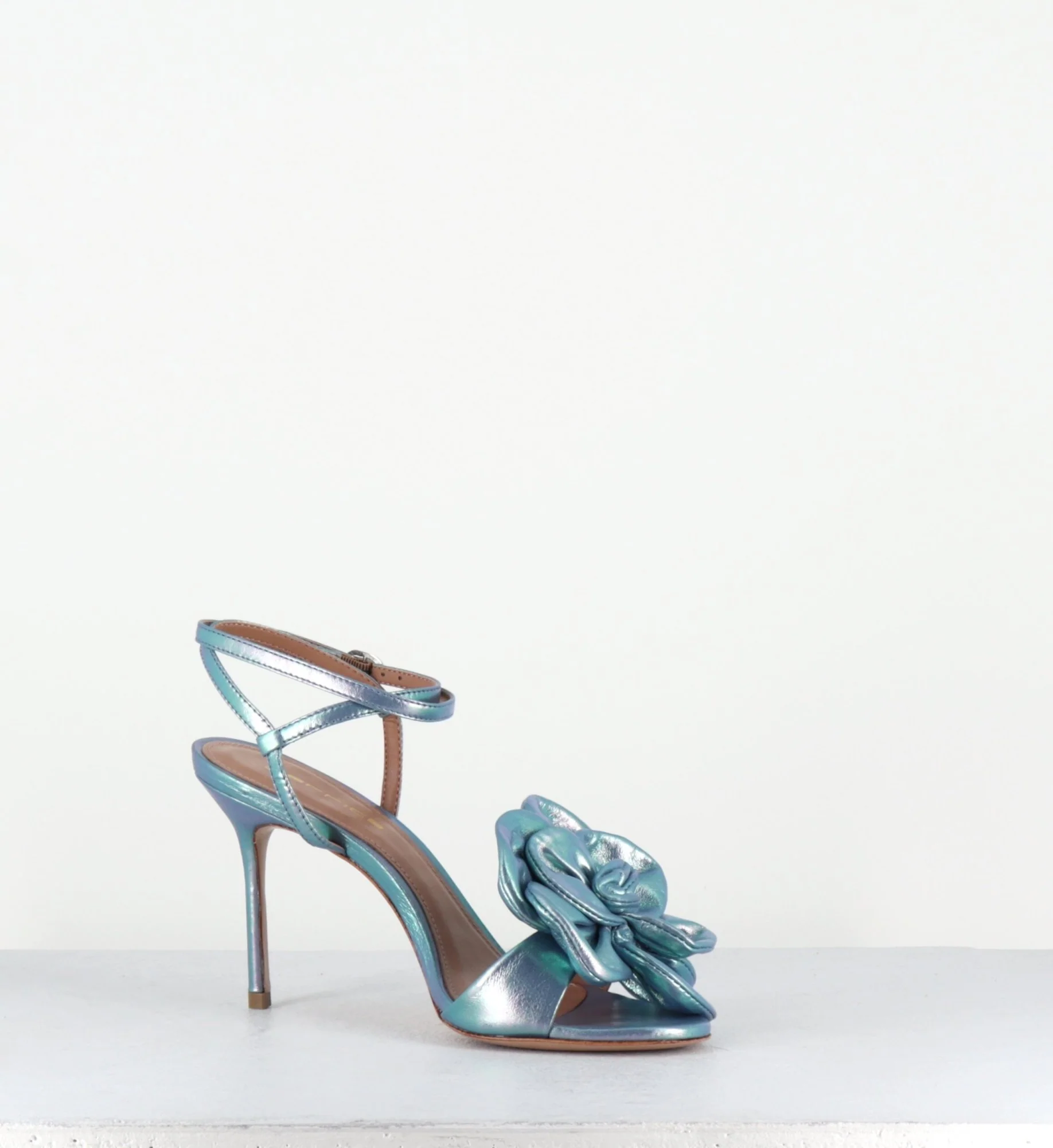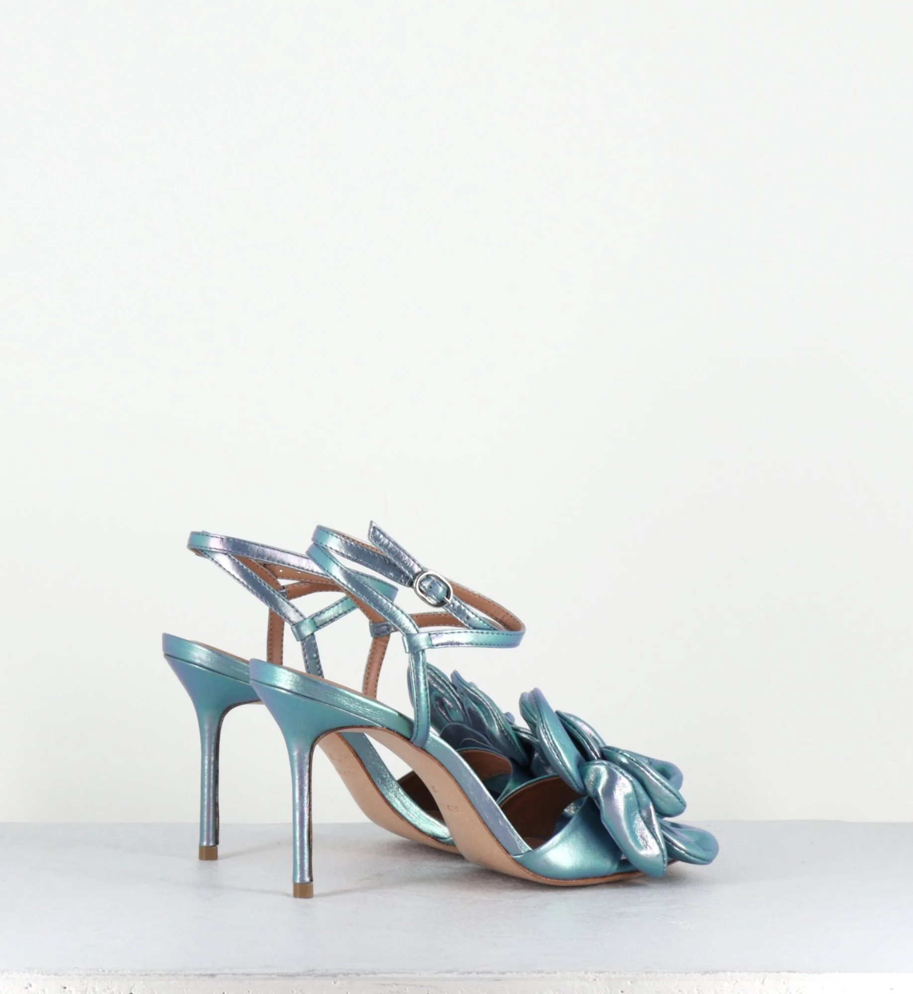 Sandales à fleur en cuir irisé bleu talon haut – TANO PEARL BLUE