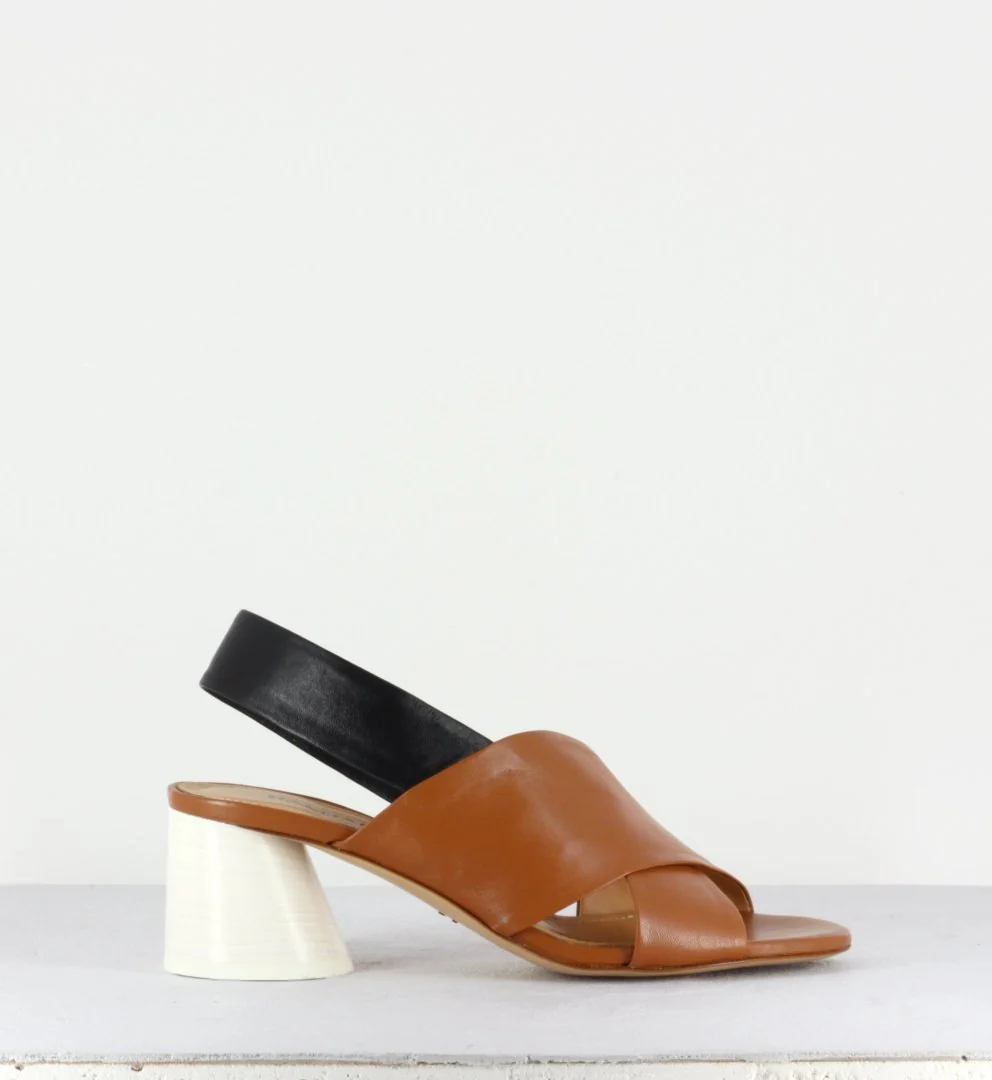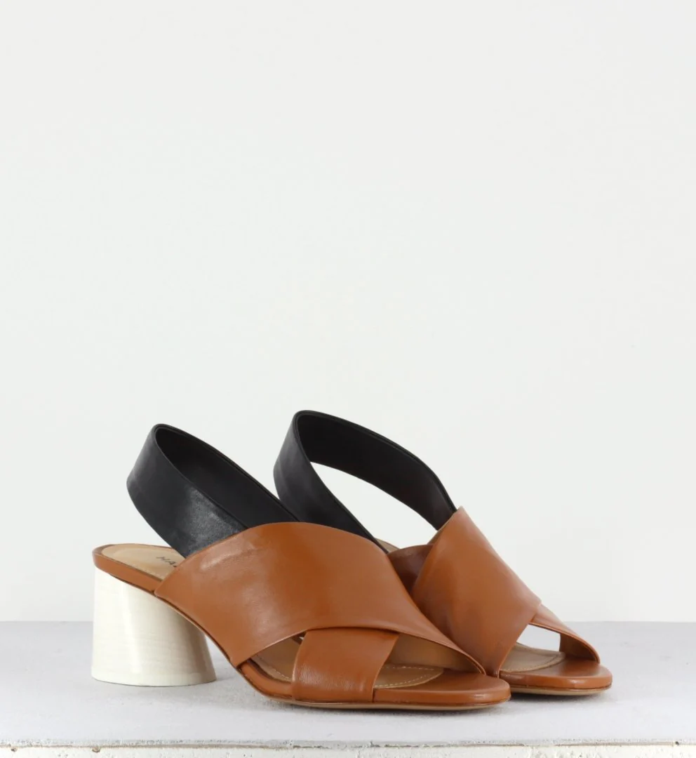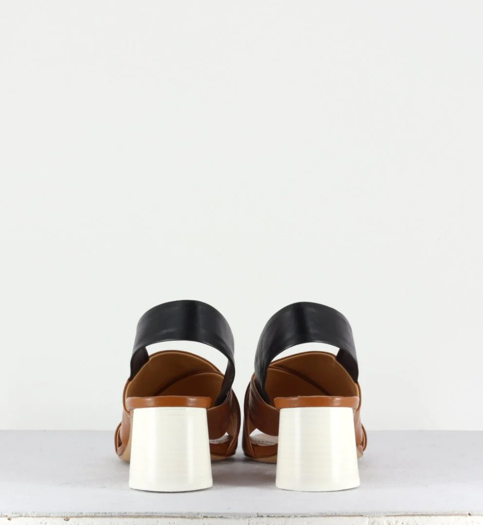 Sandales en cuir camel à talon structuré blanc et bride arrière noir à bout arrondi des ateliers Italiens Halmanera.